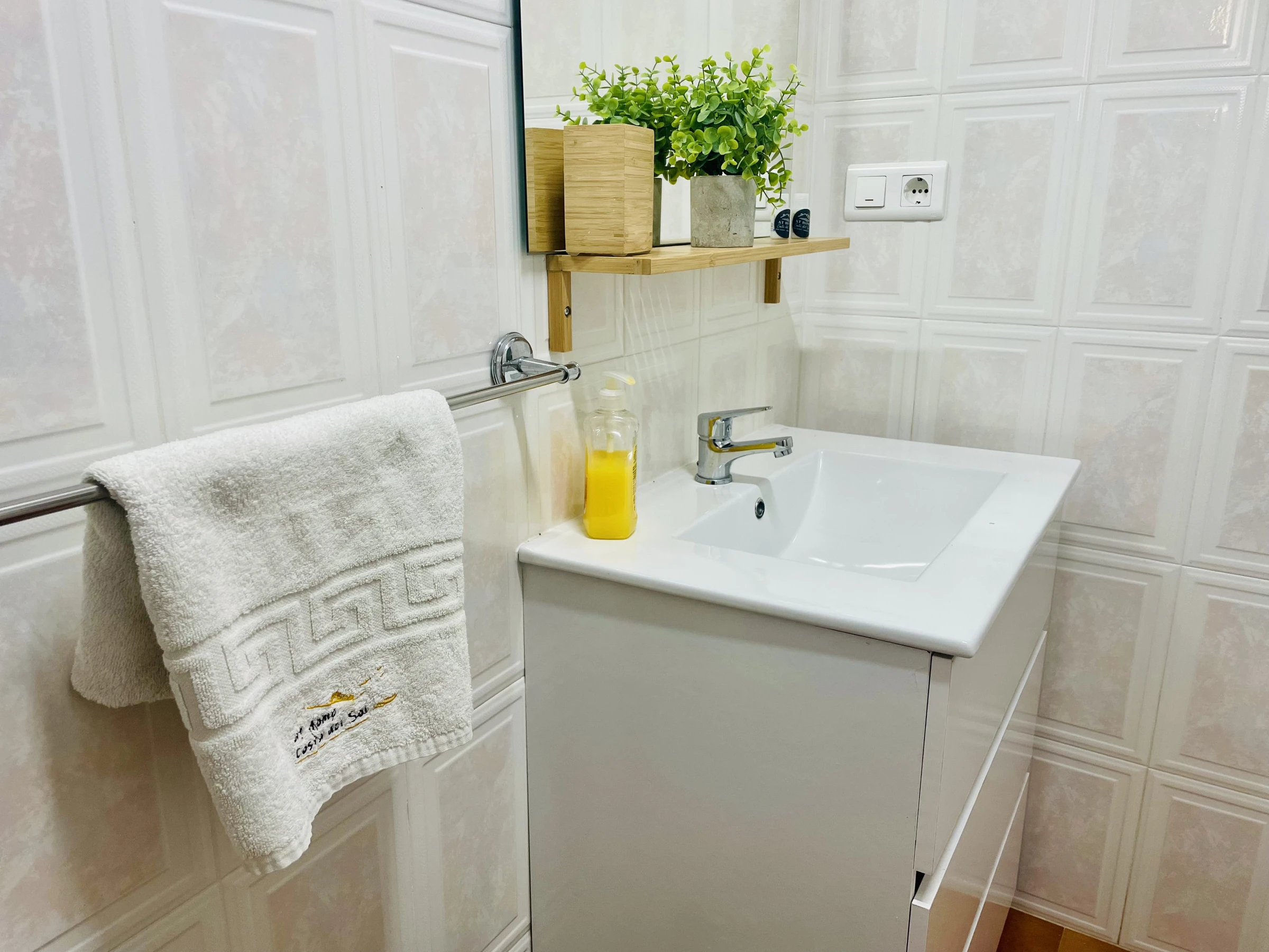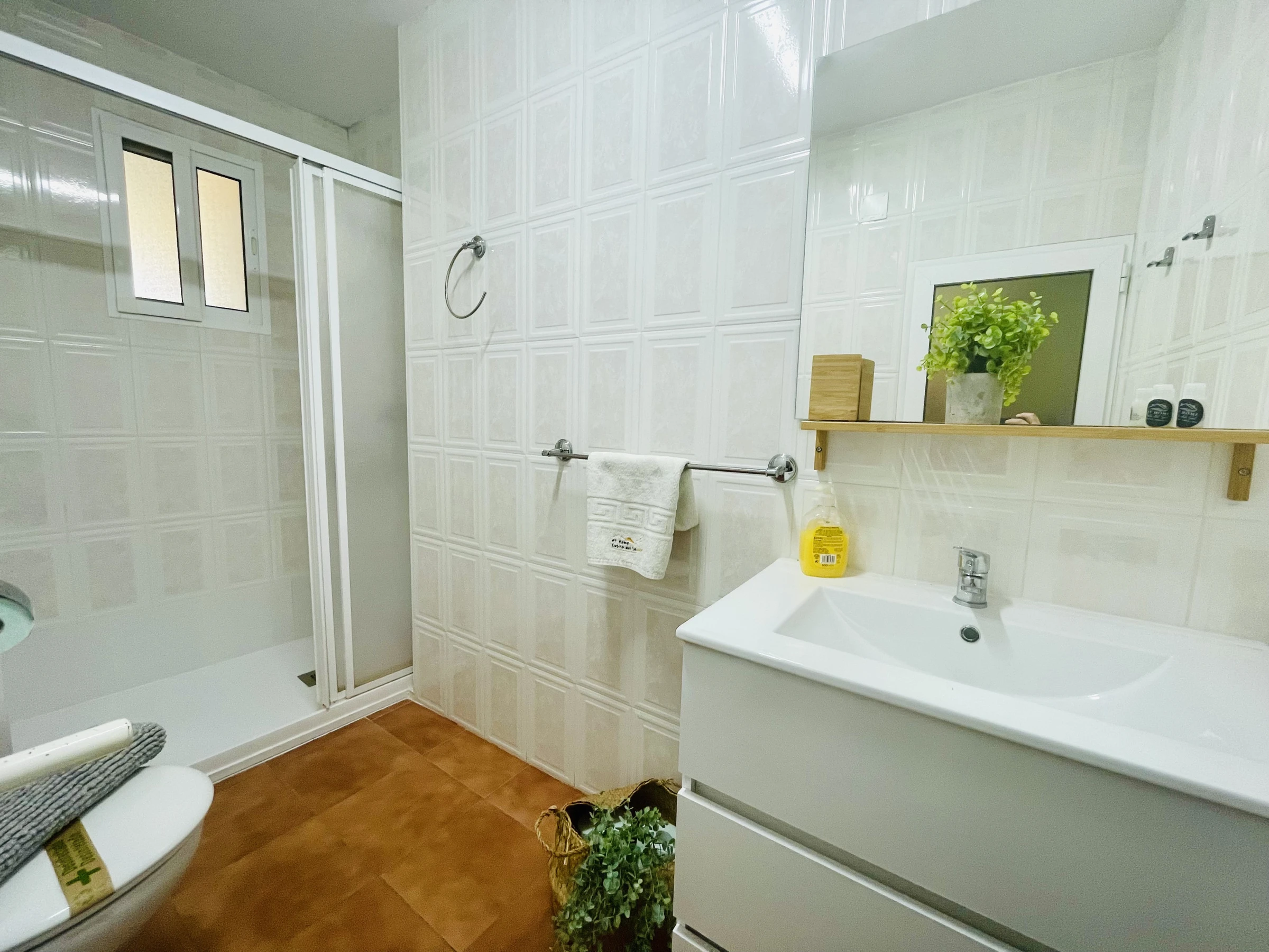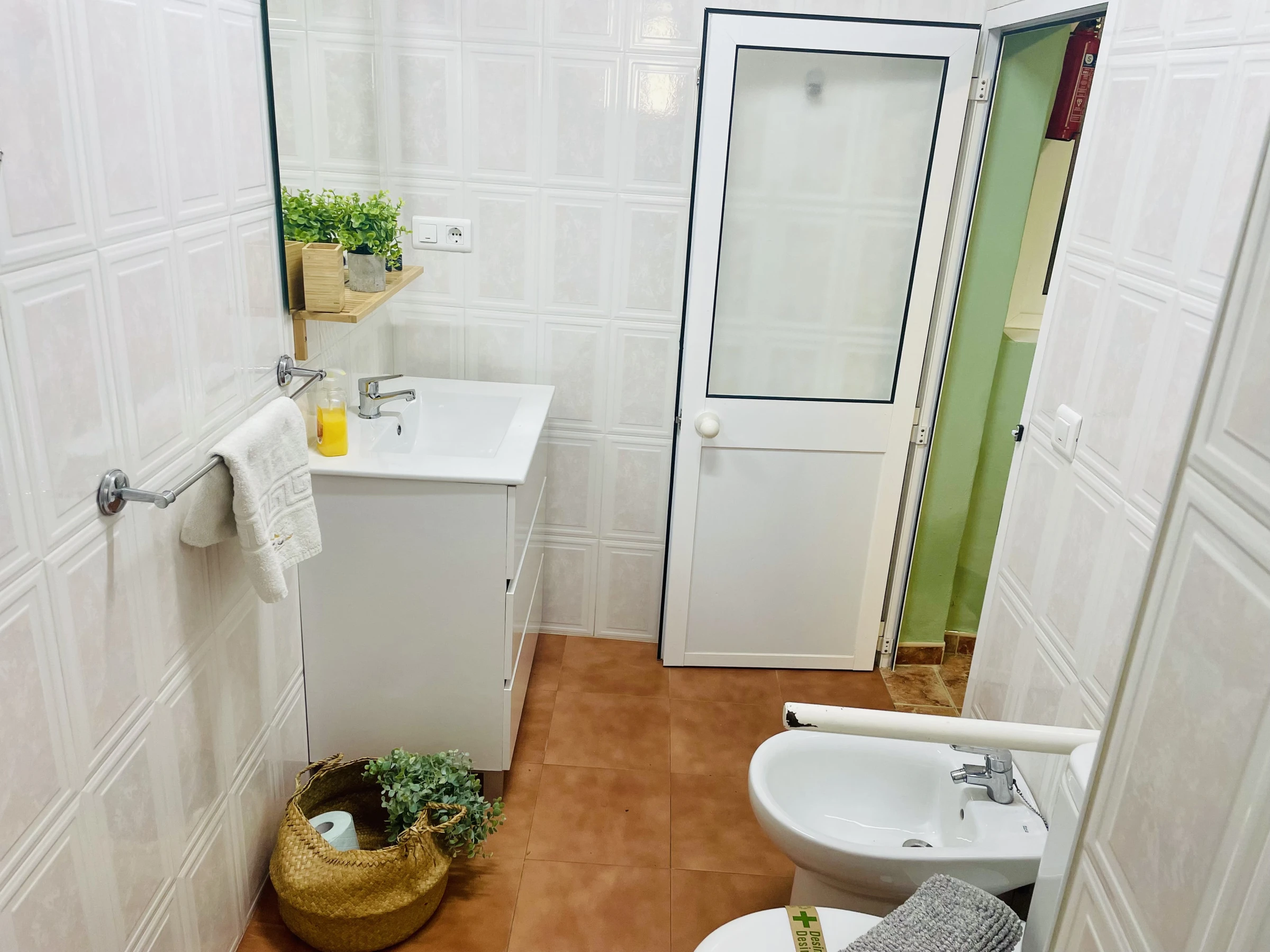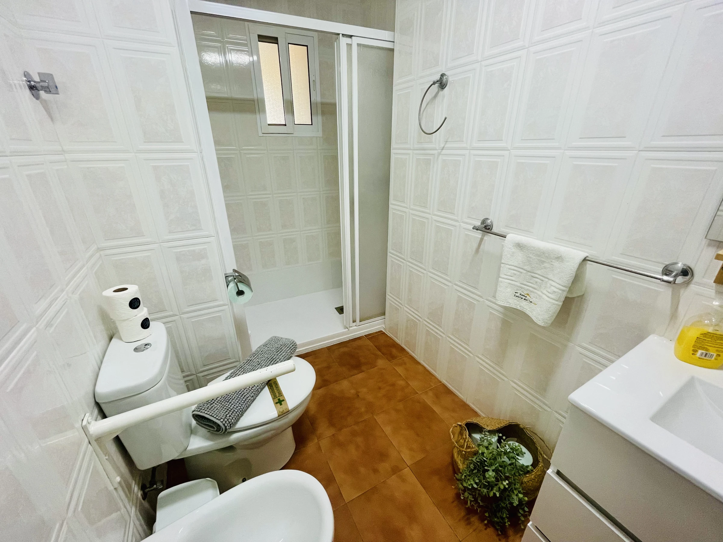 La salle de bain est complète, avec douche, bidet et WC.