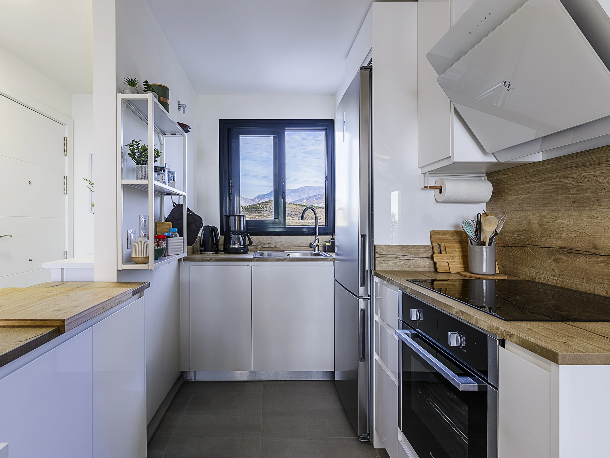 La cuisine américaine, à vitrocéramique, est équipée avec réfrigérateur, micro-ondes, four, congélateur, lave-vaisselle, vaisselle/couverts, ustensiles/cuisine, cafetière, grille pain et bouilloire.