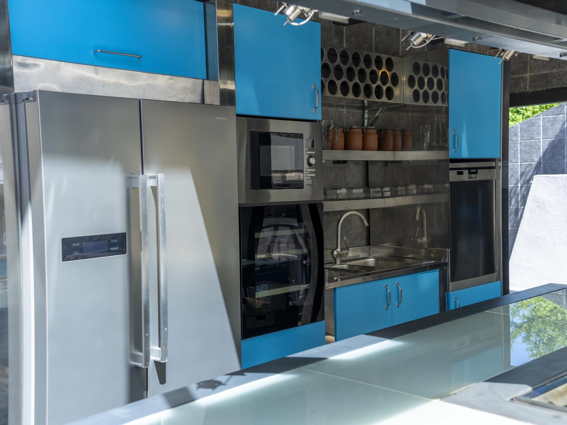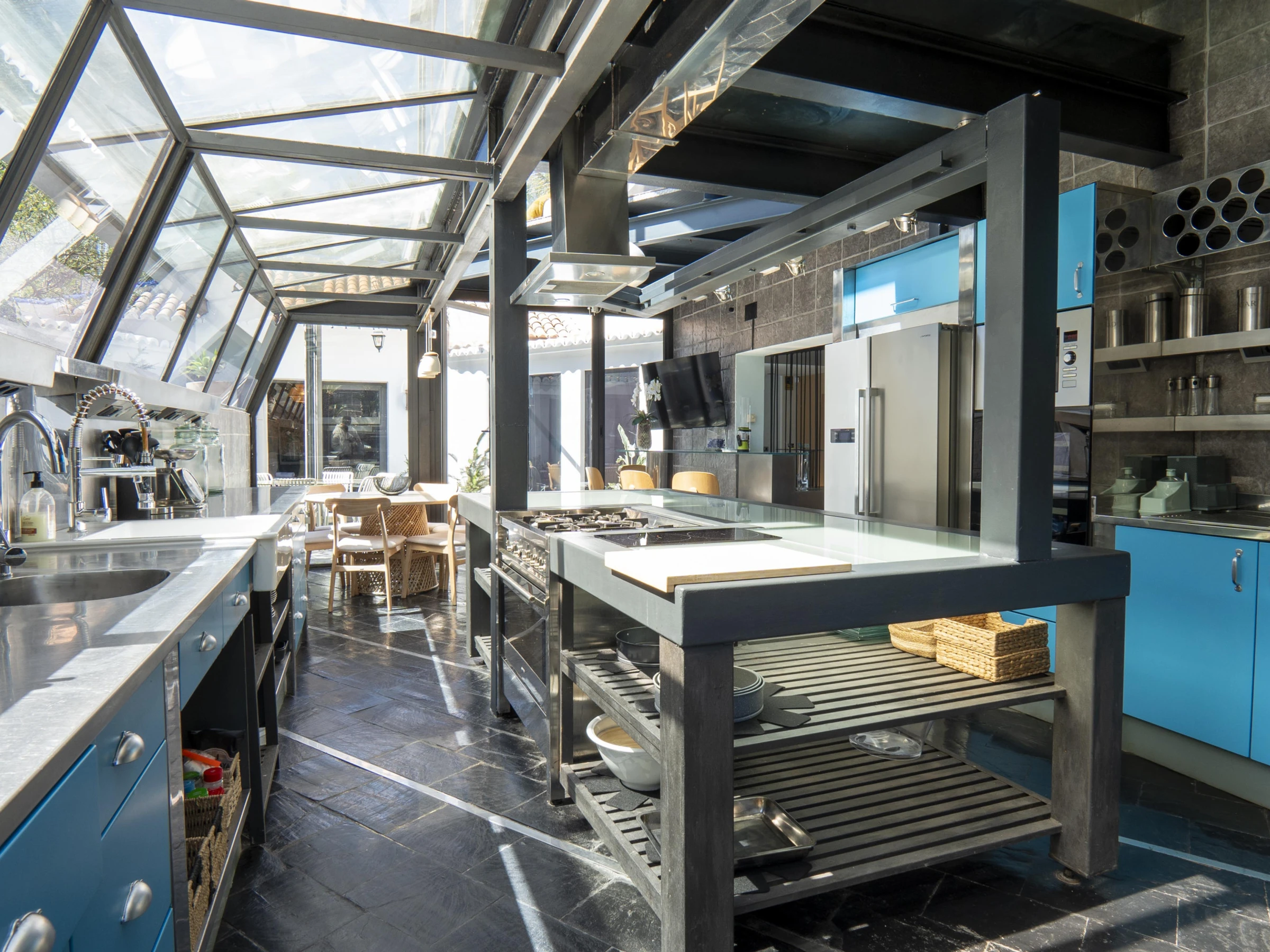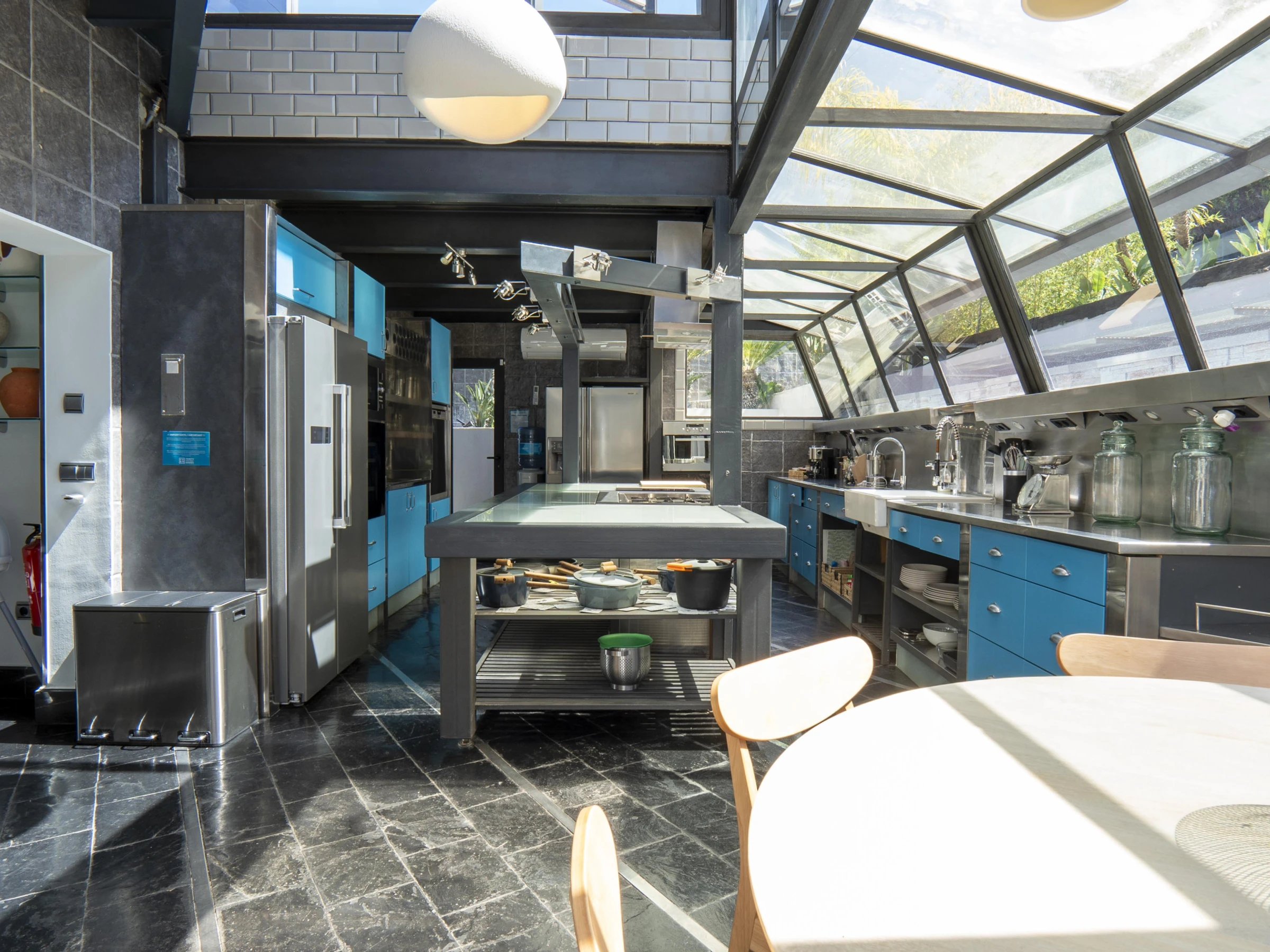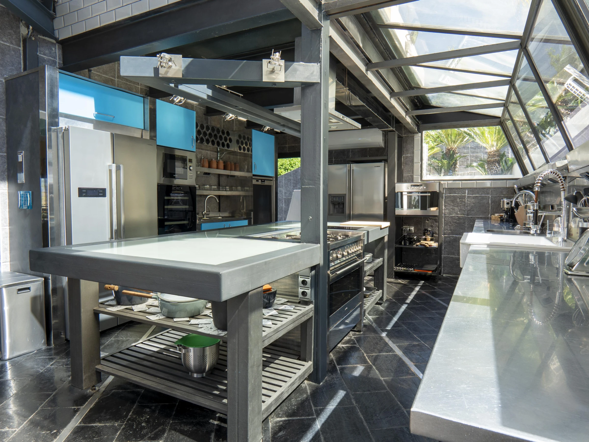- Cuisine professionnelle avec four et plaque de cuisson industrielle, baies vitrées donnant sur l'extérieur