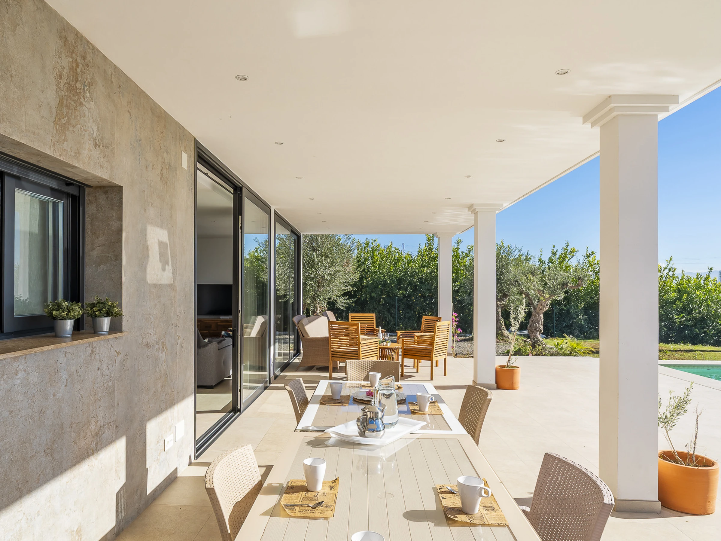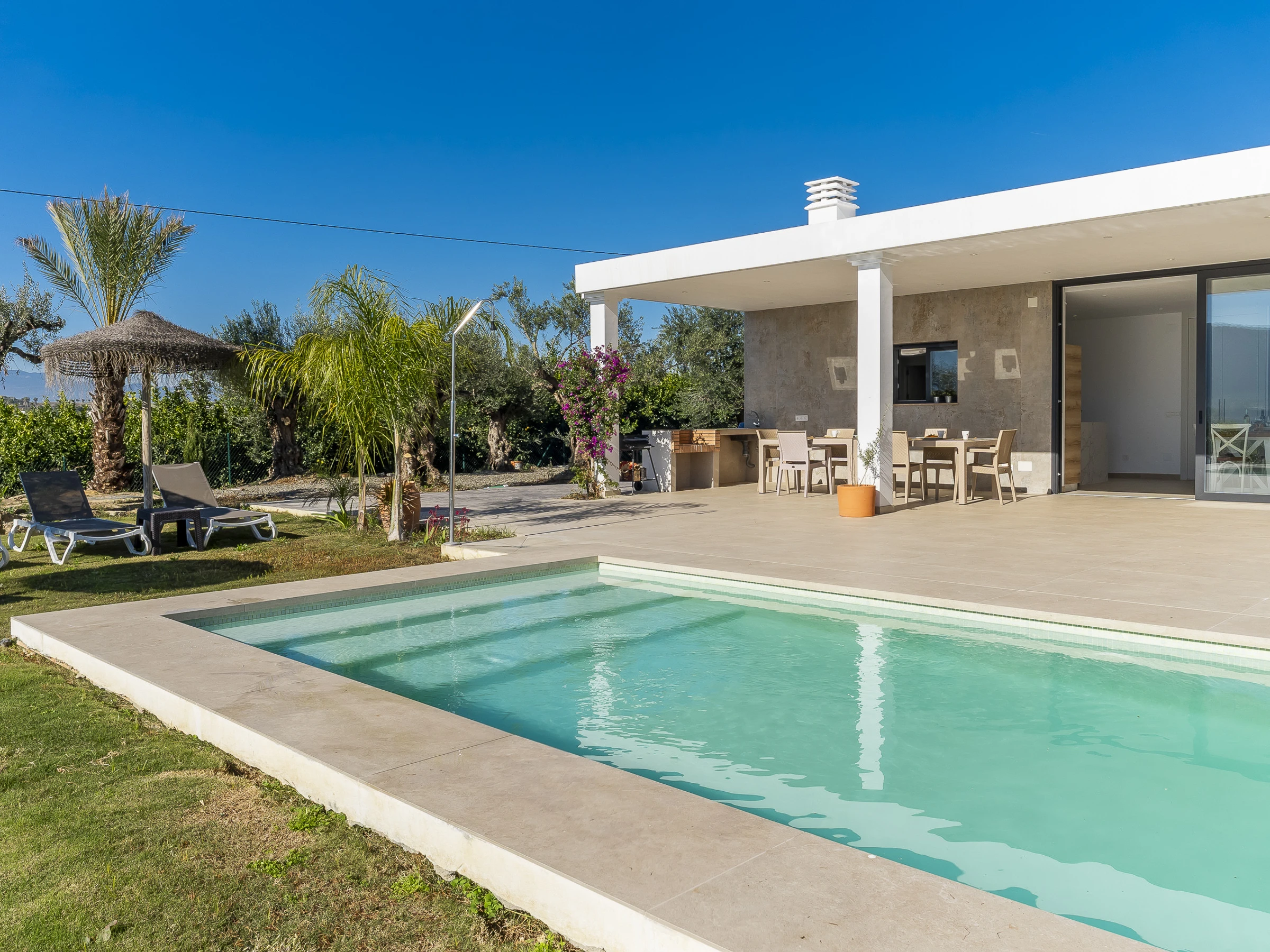 À l'extérieur, la piscine privée entourée de gazon naturel et une zone couverte avec du mobilier pour profiter de l'air libre sont le cadre parfait pour se détendre et se déconnecter. De plus, le jardin offre un espace idéal pour les enfants et les moments de loisirs en famille.