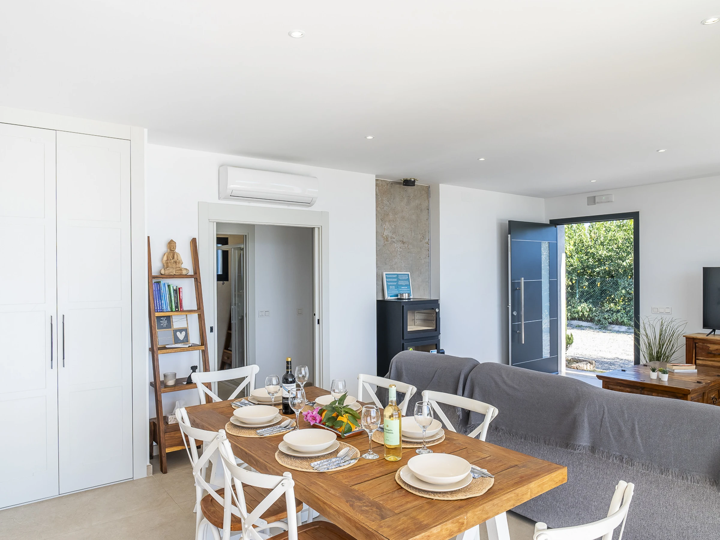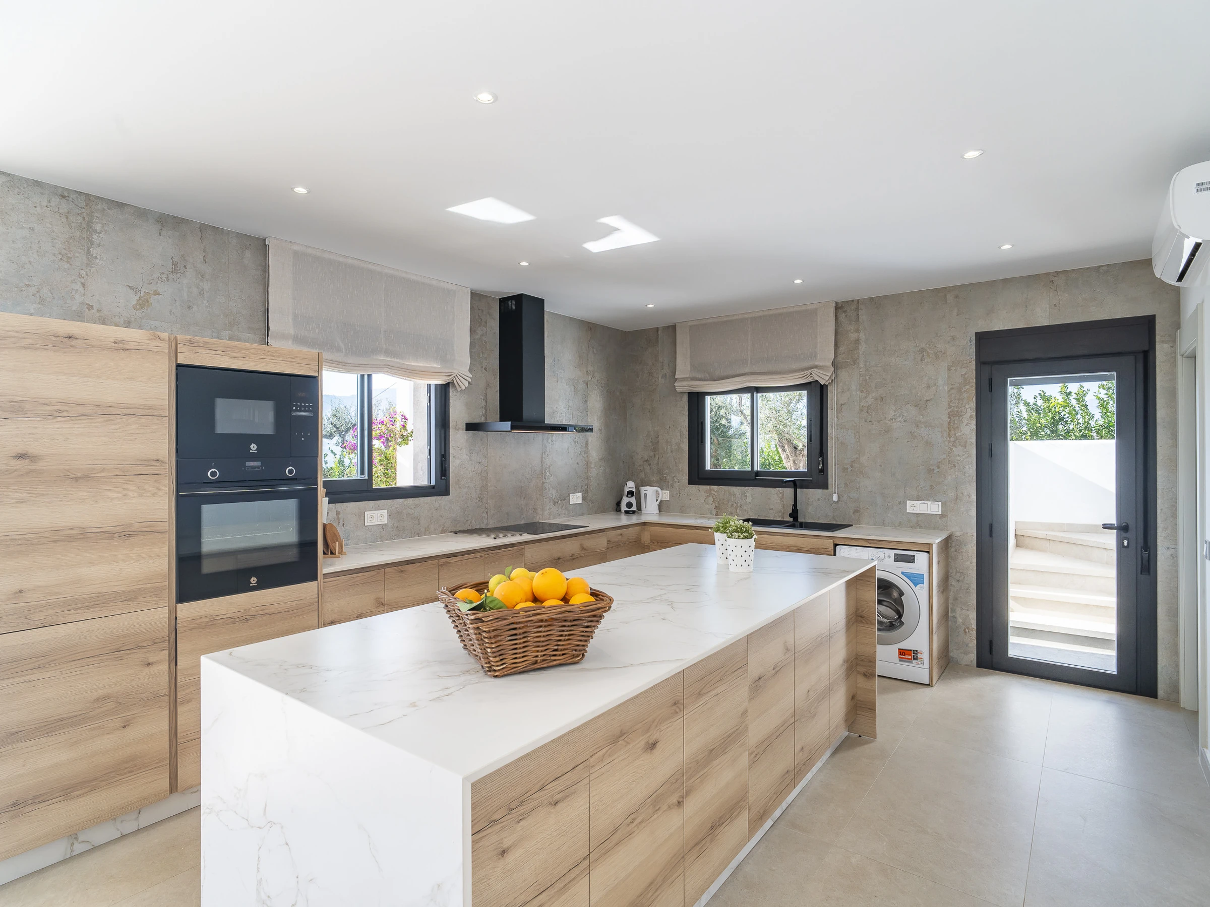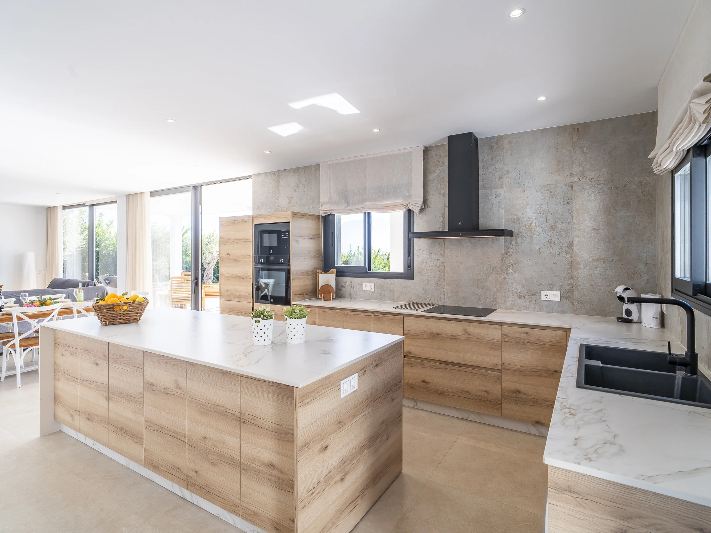 L'intérieur dispose d'un grand salon-salle à manger avec une cuisine américaine entièrement équipée, comprenant des appareils électroménagers modernes et un îlot central, parfait pour partager des moments tout en profitant de la vue. La maison est équipée de la climatisation dans toutes les pièces pour votre confort maximal.
