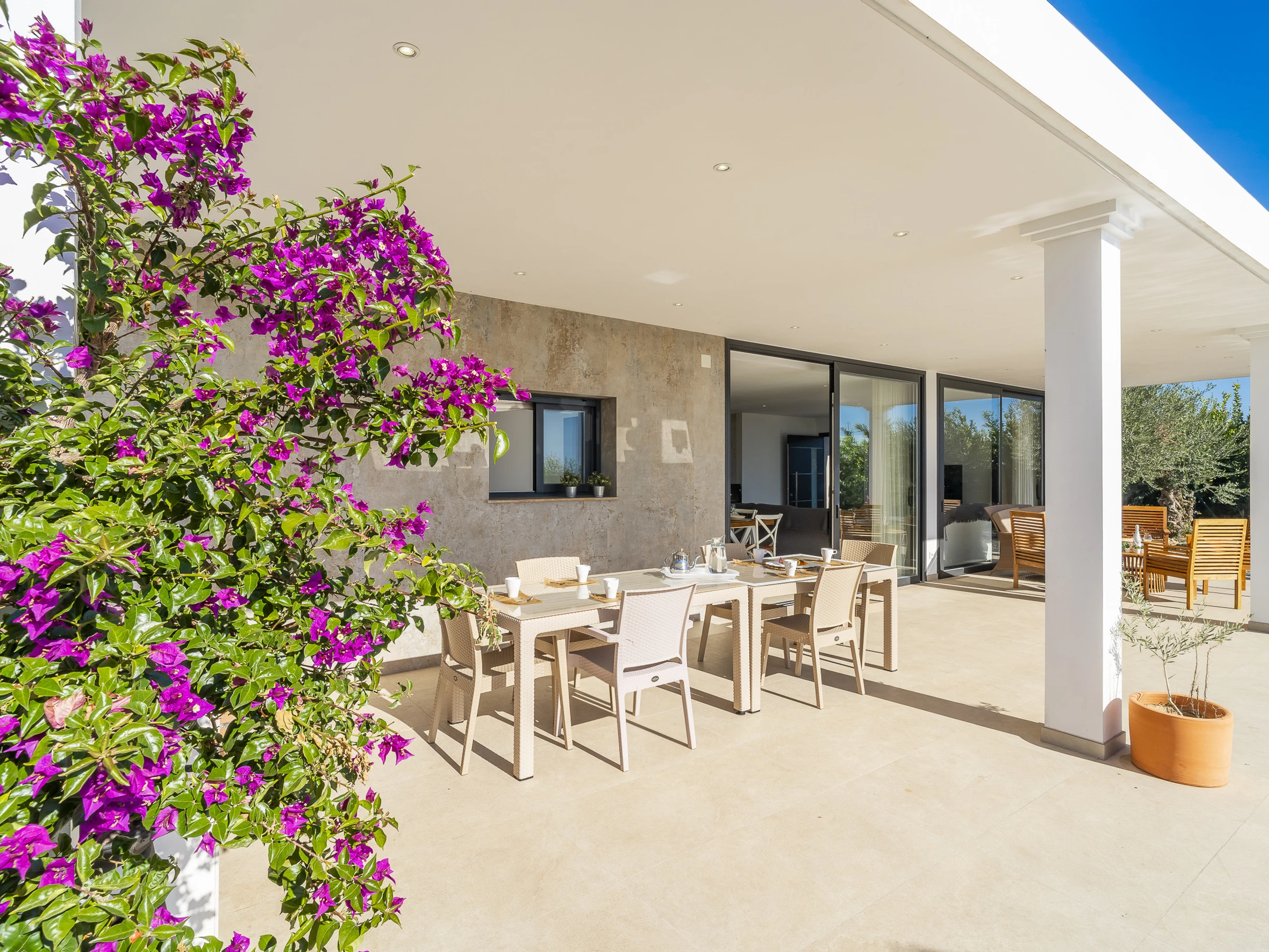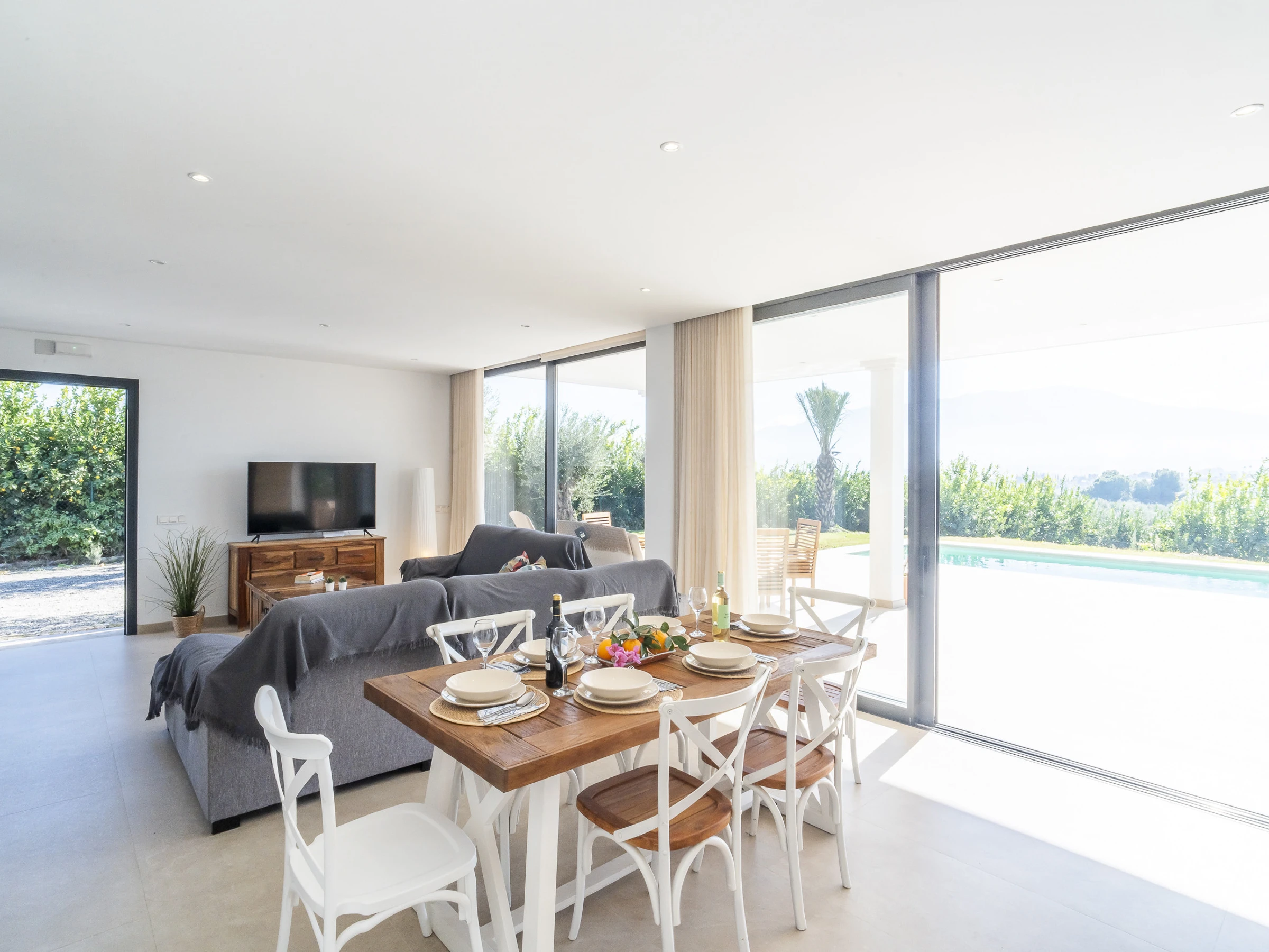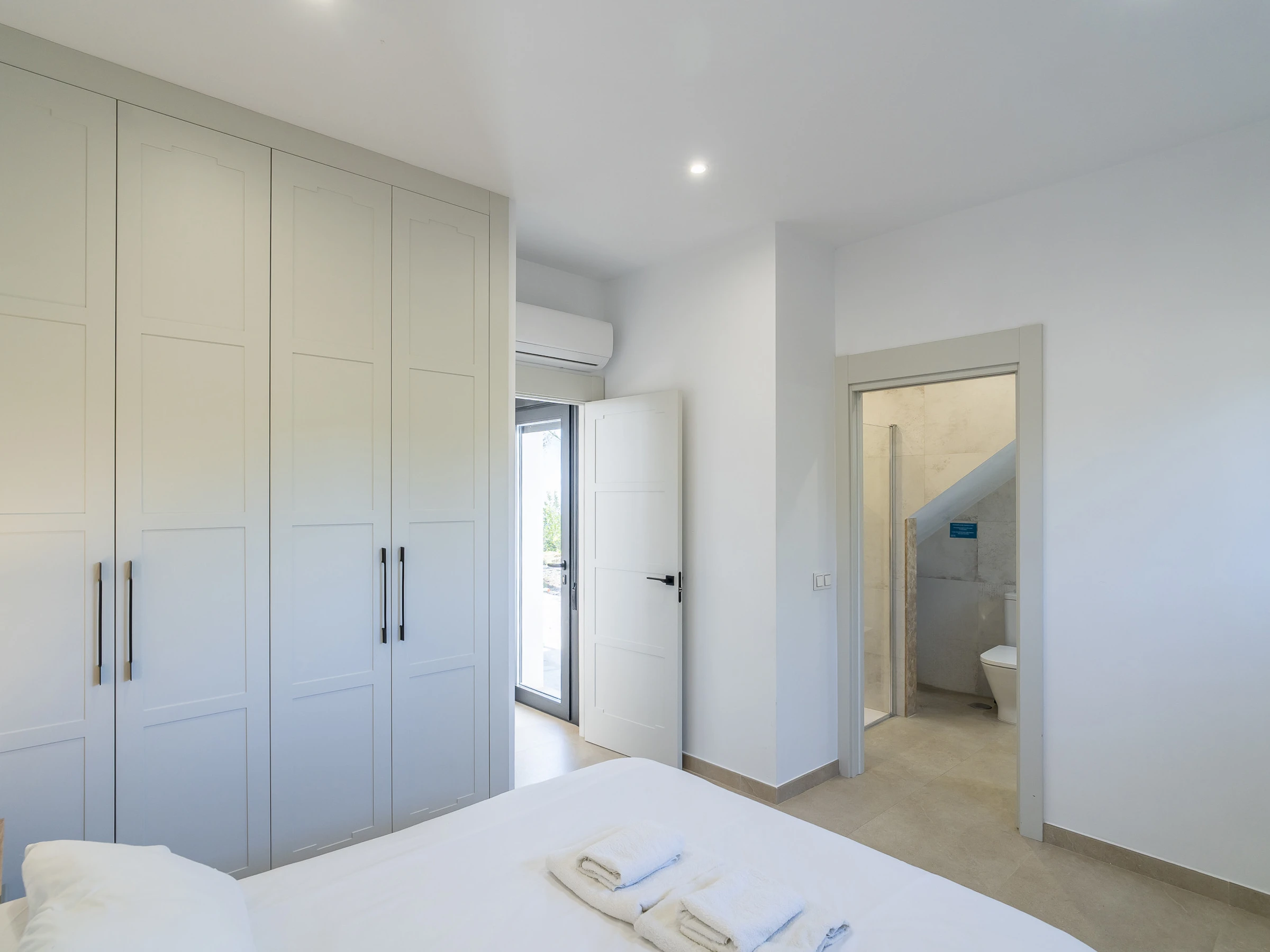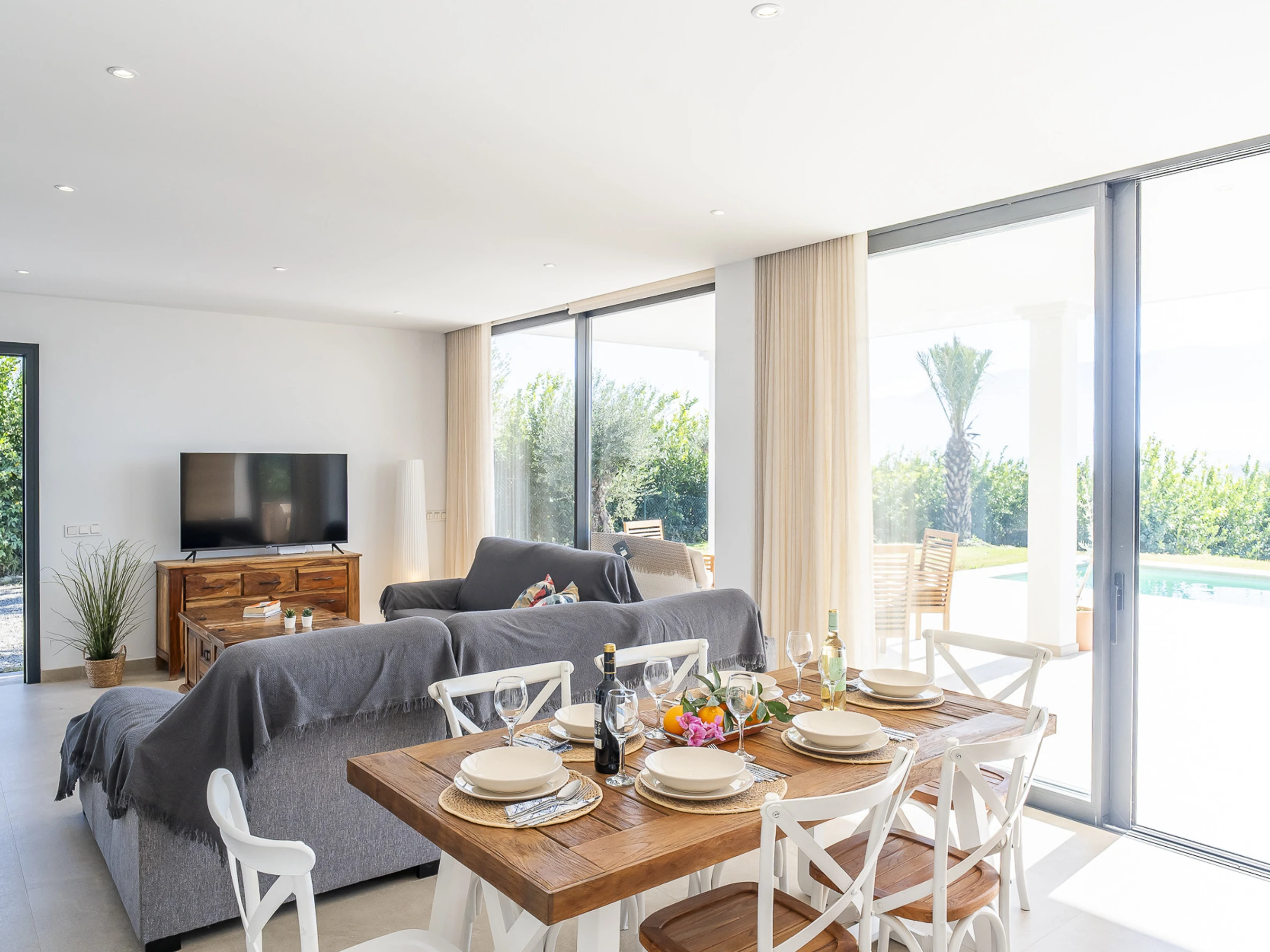 L'intérieur dispose d'un grand salon-salle à manger avec une cuisine américaine entièrement équipée, comprenant des appareils électroménagers modernes et un îlot central, parfait pour partager des moments tout en profitant de la vue. La maison est équipée de la climatisation dans toutes les pièces pour votre confort maximal.