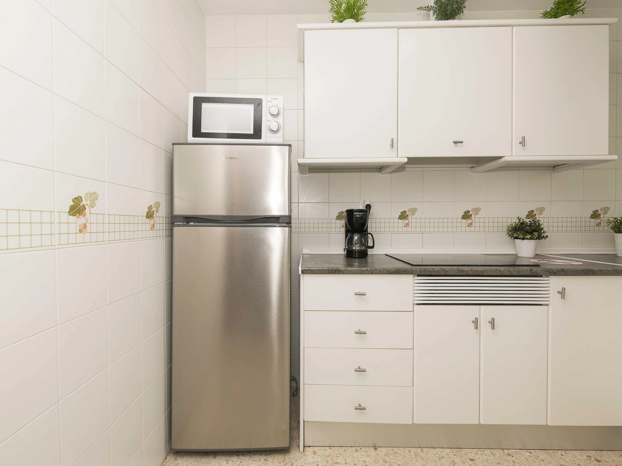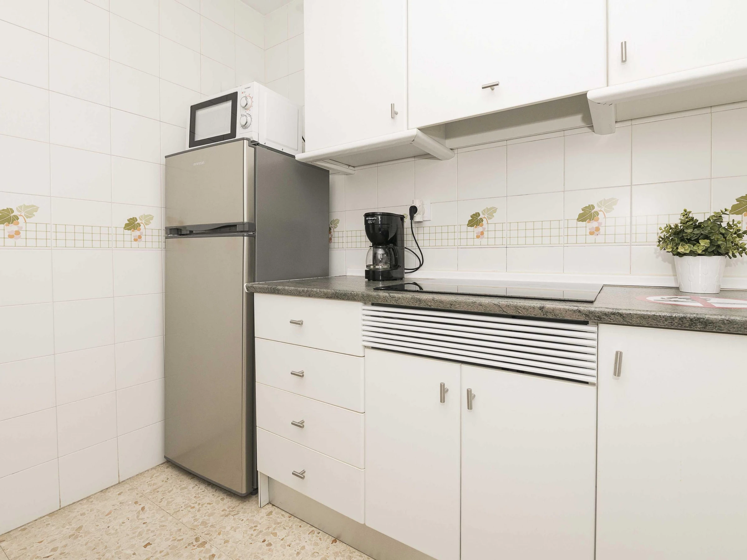 La cuisine, est équipée avec réfrigérateur, micro-ondes, congélateur et cafetière.