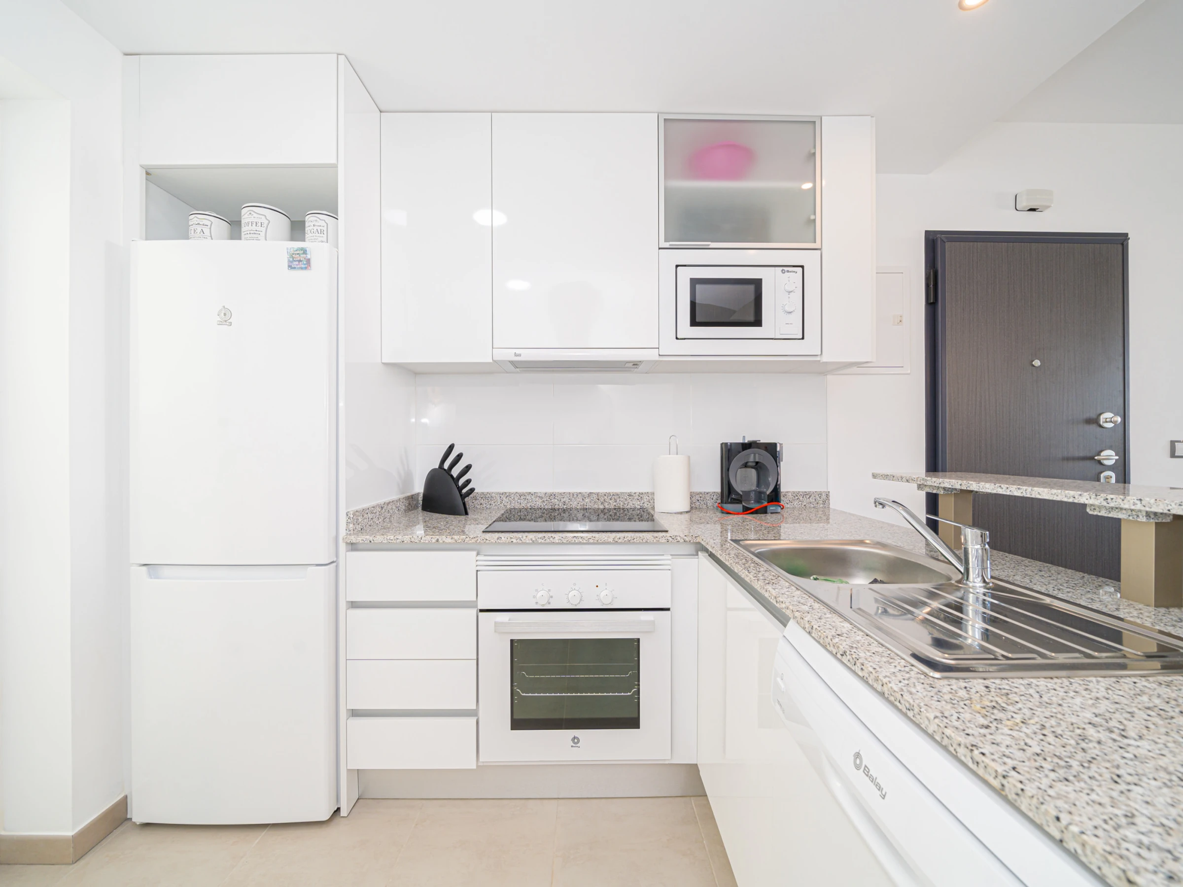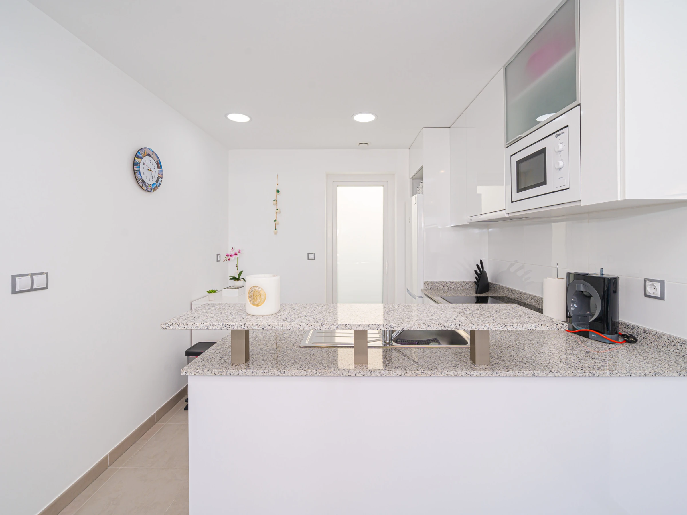 La cuisine américaine, à vitrocéramique, est équipée avec réfrigérateur, micro-ondes, four, congélateur, lave-vaisselle, vaisselle/couverts, ustensiles/cuisine, cafetière, grille pain, bouilloire et presse-agrumes.