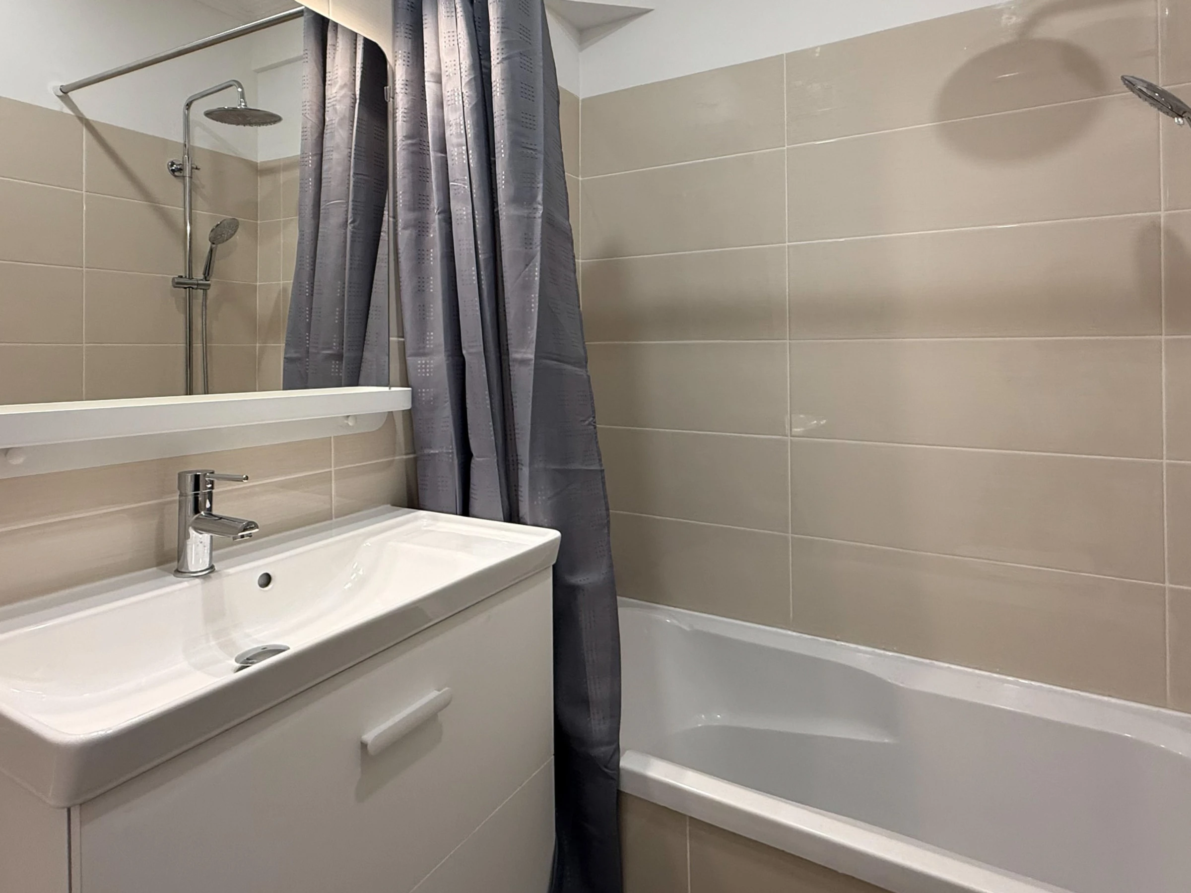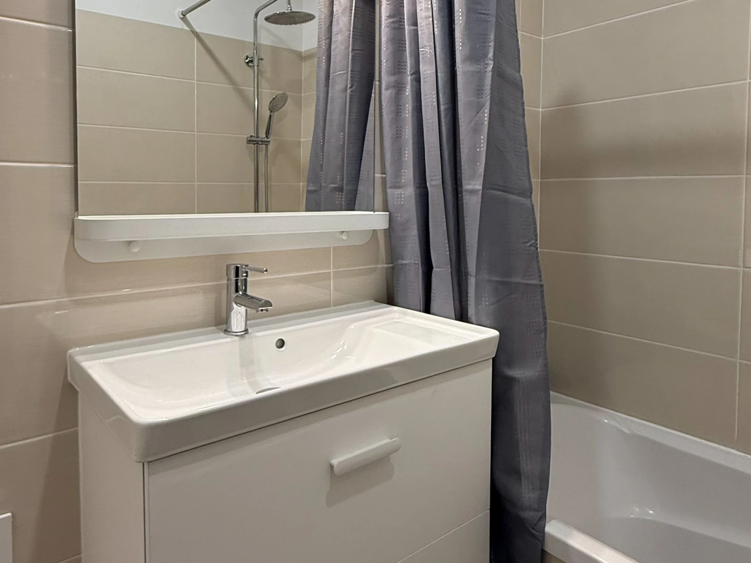 Un appartement fonctionnel, entièrement équipé pour 4 personnes, composé d'un hall d'entrée, d'un salon et salle à manger, d'une kitchenette, d'une chambre et d'une salle de bain avec baignoire.
