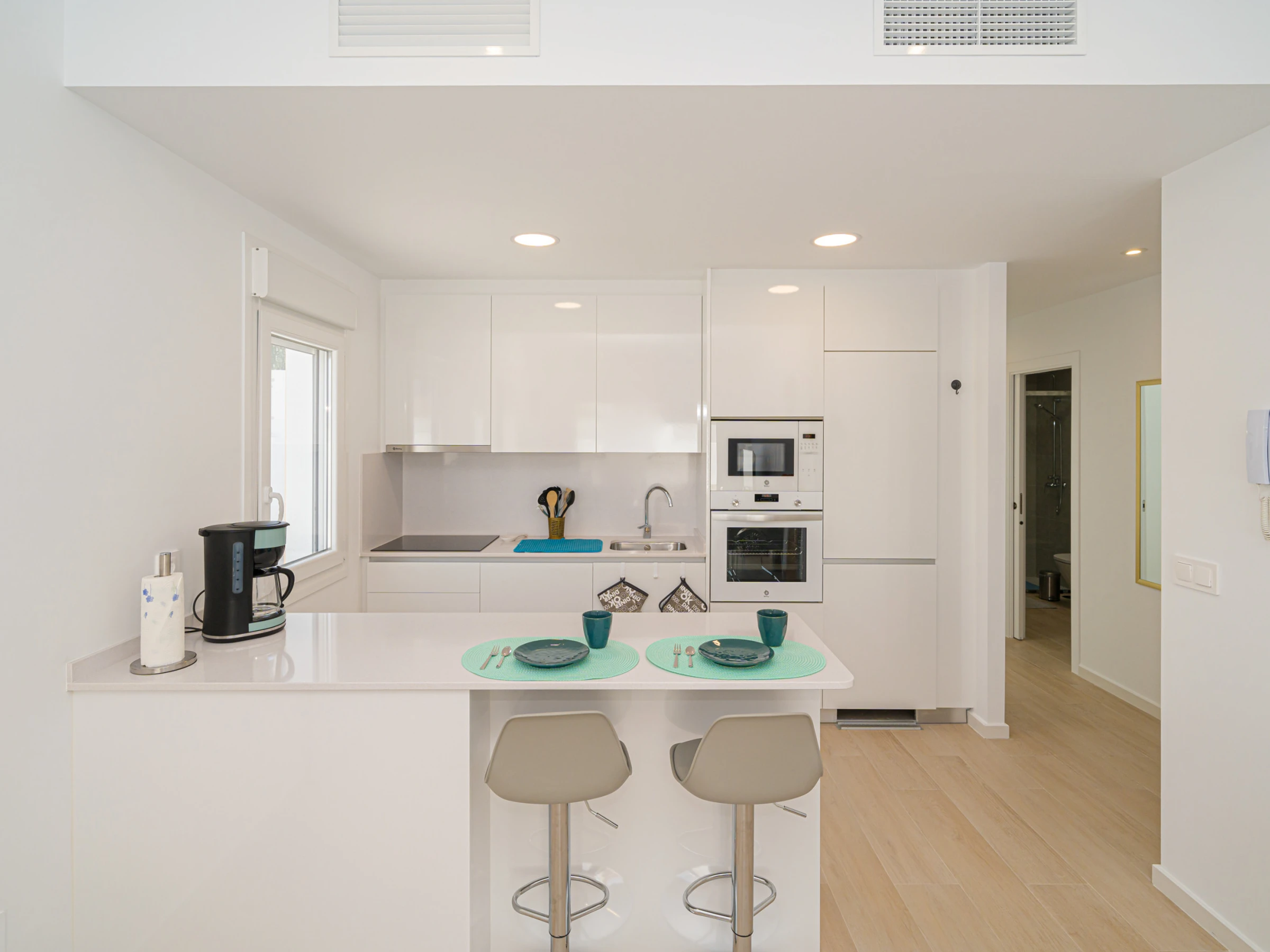 La cuisine américaine, à vitrocéramique, est équipée avec réfrigérateur, micro-ondes, four, congélateur, lave-vaisselle, vaisselle/couverts, ustensiles/cuisine, cafetière, grille pain, bouilloire et presse-agrumes.