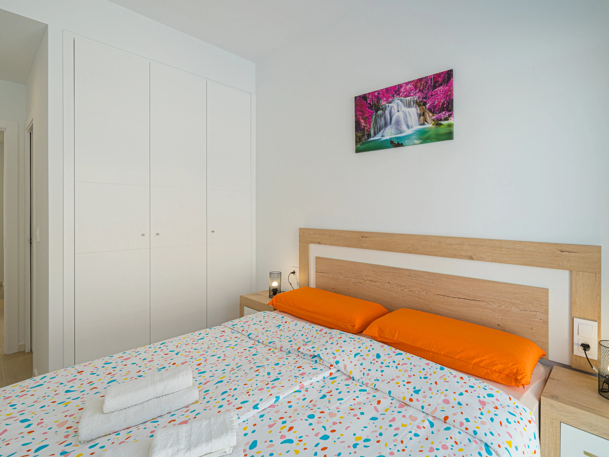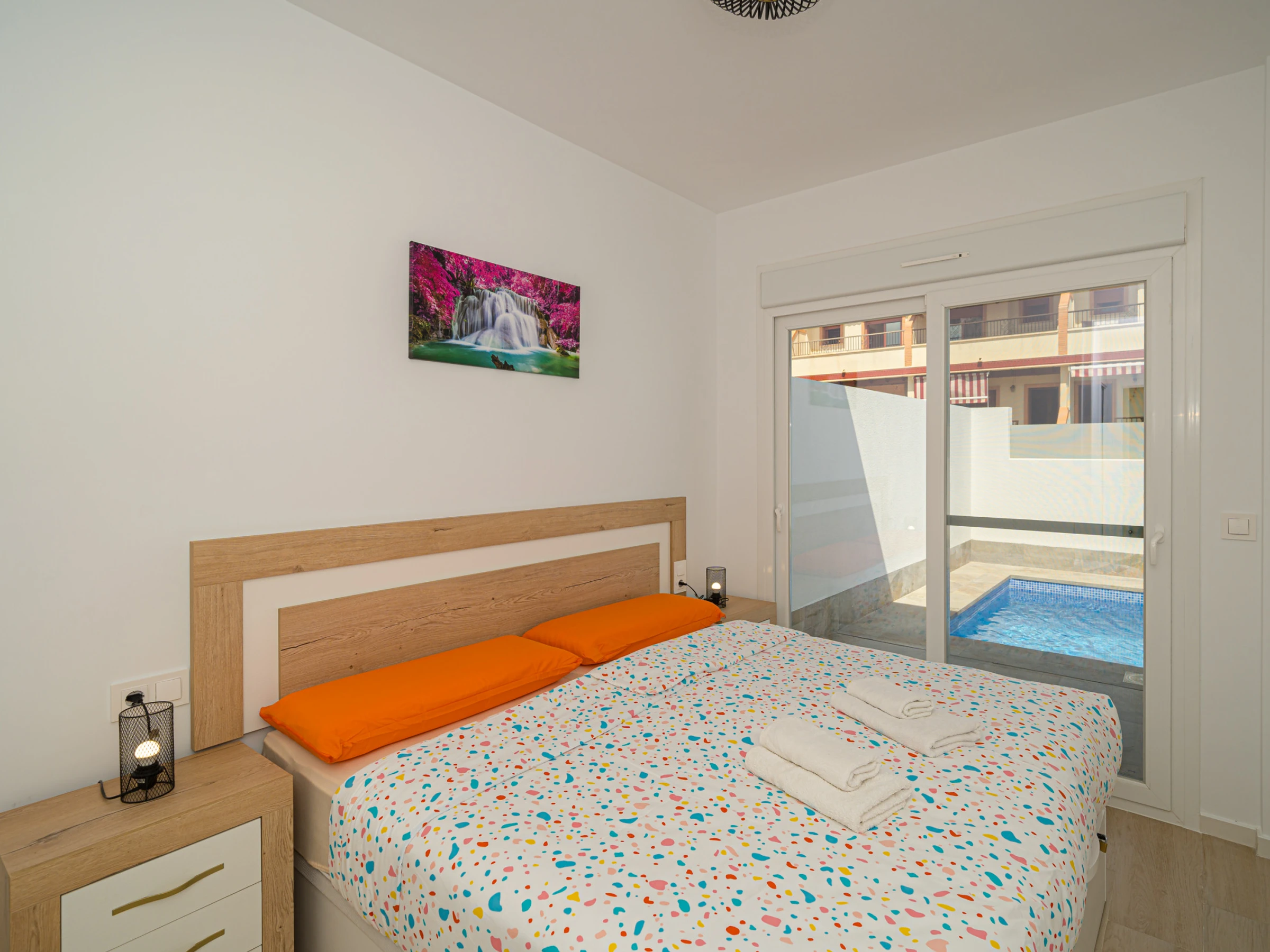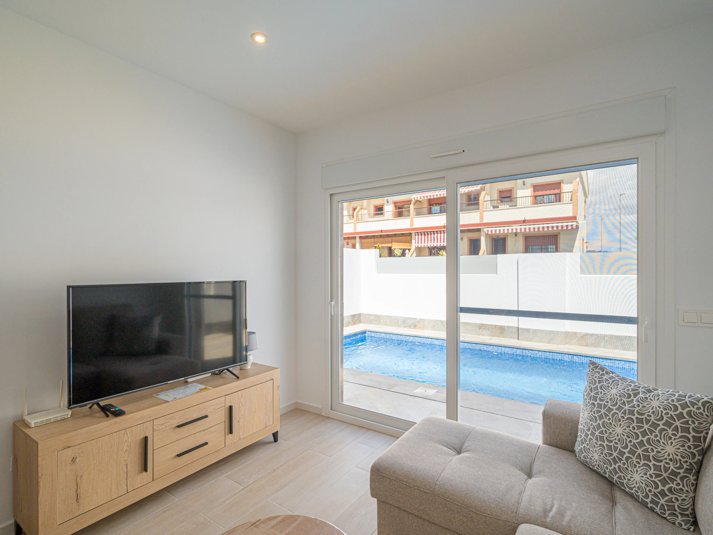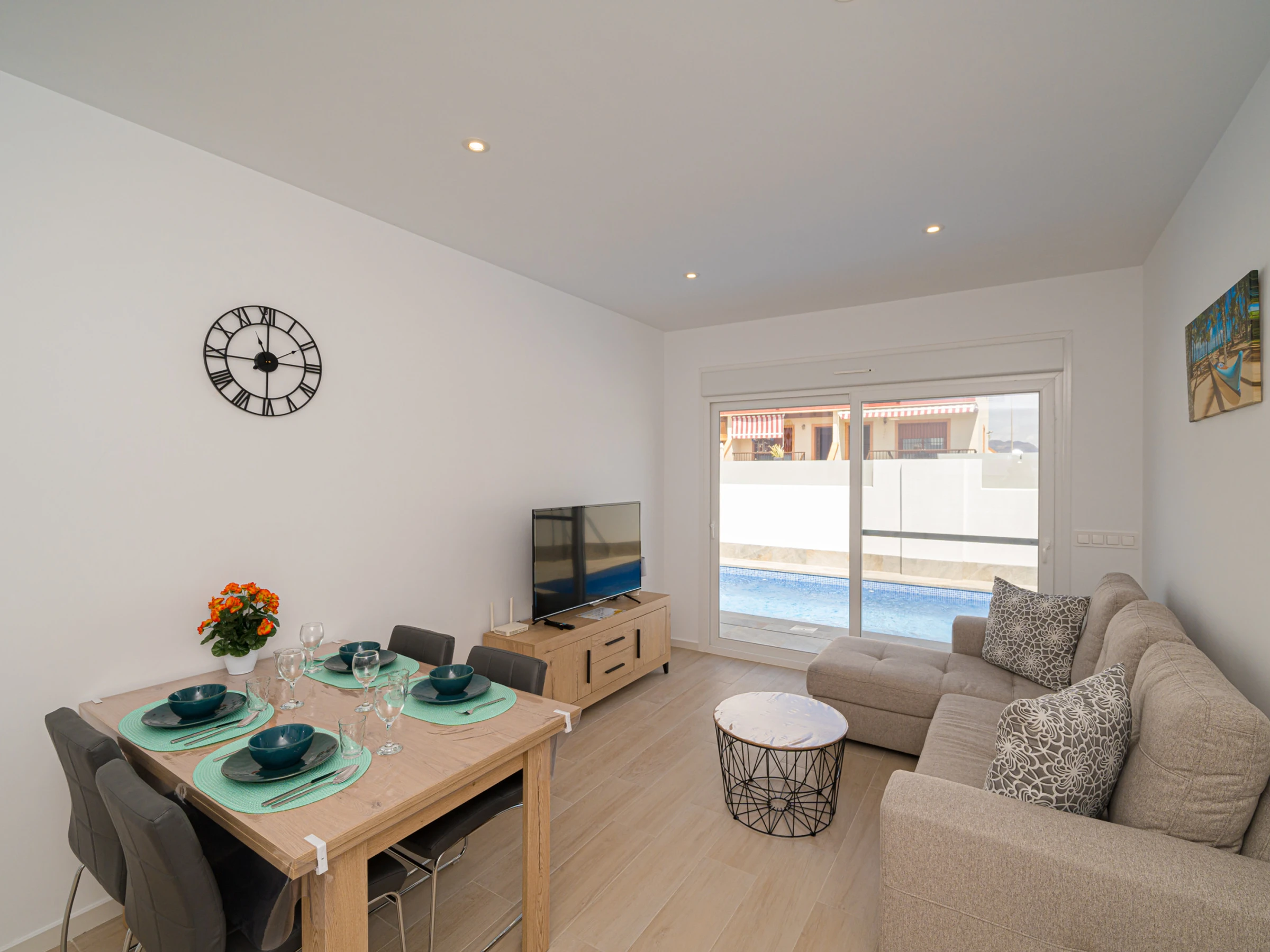 Elle dispose de jardin, mobilier de jardin, clôture, 60 m² de terrasse, lave-linge, fer à repasser, accès internet (wifi), sèche-cheveux, chauffage central, climatisation dans tout le logement, piscine privée, parking extérieur même bâtiment, moustiquaires dans tout le logement, 1 Télévision, tv satellite (Langues: Espagnol).