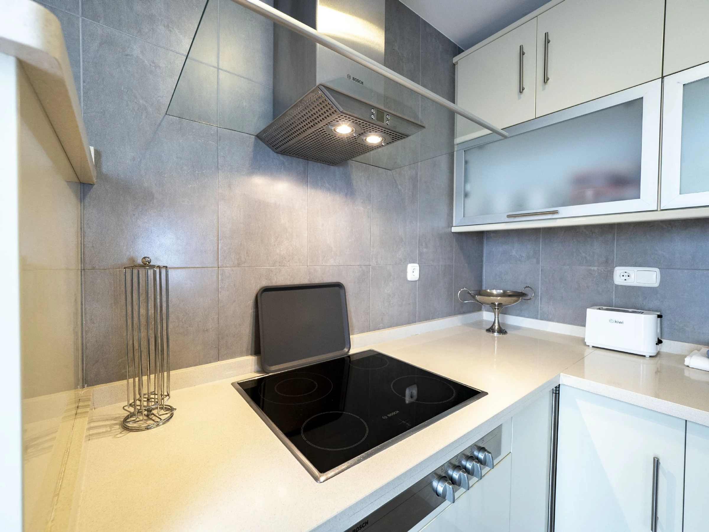 La cuisine indépendante, à vitrocéramique, est équipée avec réfrigérateur, micro-ondes, four, congélateur, lave-vaisselle, vaisselle/couverts, ustensiles/cuisine, cafetière, grille pain, bouilloire et presse-agrumes.