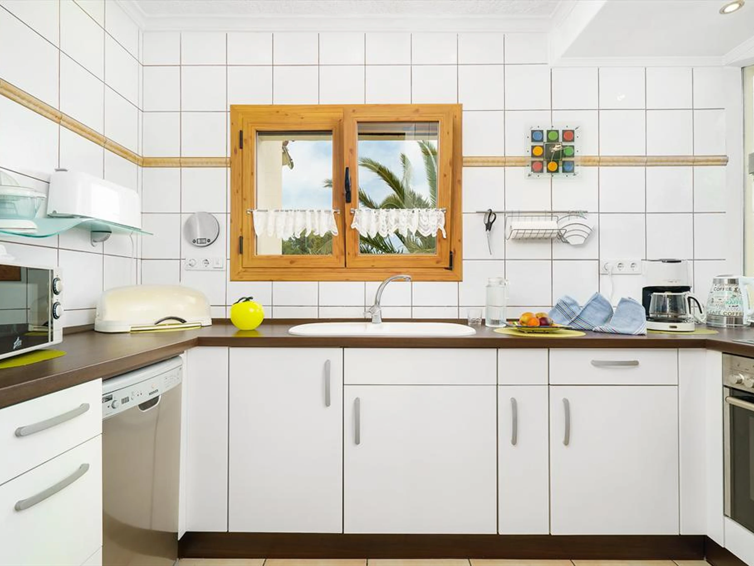 La cuisine, est équipée avec micro-ondes, four, congélateur, lave-vaisselle, cafetière et grille pain.