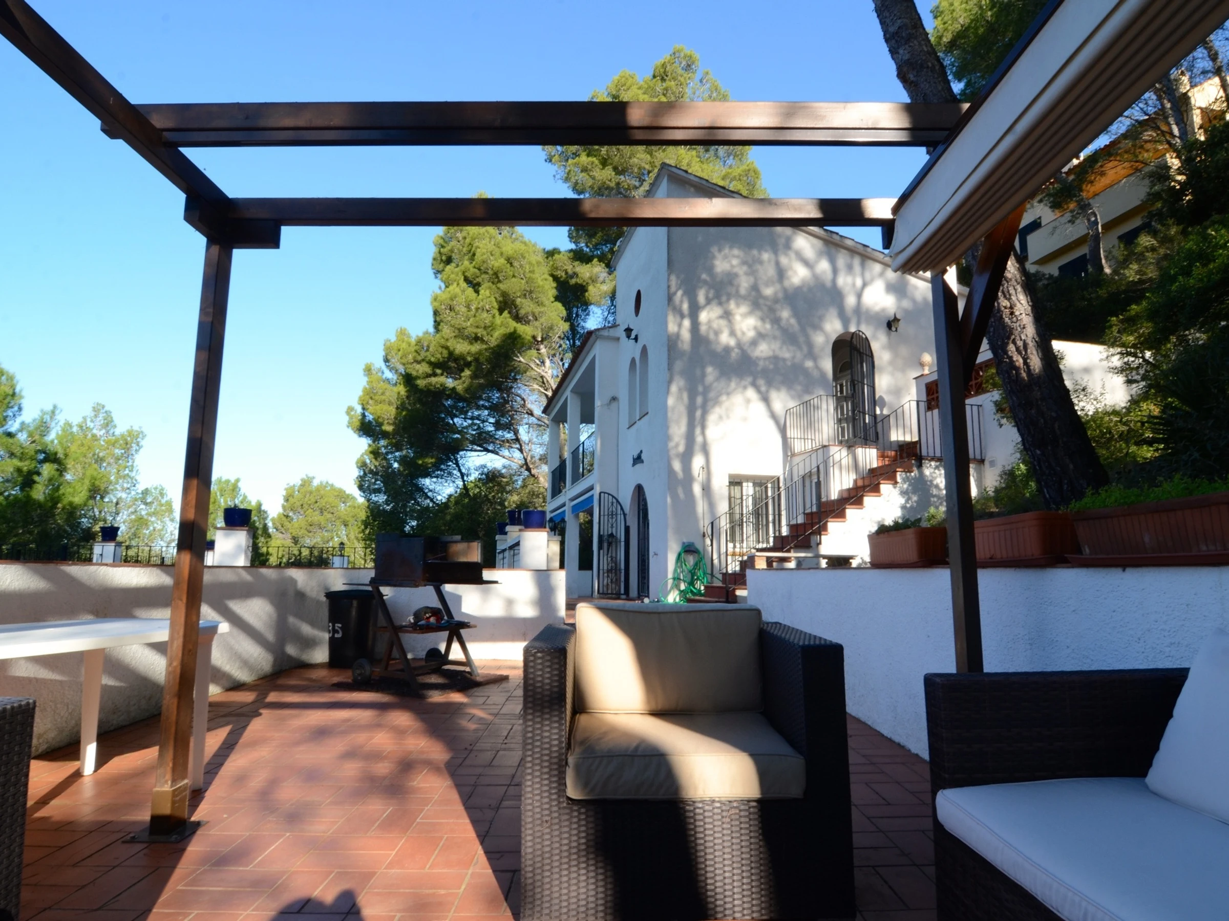 - Premier étage avec deux chambres supplémentaires, une salle de bain, une cuisine ouverte sur le salon-salle à manger avec cheminée et une grande terrasse.