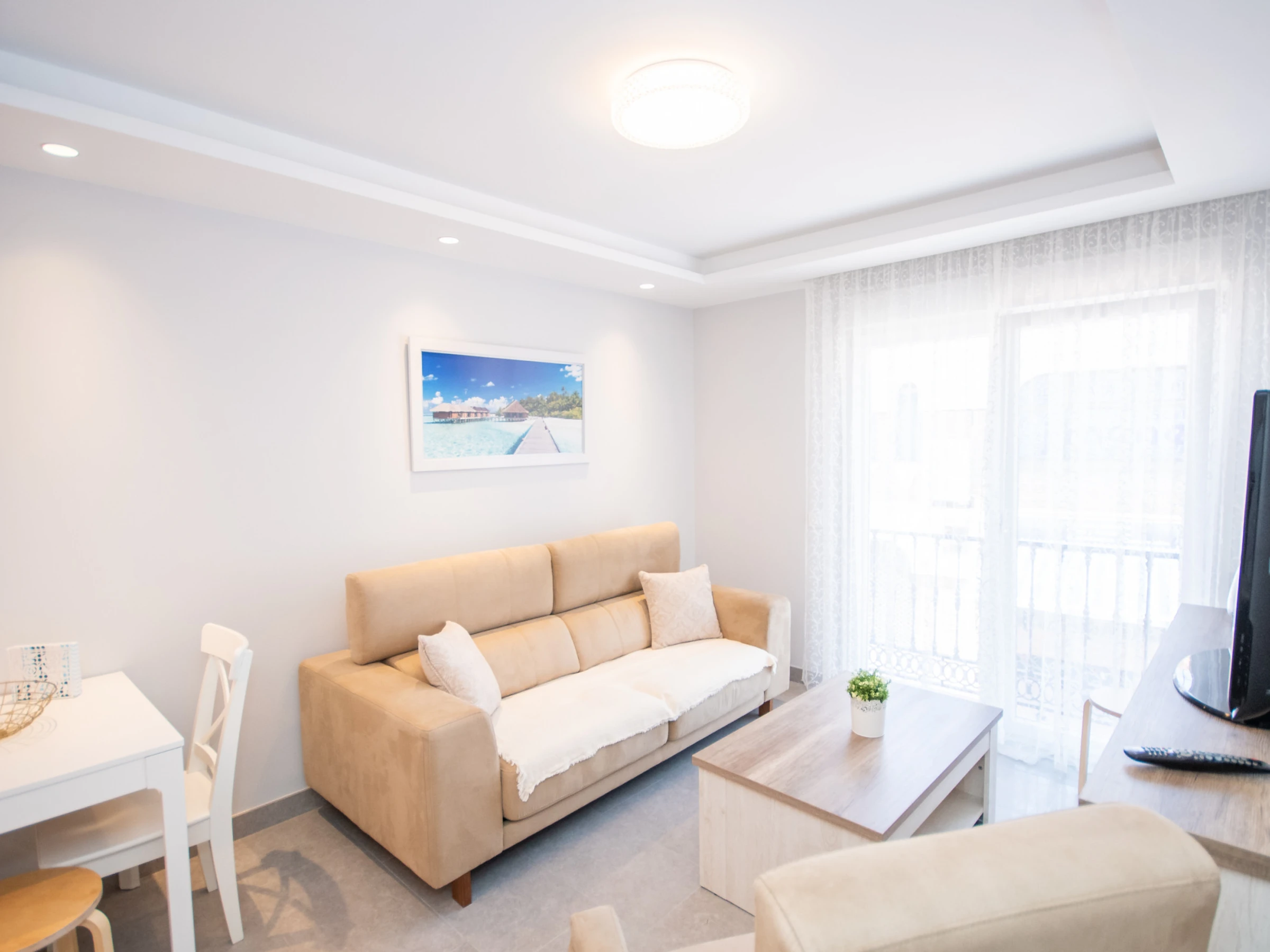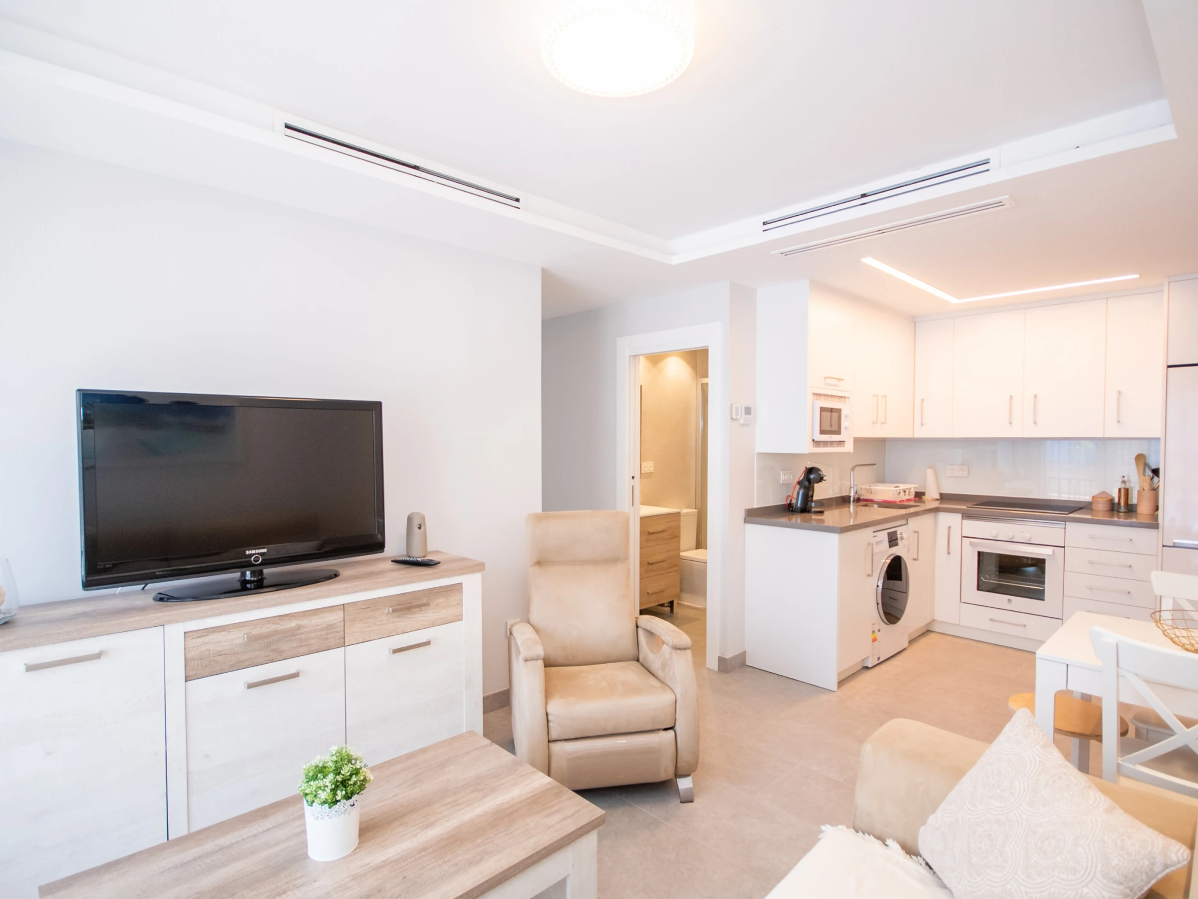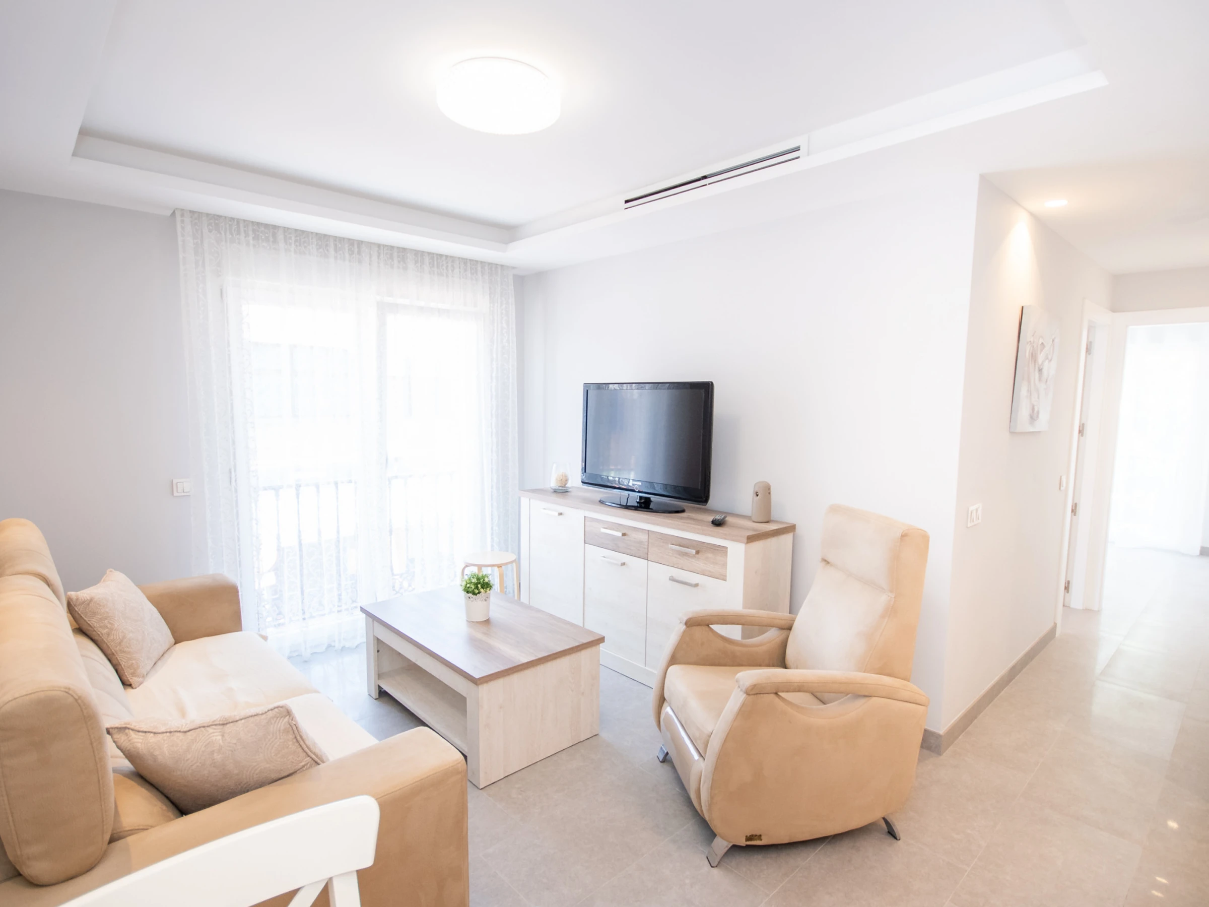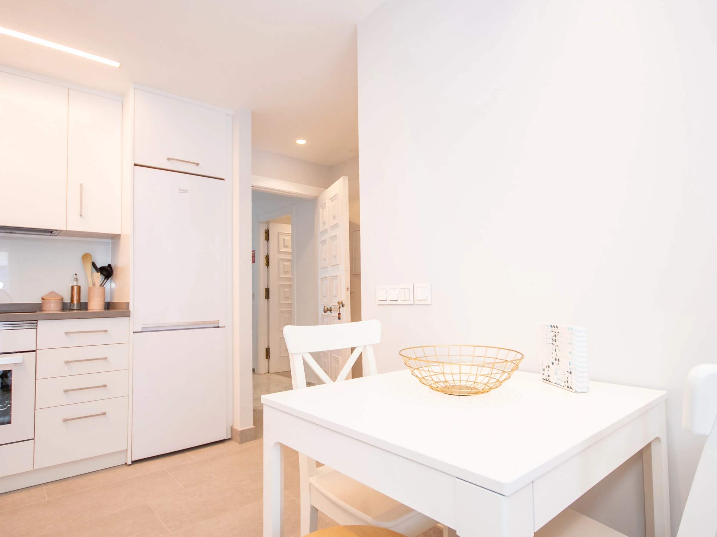 L'appartement, rénové en 2019, offre une cuisine américaine entièrement équipée pour préparer vos plats préférés 🍽️, un salon accueillant avec Smart TV et WiFi gratuit pour vous détendre après une journée remplie d'aventures 🛋️, et un air conditionné centralisé avec des fenêtres à double vitrage pour une ambiance fraîche et calme ❄️. La distribution comprend une chambre principale avec un lit de couple et une chambre secondaire avec un lit gigogne 🛏️.