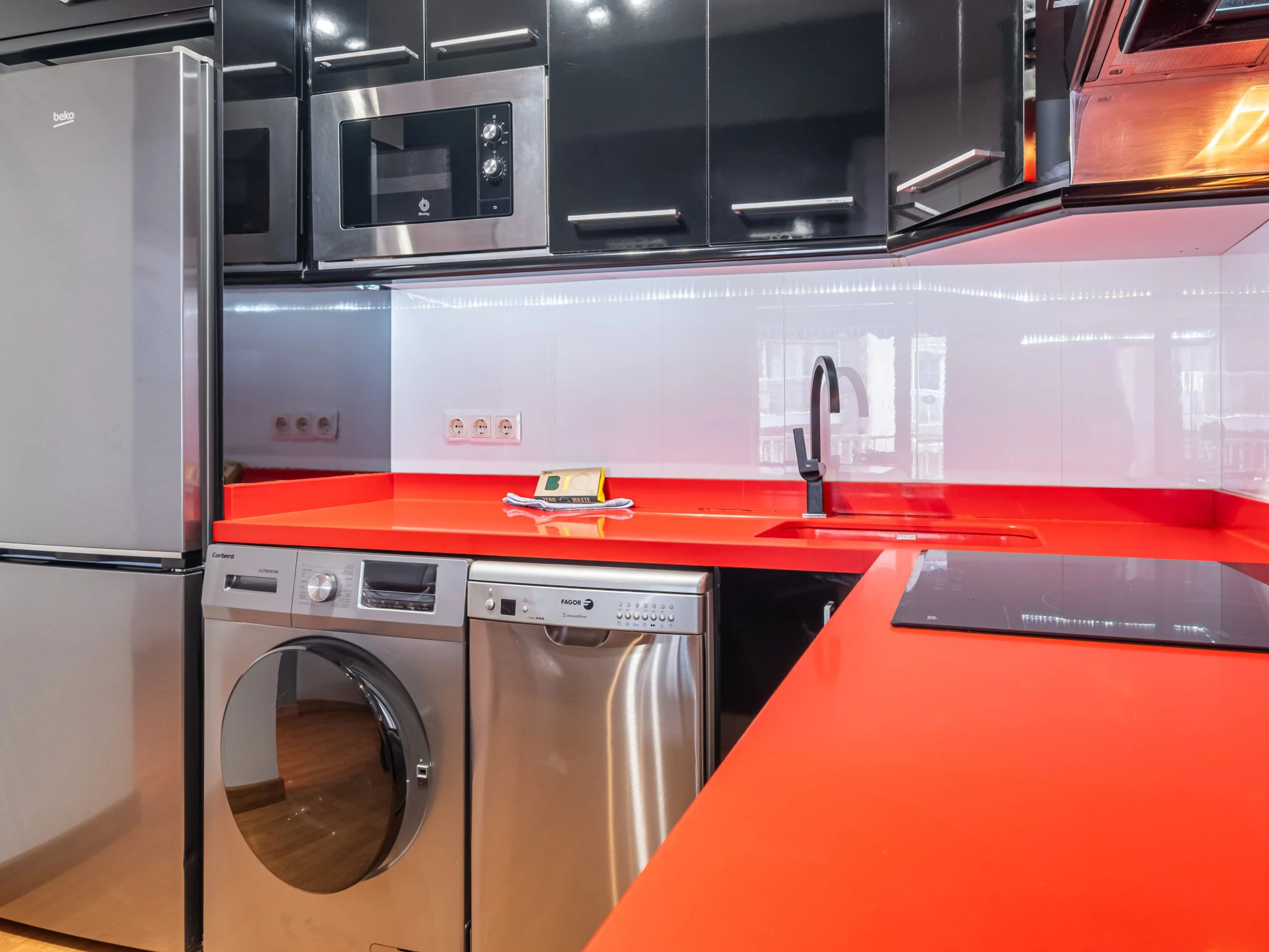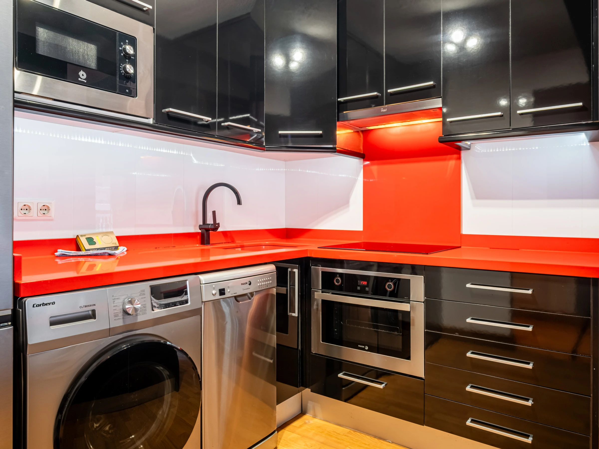 La cuisine américaine avec îlot est entièrement équipée d'électroménagers de dernière génération, comprenant un réfrigérateur, un congélateur, un lave-linge, un lave-vaisselle, un four, un micro-ondes, une cafetière, un grille-pain, une bouilloire, un presse-agrumes et un équipement de cuisine complet. De plus, elle dispose de deux téléviseurs (1 Smart TV) et d'une connexion WiFi pour rester connecté.