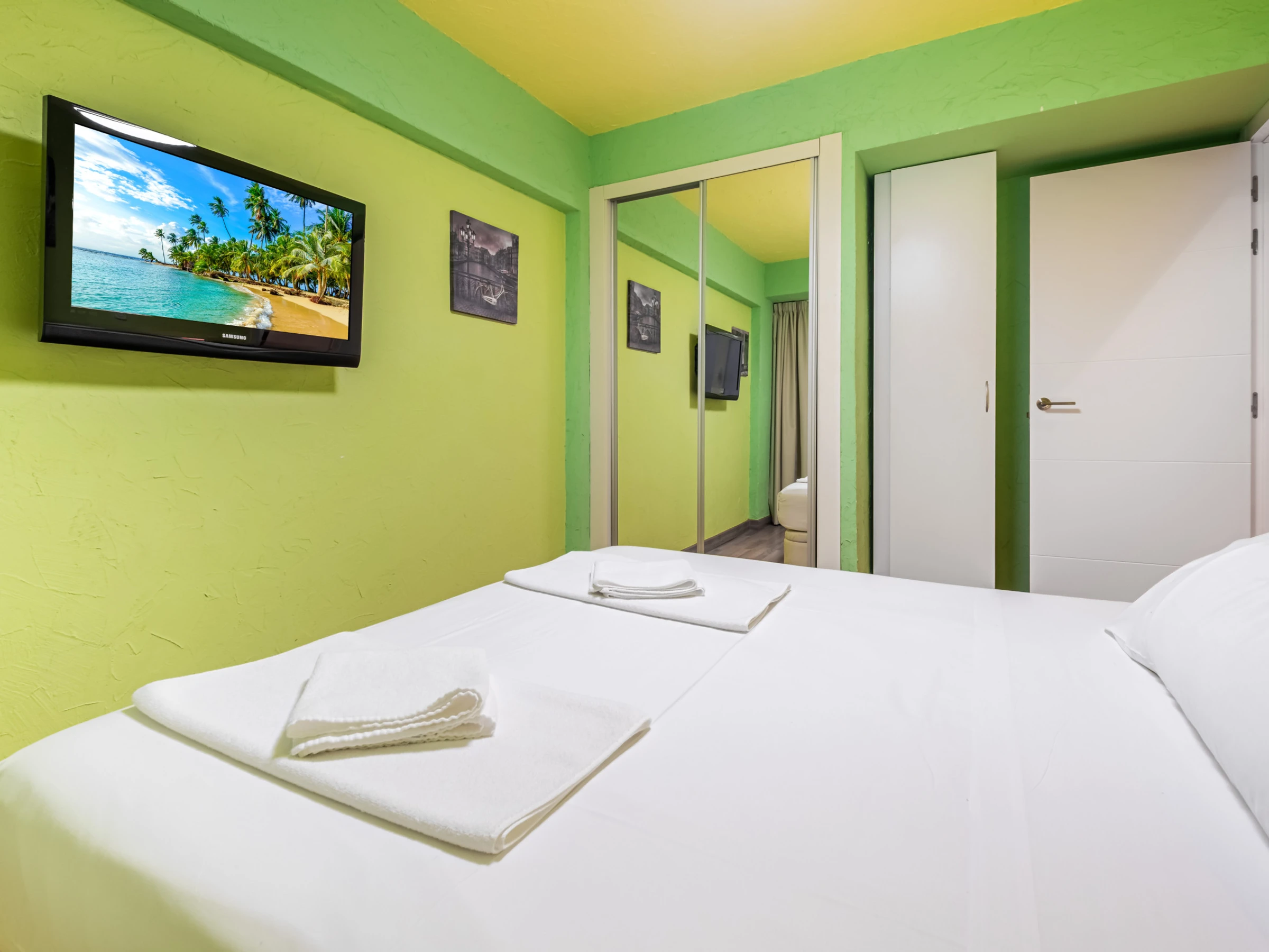L'appartement dispose de deux chambres équipées de lits doubles, comprenant un canapé-lit supplémentaire pour plus de flexibilité dans le salon-salle à manger. Il dispose d'une salle de bain complète avec douche, bidet et sèche-cheveux, climatisation et chauffage par pompe à chaleur pour garantir votre confort à toute époque de l'année.