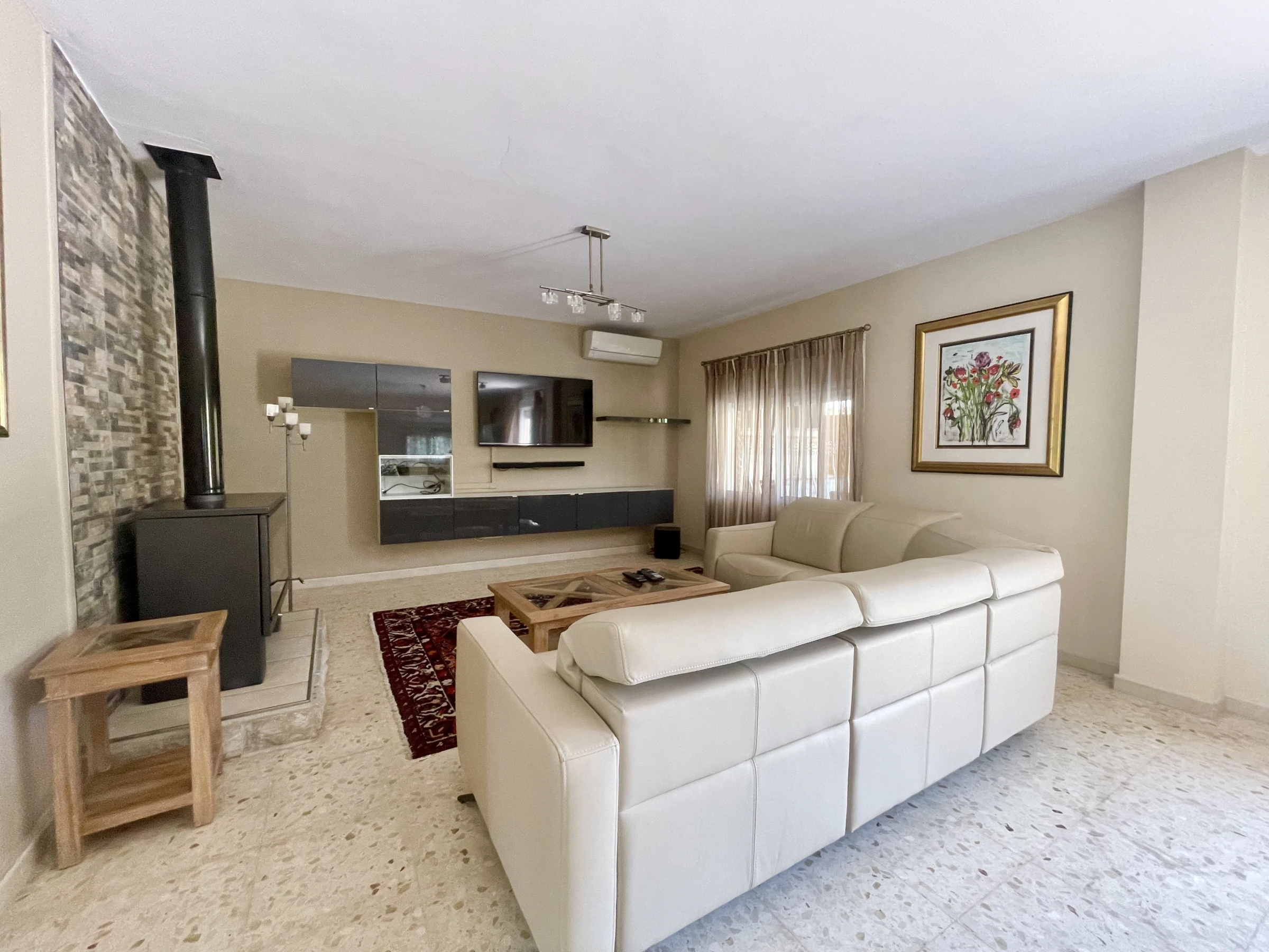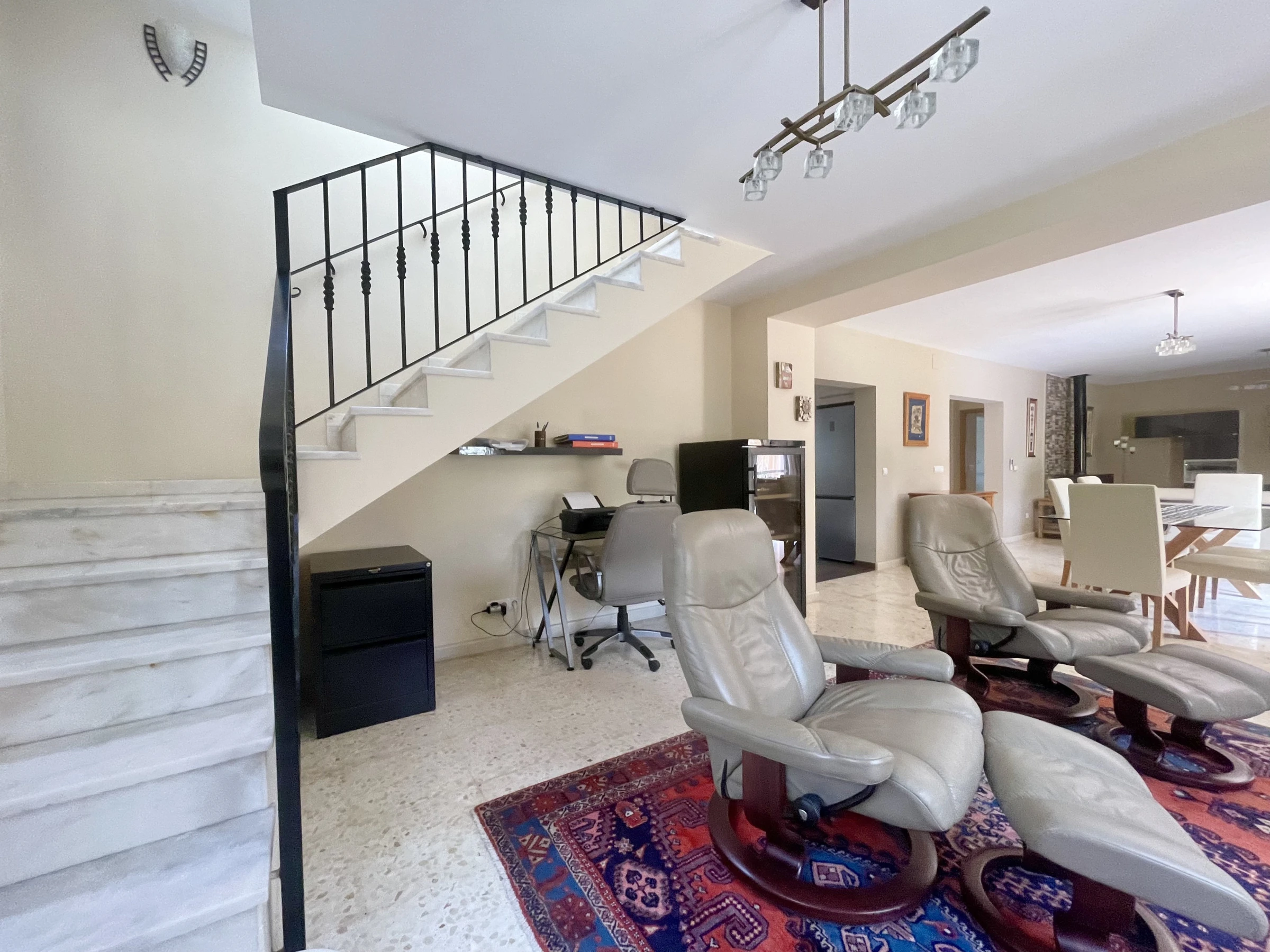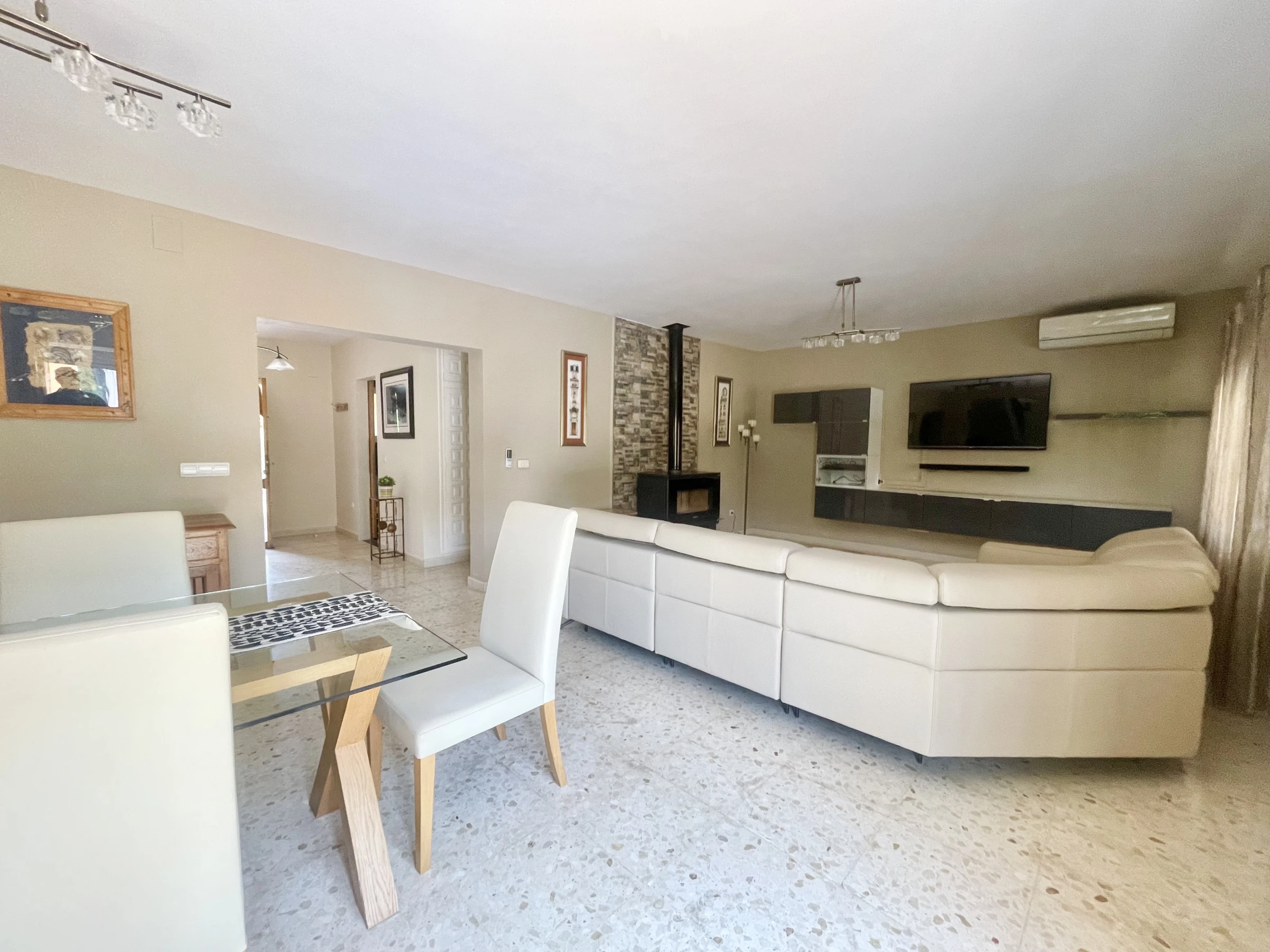 La maison, avec 300 m2 de superficie, est répartie sur deux étages. Le rez-de-chaussée dispose d'un magnifique hall d'entrée avec des toilettes de courtoisie, une grande chambre avec un lit double, des armoires encastrées et une télévision à plasma. Le hall d'entrée donne accès à un immense salon-salle à manger avec des canapés et des fauteuils confortables en cuir, une télévision à plasma, une cheminée et une table de salle à manger avec des fauteuils en cuir. Le salon a un accès direct à la zone extérieure et à une cuisine moderne entièrement équipée.