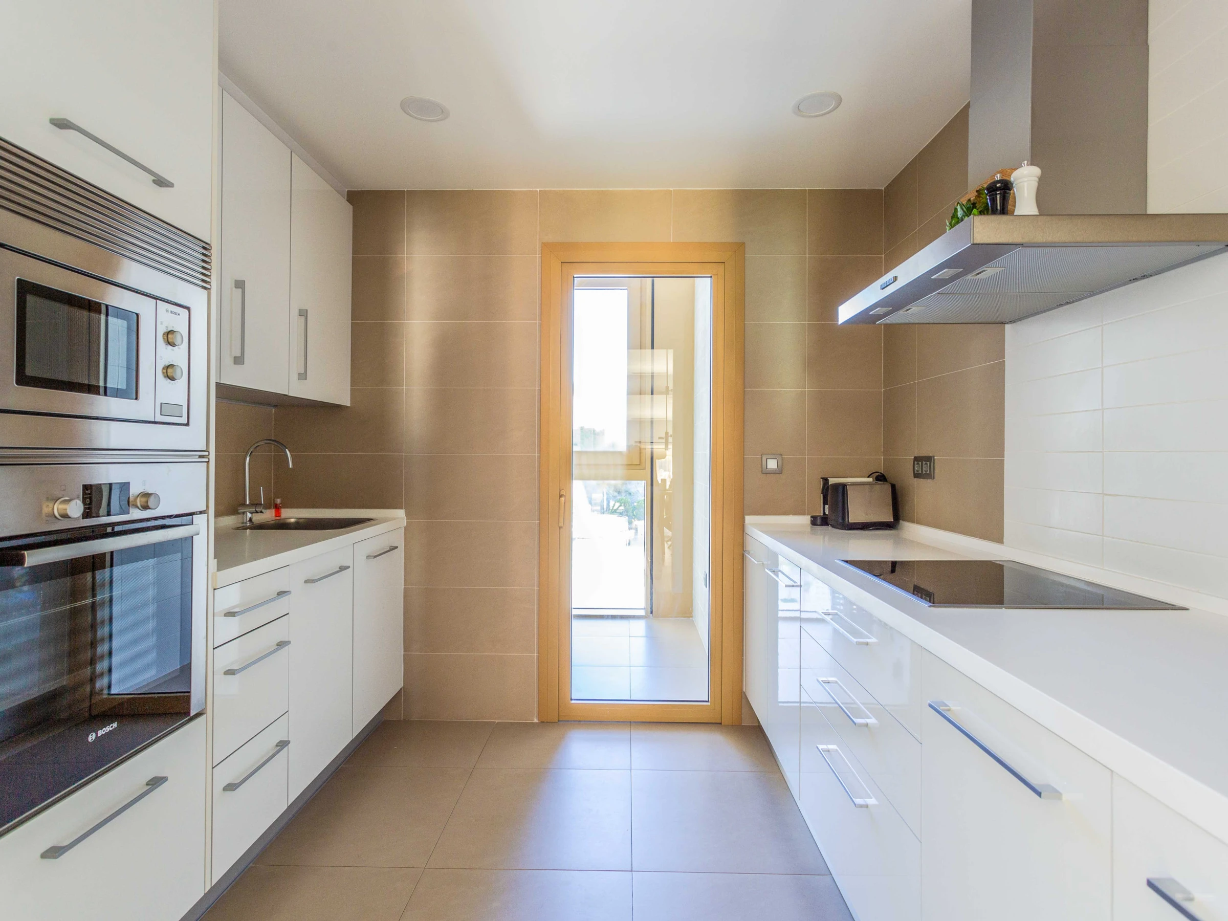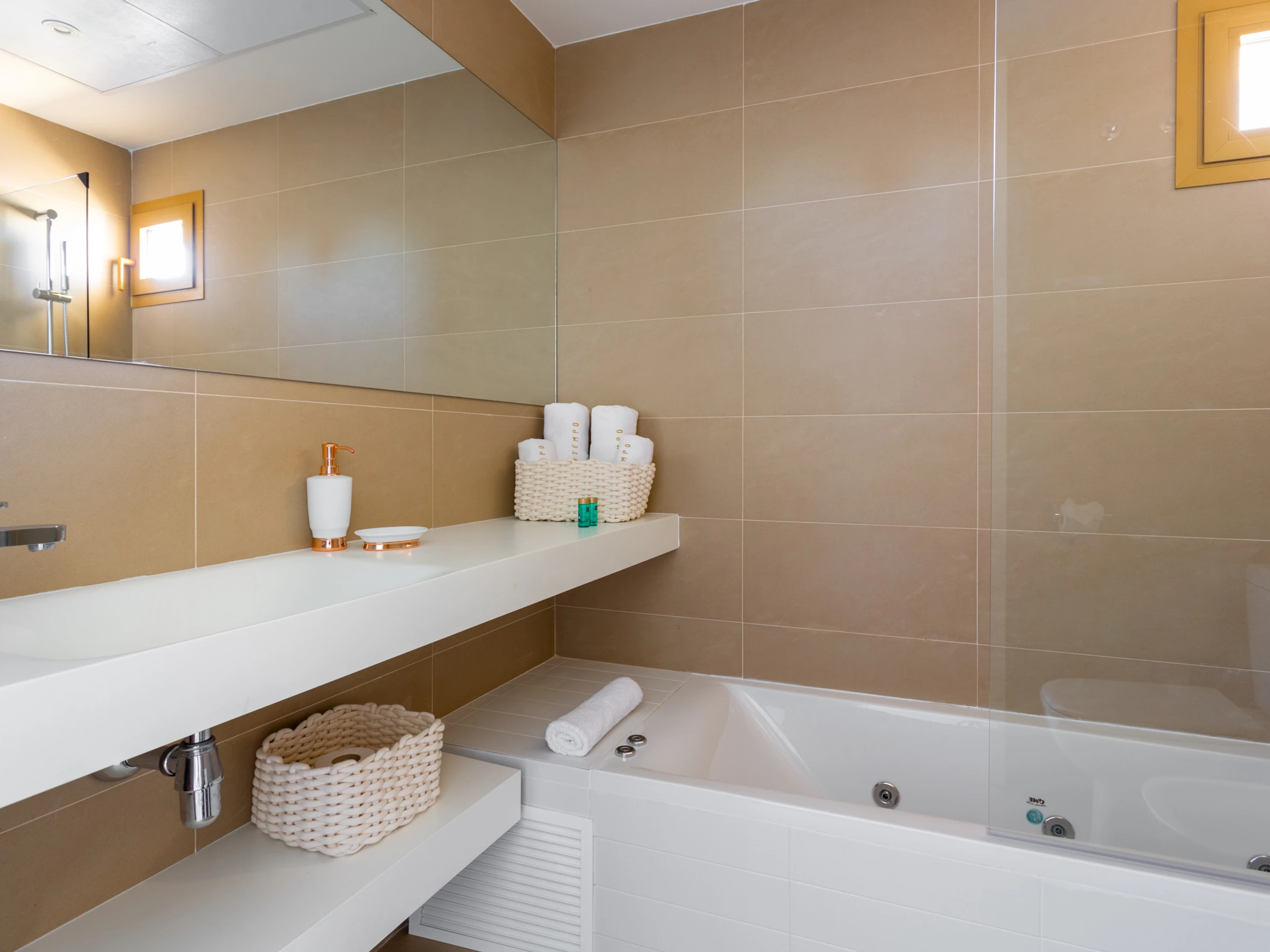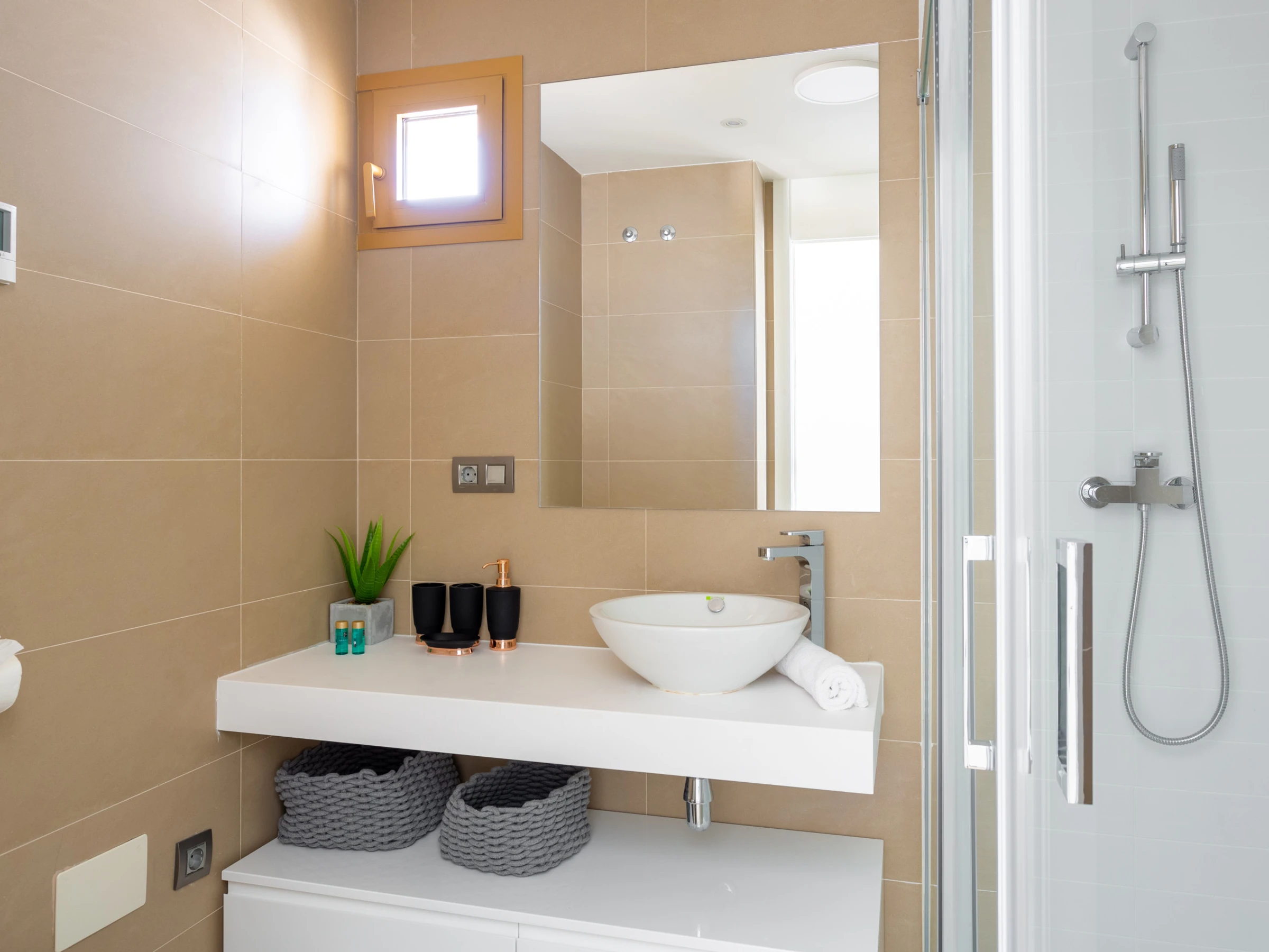 Les installations de l'appartement sont exceptionnelles. Il dispose de deux salles de bains, l'une avec douche et l'autre avec baignoire, facilitant le confort des invités. La cuisine indépendante est entièrement équipée d'électroménagers de marques reconnues tels que lave-linge, lave-vaisselle, four, micro-ondes et cafetière, permettant de préparer des repas pendant le séjour.