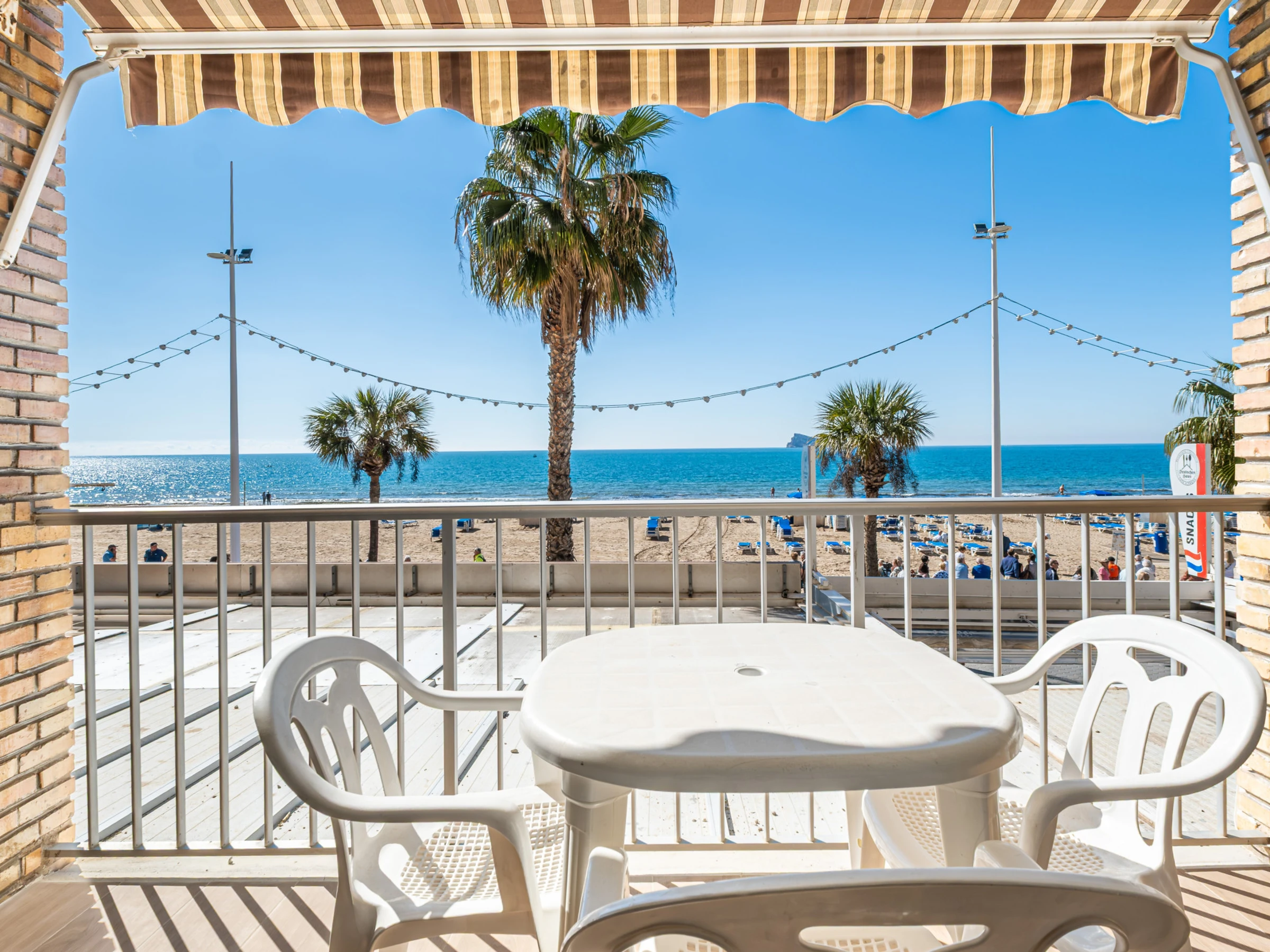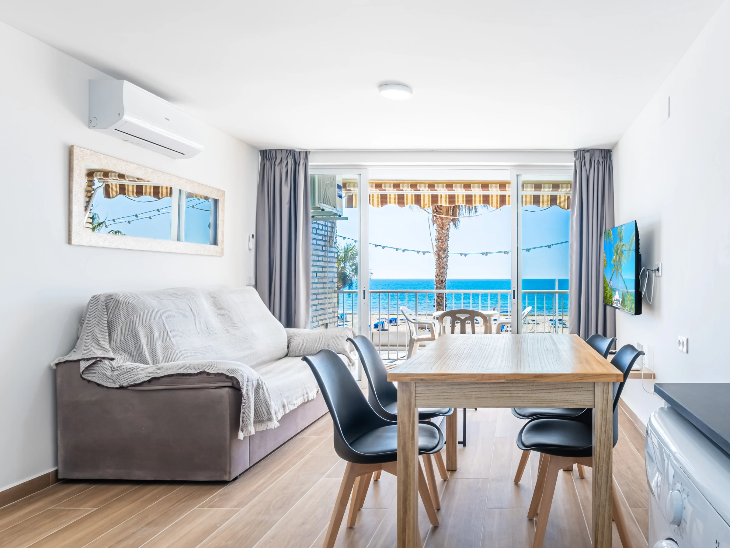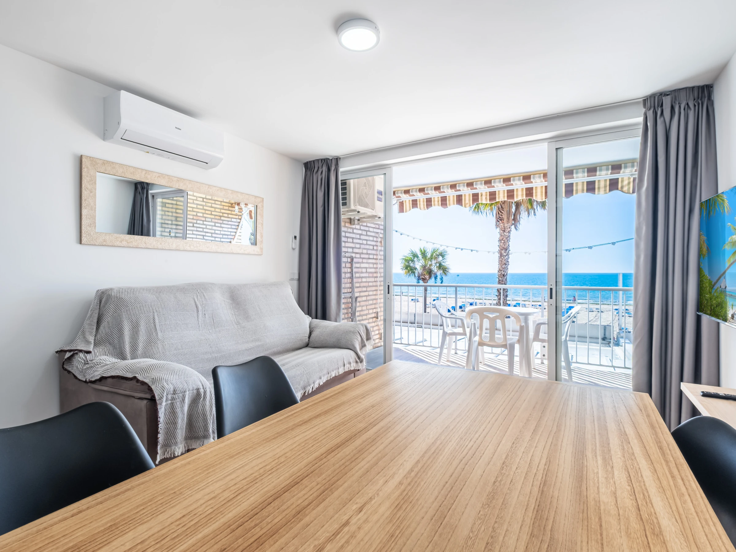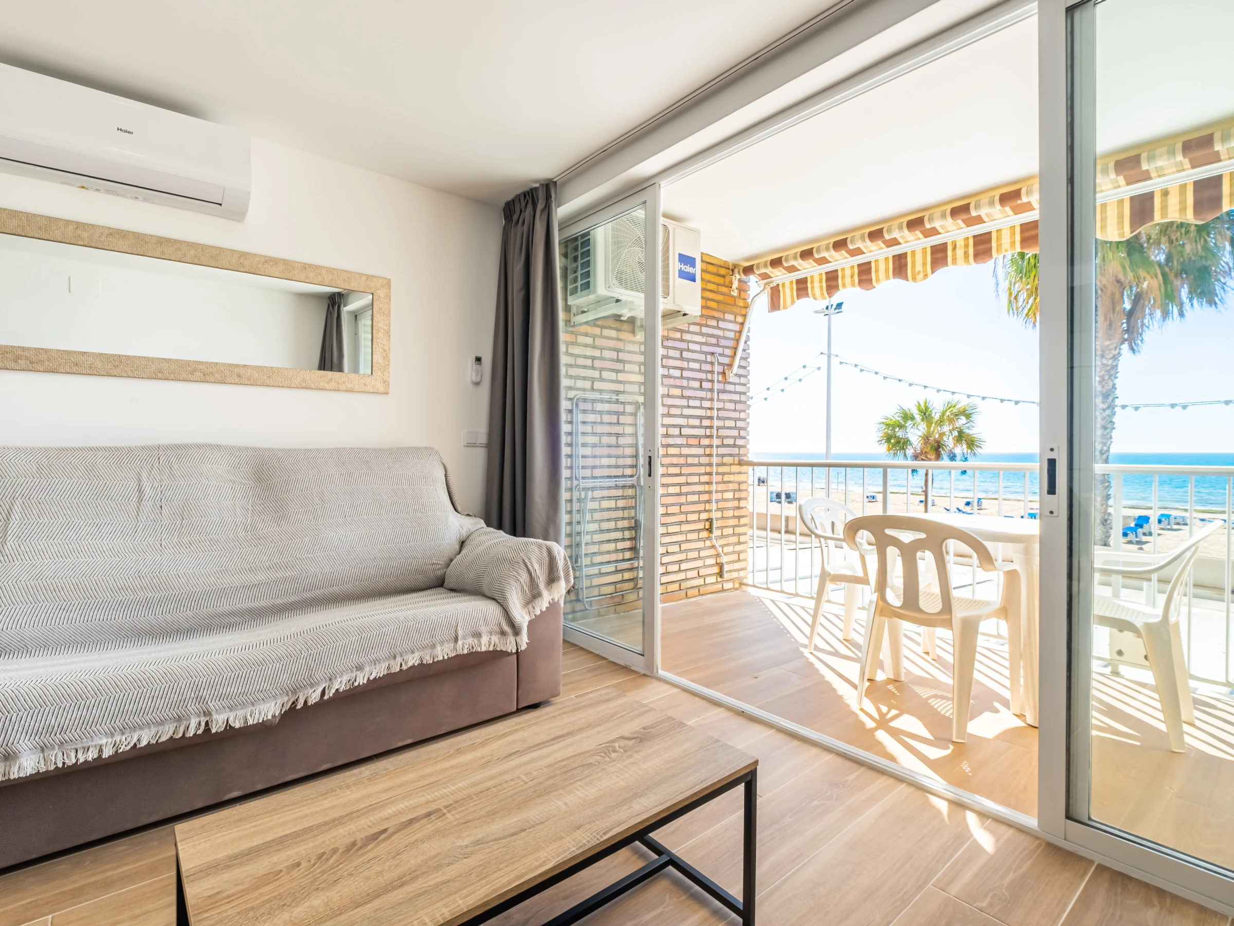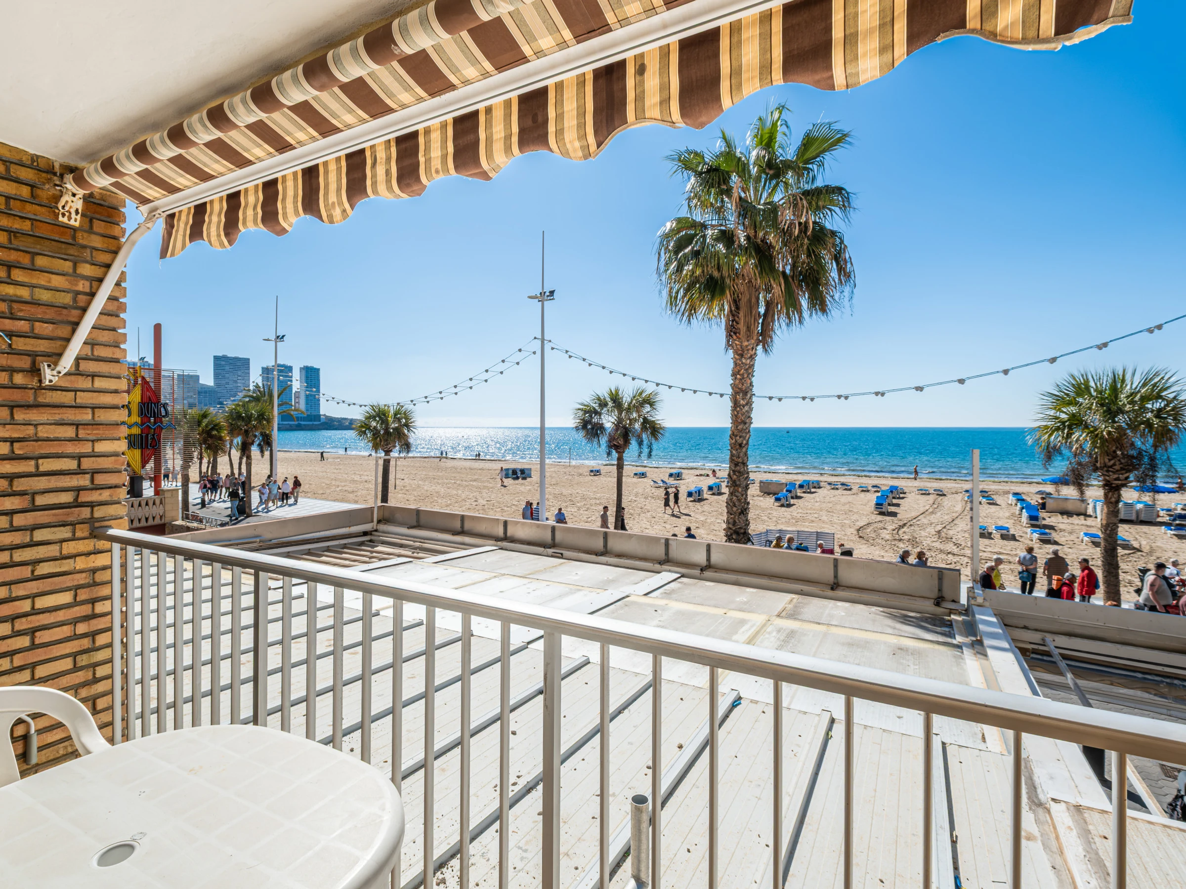 Appartement en première ligne de plage Levante, Benidorm, avec un accès direct à la plage depuis l'établissement même. Il dispose de 1 chambre avec climatisation, ventilateur et télévision, 1 salle de bain avec douche et sèche-cheveux, et peut accueillir 4 personnes avec deux places sur un canapé-lit double.