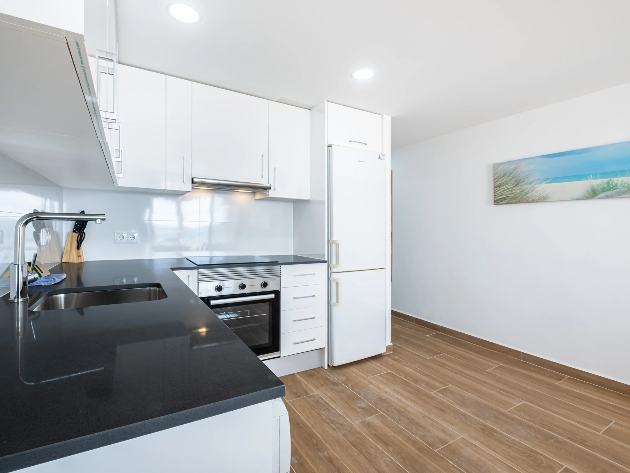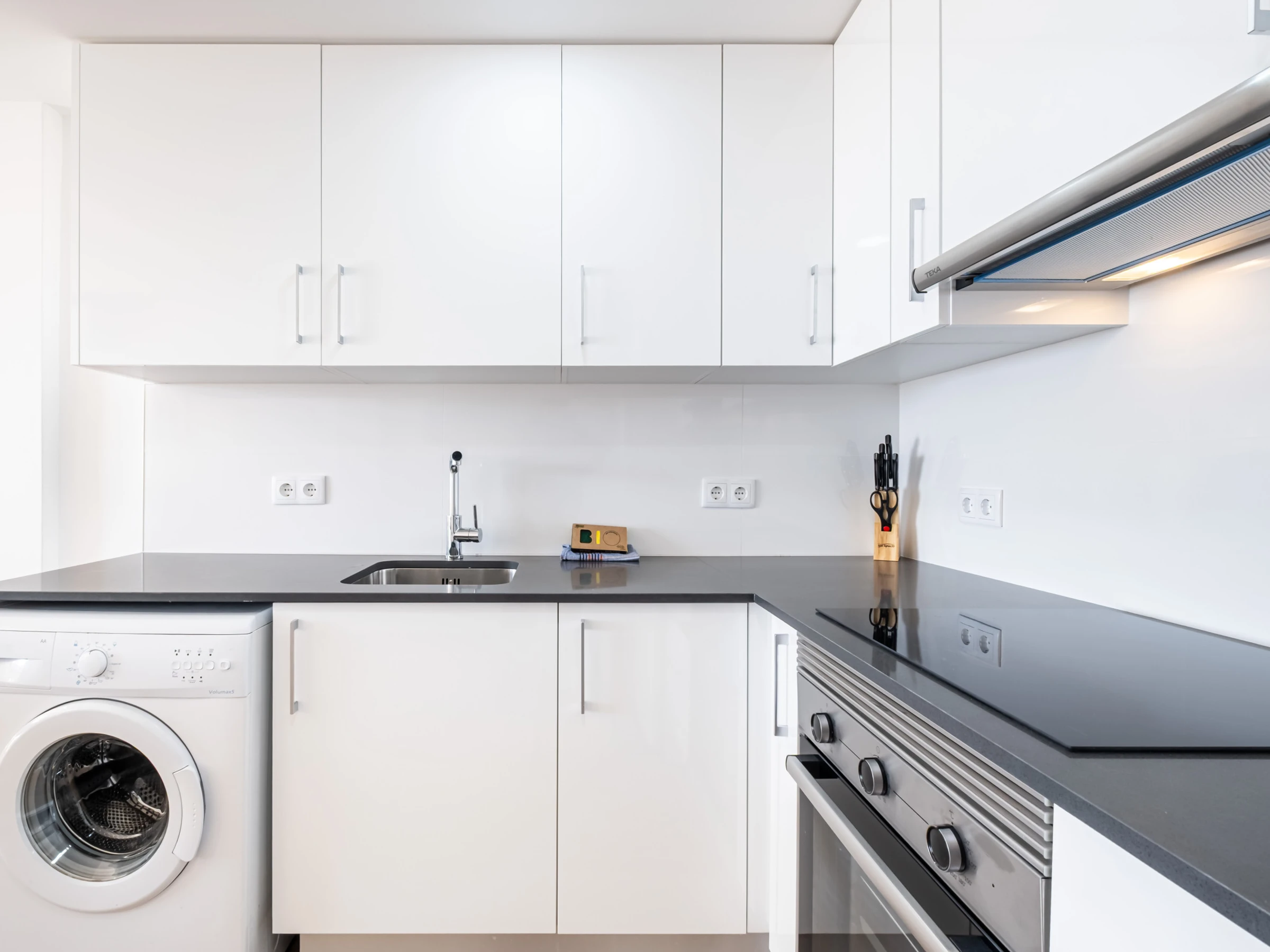 La cuisine américaine à induction est équipée d'un réfrigérateur, d'un micro-ondes, d'un four, d'un congélateur, d'un lave-linge, de vaisselle/couverts, d'ustensiles/cuisine, d'une cafetière, d'un grille-pain, d'une bouilloire et d'un presse-agrumes.