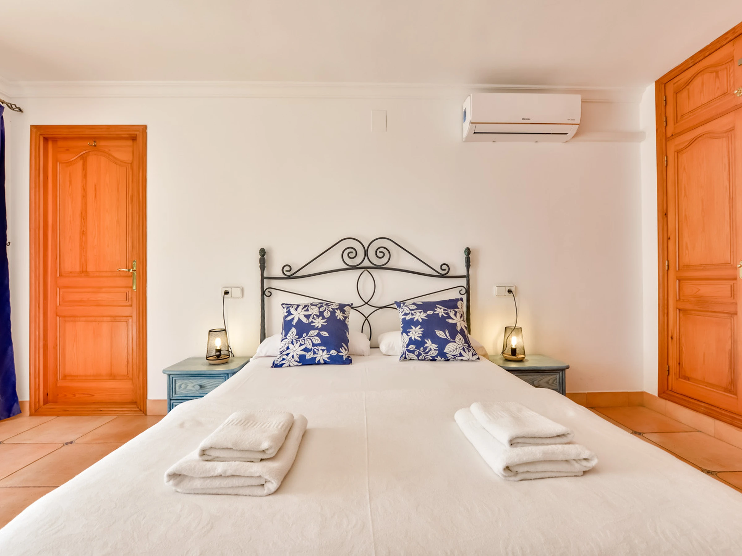 Dans la maison principale, qui se trouve au premier étage de la maison et à laquelle on accède par un escalier de 15 marches, on trouve un salon avec cheminée décorative, ventilateur de plafond, air conditionné et accès à une belle terrasse avec vue dégagée et un peu de vue sur la mer et une table pour les repas en plein air. Une cuisine entièrement équipée, une salle de bains avec douche, une chambre à coucher avec lit double et climatisation. La deuxième chambre dispose d'un lit double.