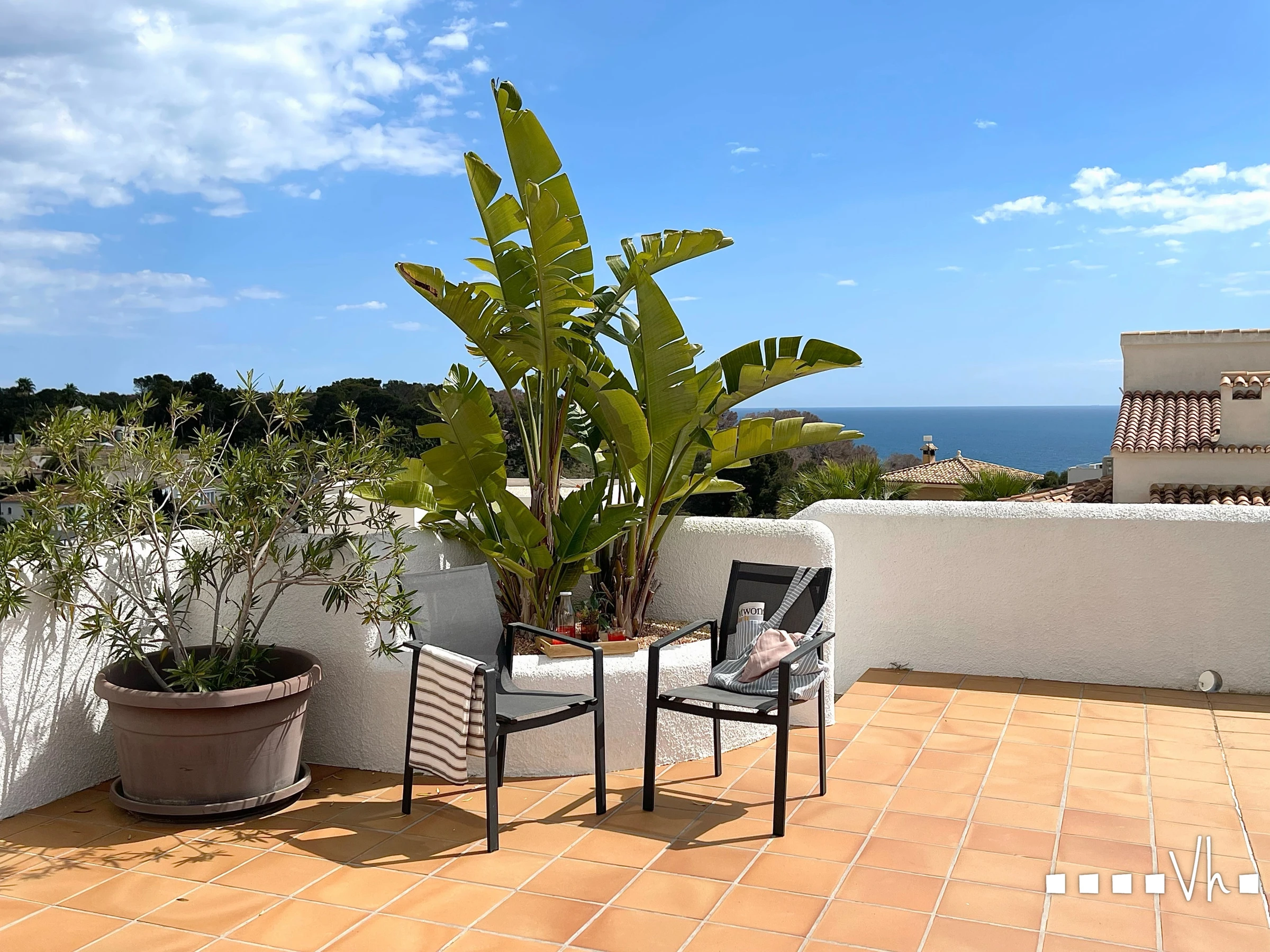 À l'étage supérieur se trouvent deux autres chambres et deux salles de bains, ainsi qu'une terrasse supplémentaire où vous pourrez admirer de magnifiques vues, prendre un bain de soleil ou vous détendre.