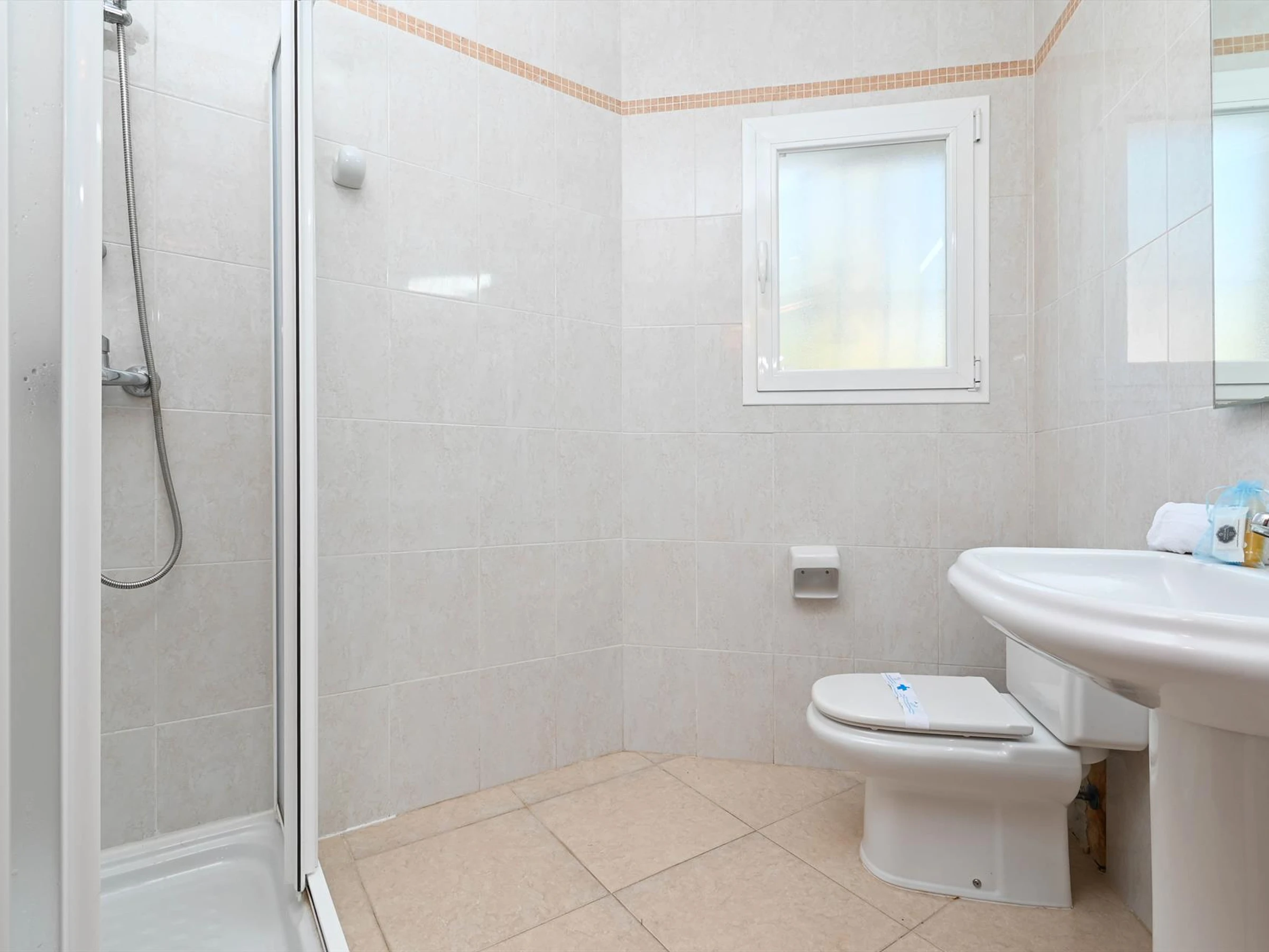 * salle de bain avec lavabo simple, douche et toiletteExtérieur de la villa