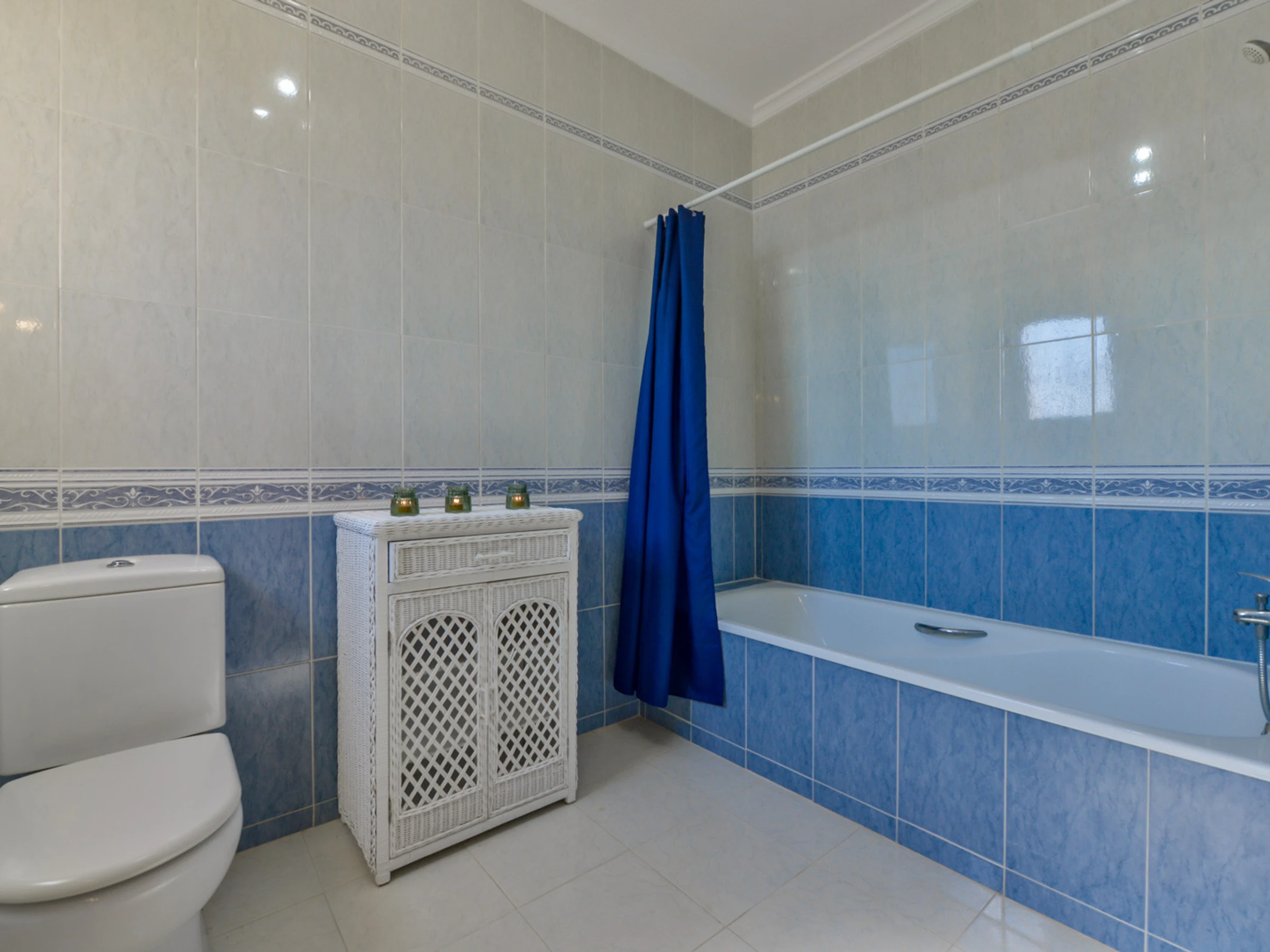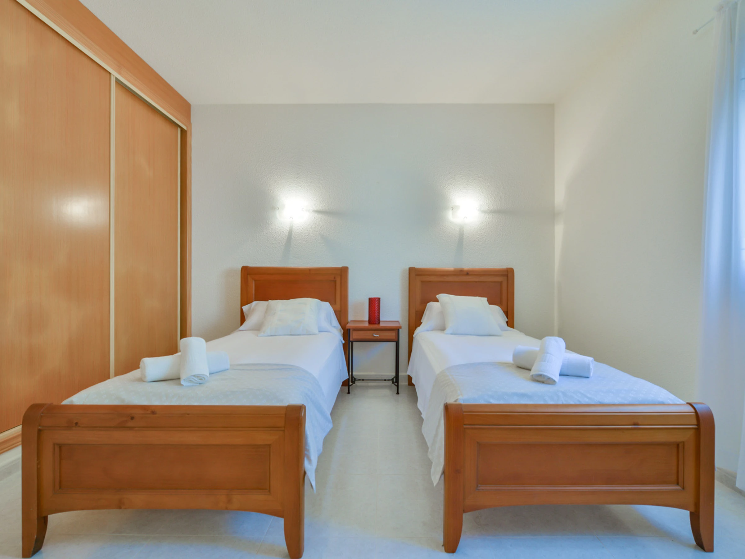 Mesurant 145 m², la villa est répartie sur deux étages reliés à l'intérieur par un escalier de 8 marches. Au premier étage, auquel on accède par une volée de deux marches, il y a une salle de bain avec douche, une chambre à coucher avec deux lits simples et climatisation, une deuxième chambre à coucher avec un lit double et climatisation. Une cuisine entièrement équipée avec lave-vaisselle, un salon avec cheminée décorative et climatisation. En montant l'escalier interne, on accède à l'étage supérieur qui comprend une chambre à coucher avec un lit double, la climatisation et une salle de bain attenante avec baignoire.