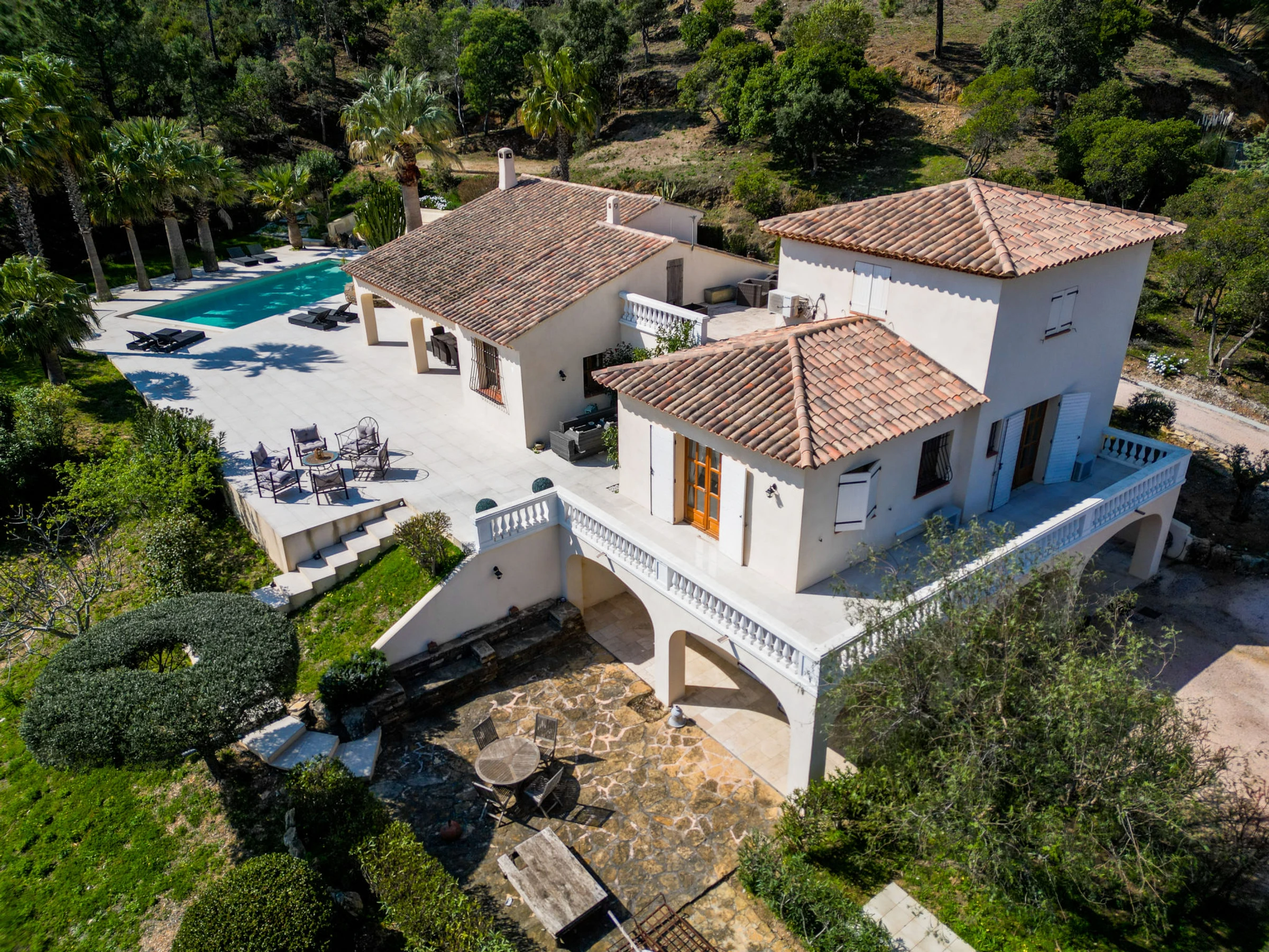 Bormes-Les-Mimosas: Belle villa accueillante, confortable "Villa Resedas", de 2 étages. Situation tranquille, à 4 km de la mer, à 4 km de la plage, orientée est. A usage privé: terrain 3 ha, piscine (profondeur 80 - 200 cm, disponibilité saisonnière: [hidden] - [hidden] avec alarme de sécurité. Pool house avec réfrigérateur et plaque de cuisson, terrain de pétanque, barbecue, entretien de la piscine par le propriétaire/jardinier. Accès en voiture par un chemin étroite de 750 m de long. Place de parking sur le terrain, garage individuel. Supermarché 3 km, boulangerie 4 km, arrêt de bus "Les Pins Fontète" 3 km, plage de sable "du Lavandou". Attractions à proximité: Saint Tropez 40 km, Magic World 25 km, Parc Olbius Riquier 20 km, Le Jardin des Méditerranées 18 km. Région de randonnées: Sentiers du Littoral. Veuillez noter: voiture recommandée. Le propriétaire n'accepte pas les groupes de jeunes. La remise des clés a lieu à l’agence de Le Lavandou, 5 km.