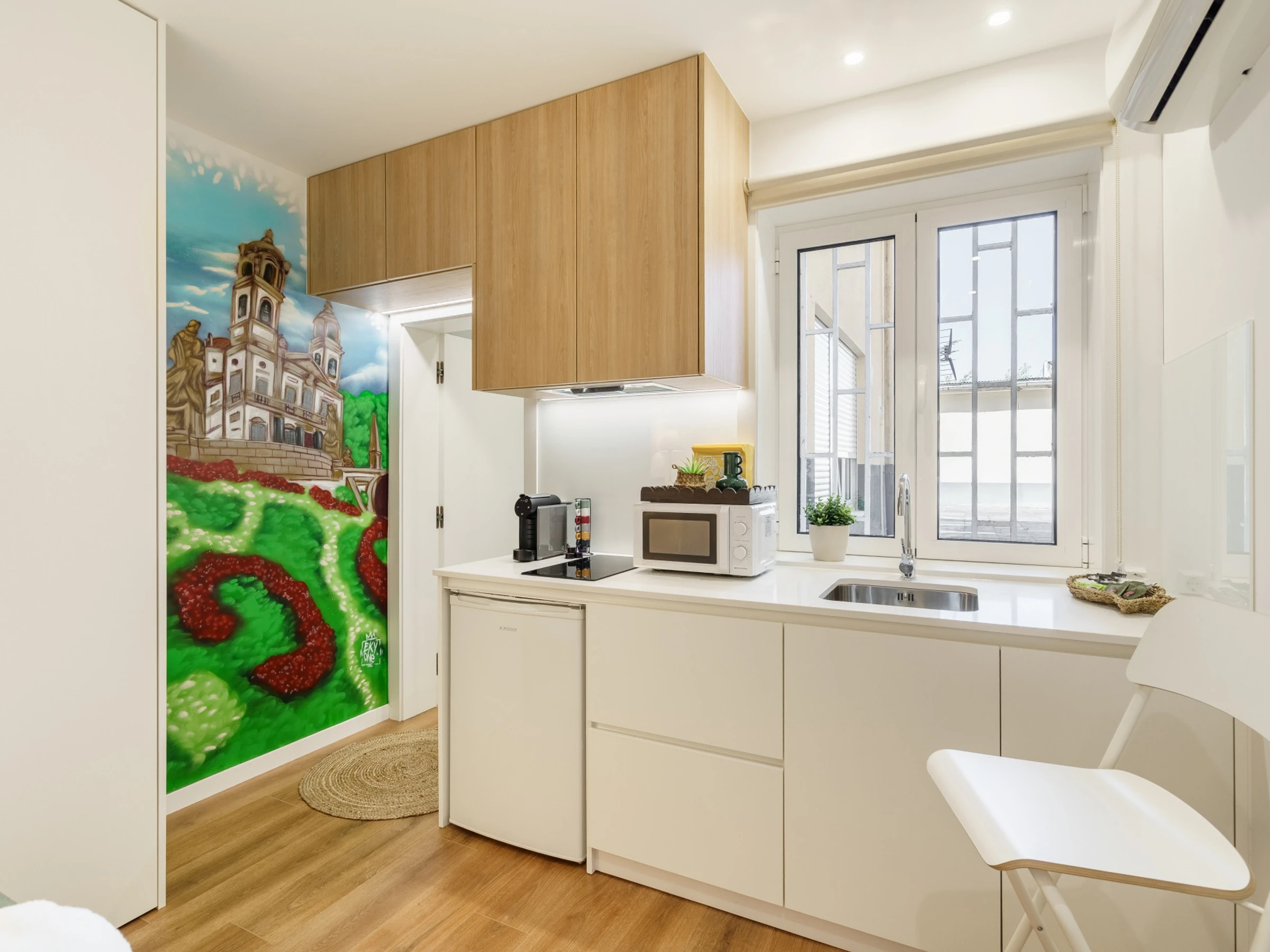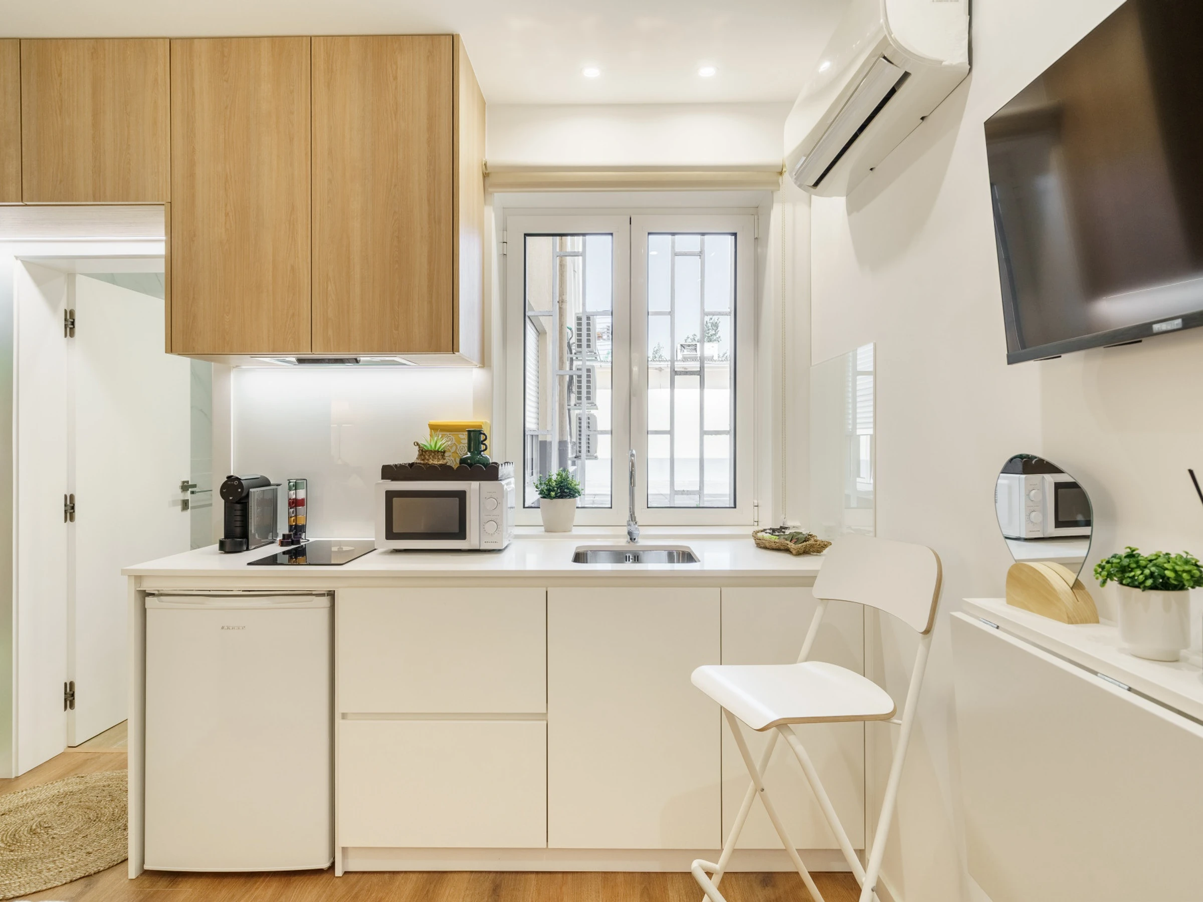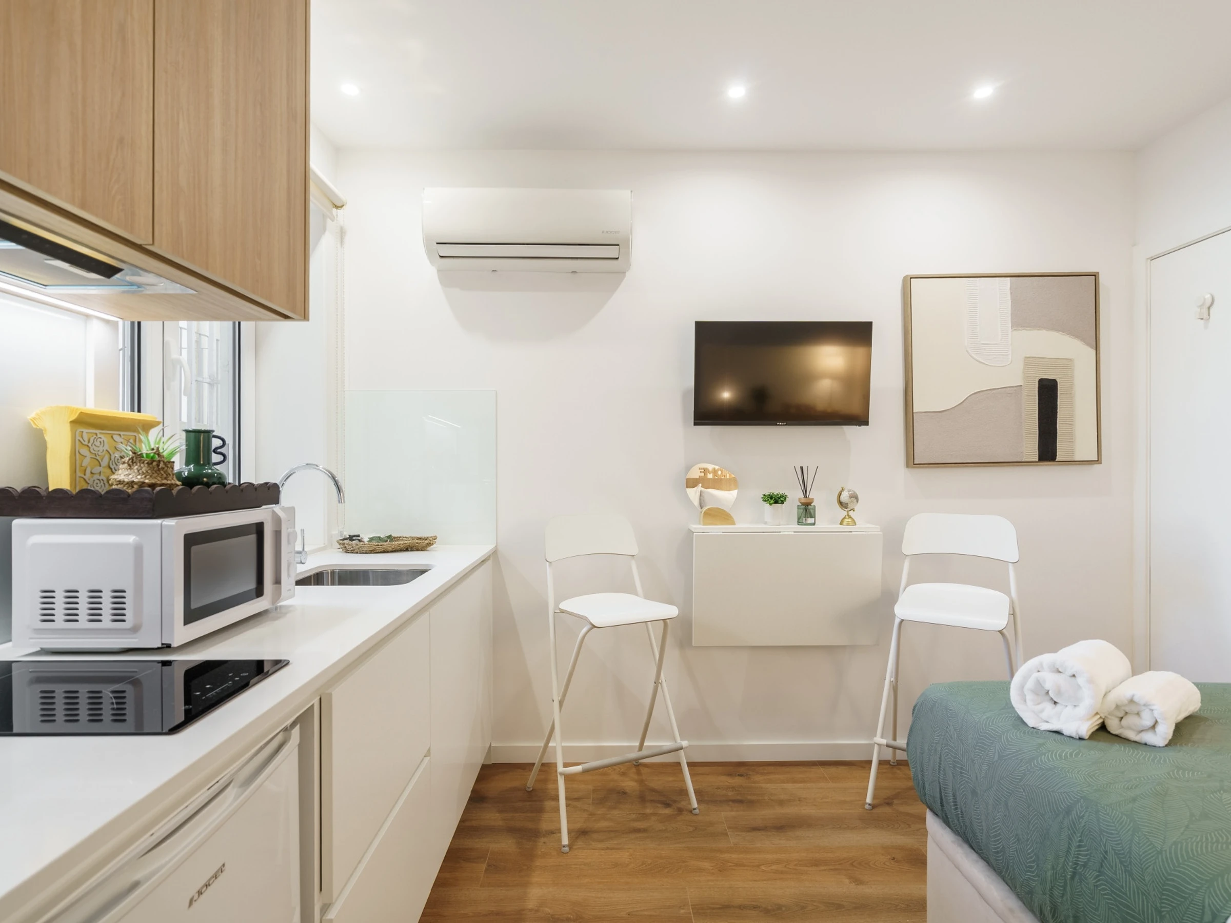 La cuisine américaine, à vitrocéramique, est équipée avec réfrigérateur, micro-ondes, vaisselle/couverts, ustensiles/cuisine, cafetière et cuisinière.