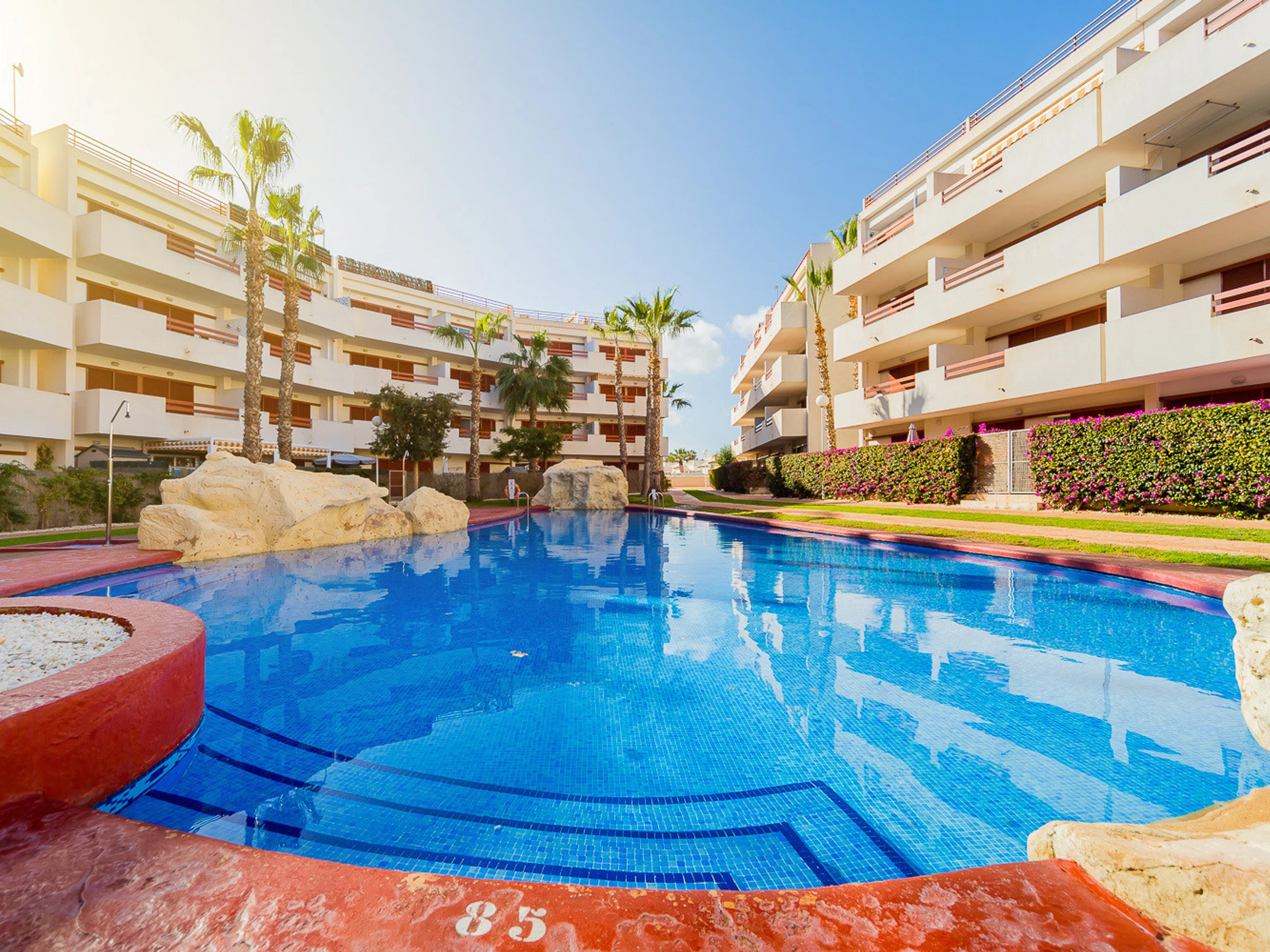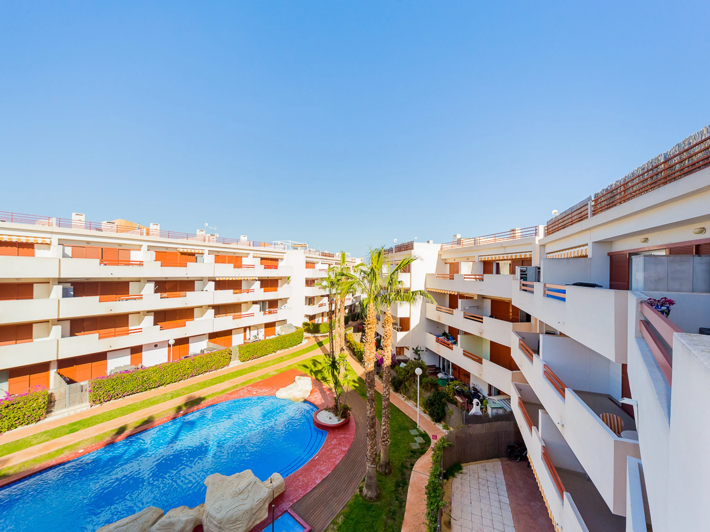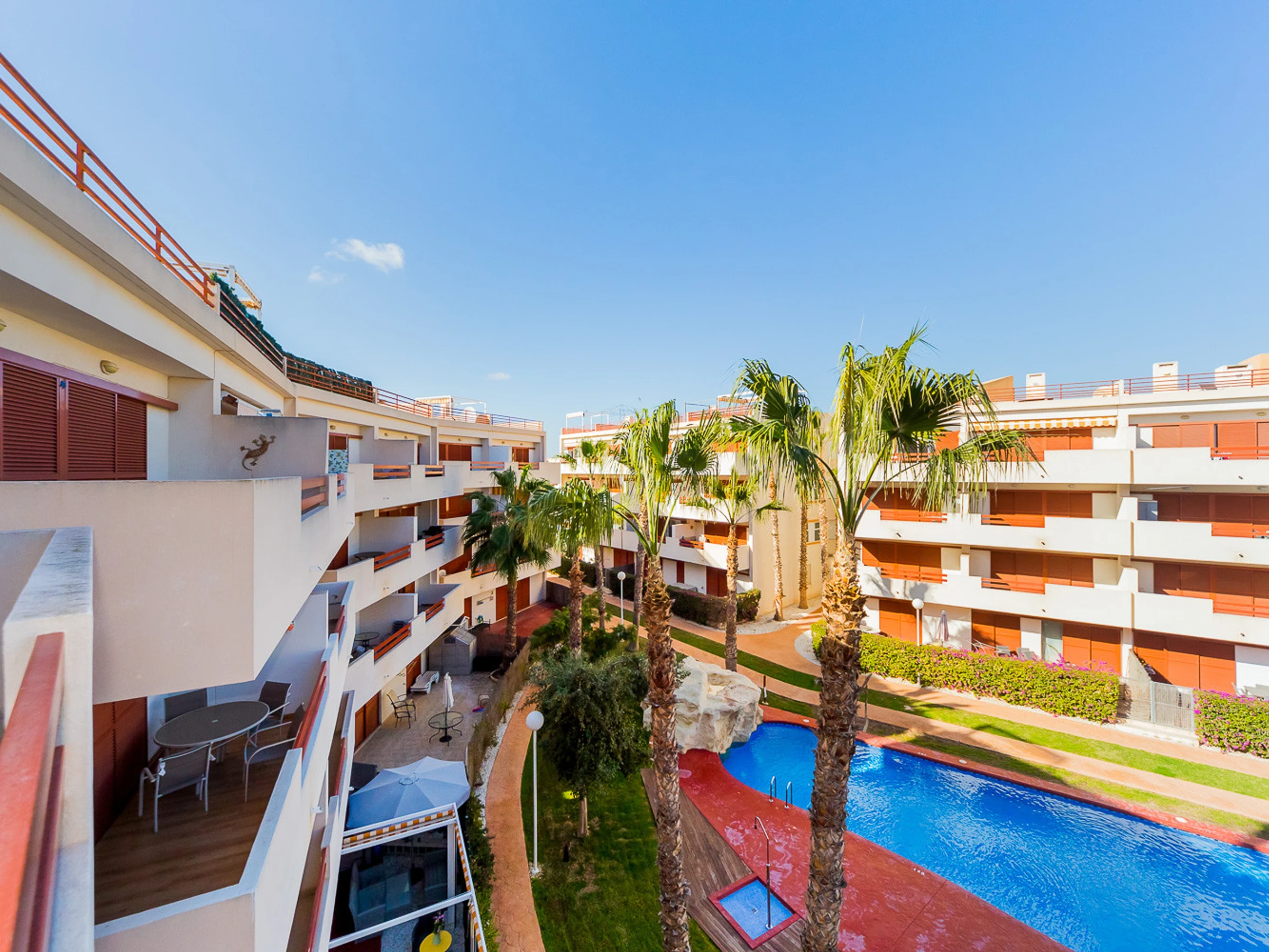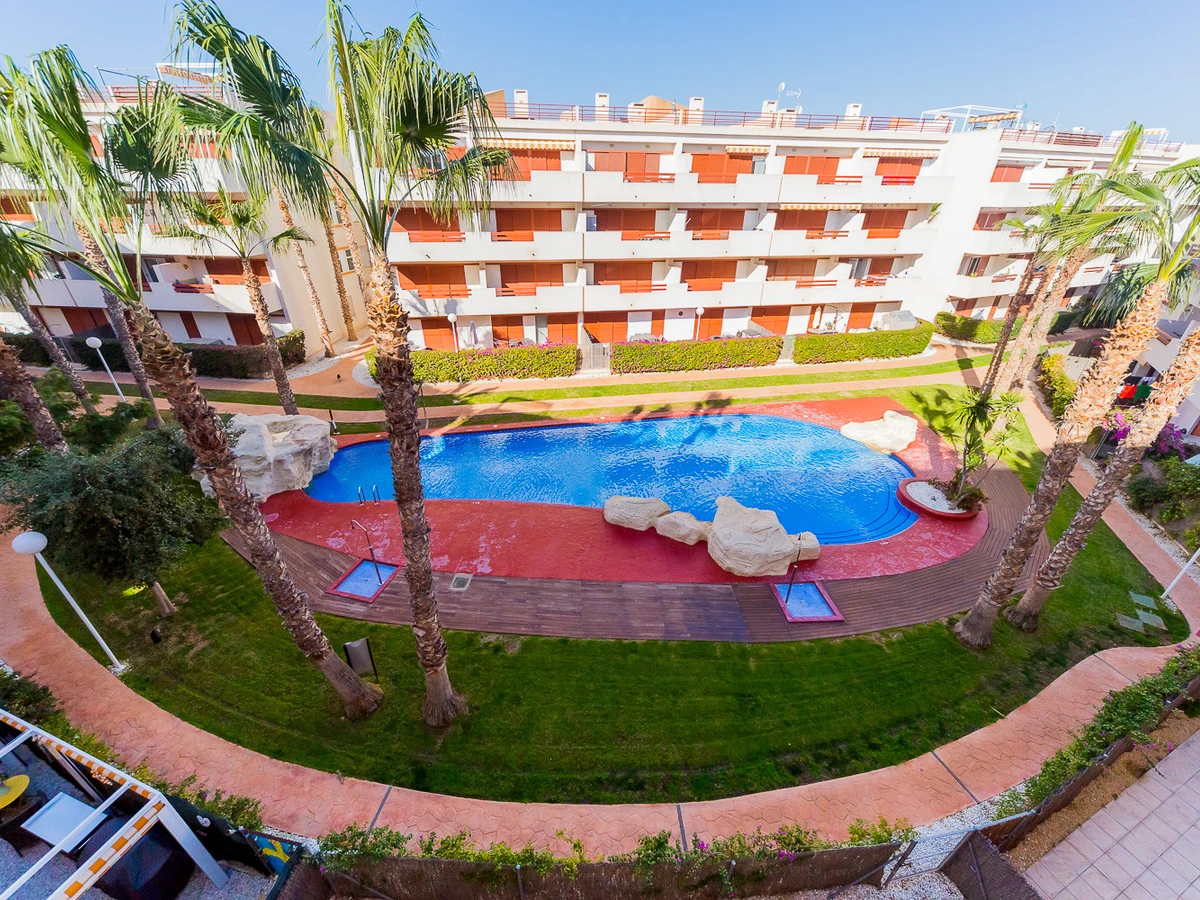 Appartement moderne à louer dans une belle urbanisation gardée avec espace vert et deux piscines dans le quartier de Playa Flamenca. La superficie totale de l'appartement est de 82 m2, se compose de deux chambres avec leurs propres salles de bains, un salon, une cuisine américaine, un local technique et une terrasse avec vue sur la zone d'urbanisation et la piscine. A l'étage il y a un solarium privé avec vue sur la mer et la piscine. Il y a un barbecue ! L'appartement dispose de tout ce dont vous avez besoin pour un séjour confortable et relaxant : mobilier neuf (lits avec matelas orthopédiques), électroménager (dont lave-vaisselle et lave-linge, cafetière, presse-agrumes et grille-pain), vaisselle, linge de lit et serviettes. Sur la terrasse et dans le solarium il y a du mobilier d'été, des chaises longues et des chaises pliantes. Climatisation centrale, TV avec Smart-TV. Il y a une place de parking sur le territoire du complexe. Possibilité d'hébergement - jusqu'à 4 personnes (pas d'animaux !). Il est interdit de fumer dans l'appartement ! Le quartier dispose d'une infrastructure bien développée : des bars et des restaurants sont situés à proximité, les grands supermarchés LIDL, Super COR et Carrefour sont accessibles à pied, le boulevard La Zenia est à environ 20 minutes à pied. A proximité se trouvent un parc d'attractions pour enfants, un minigolf et une piste de karting. La mer est à environ 500 mètres, mais la plage est un peu plus loin, à environ 400-500 mètres. Les voisins sont pour la plupart des étrangers anglophones.
