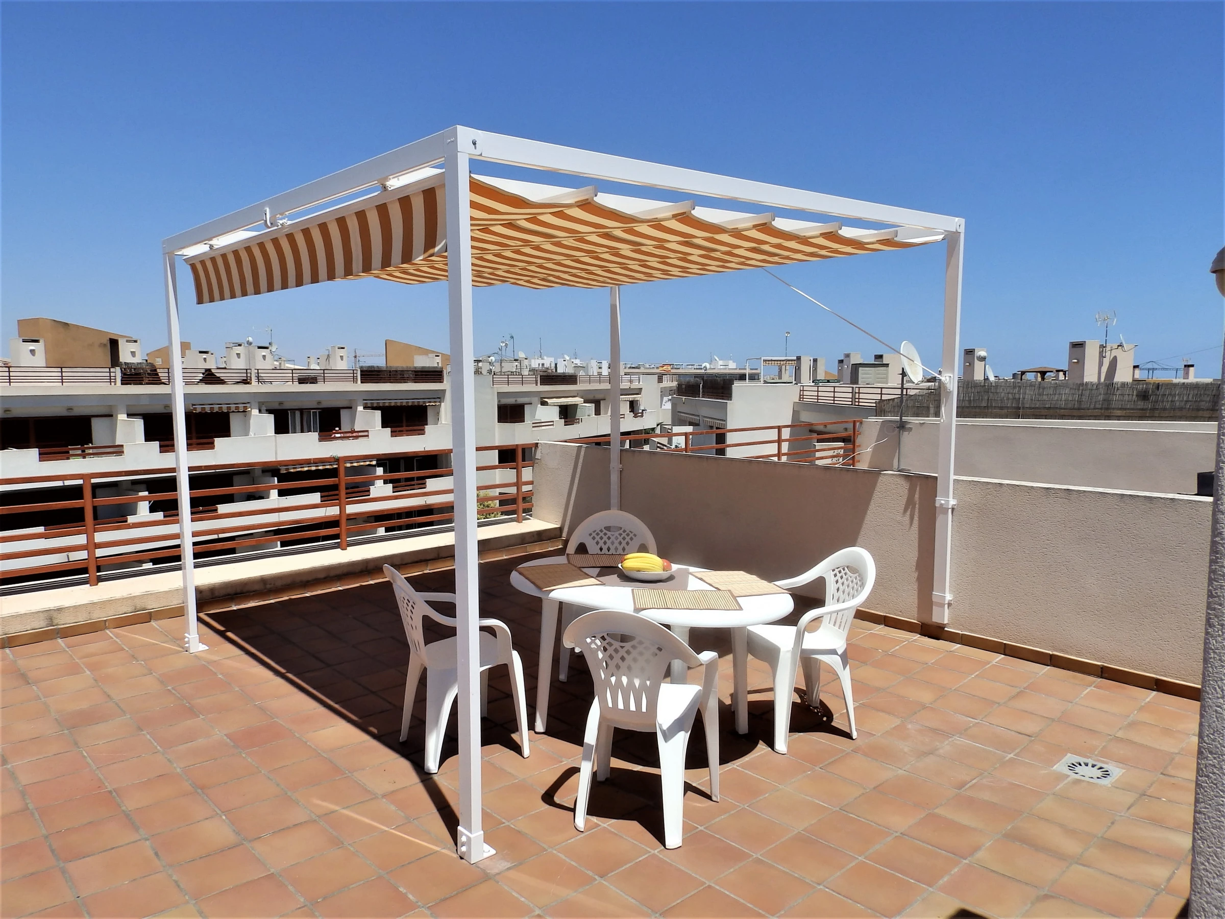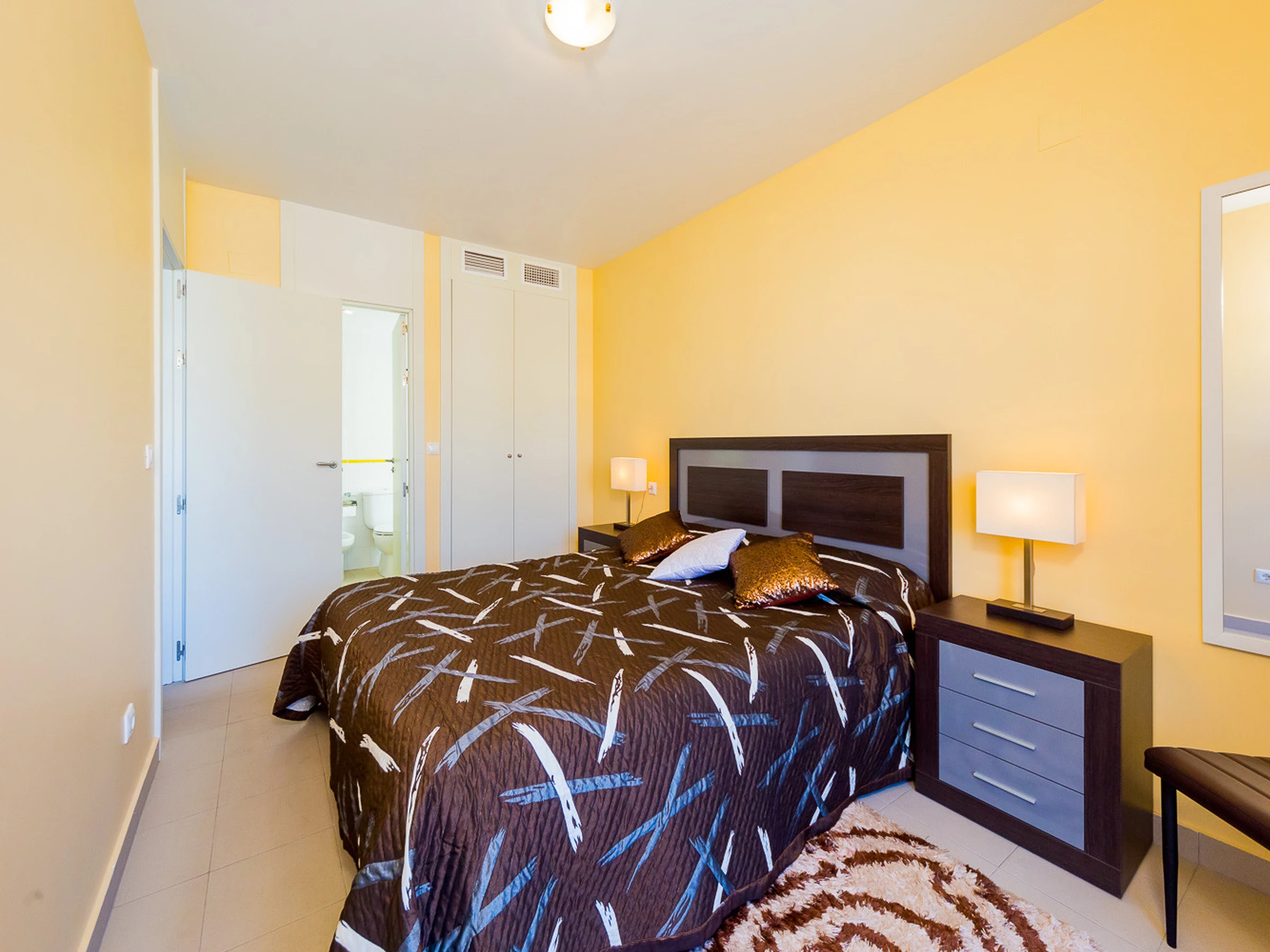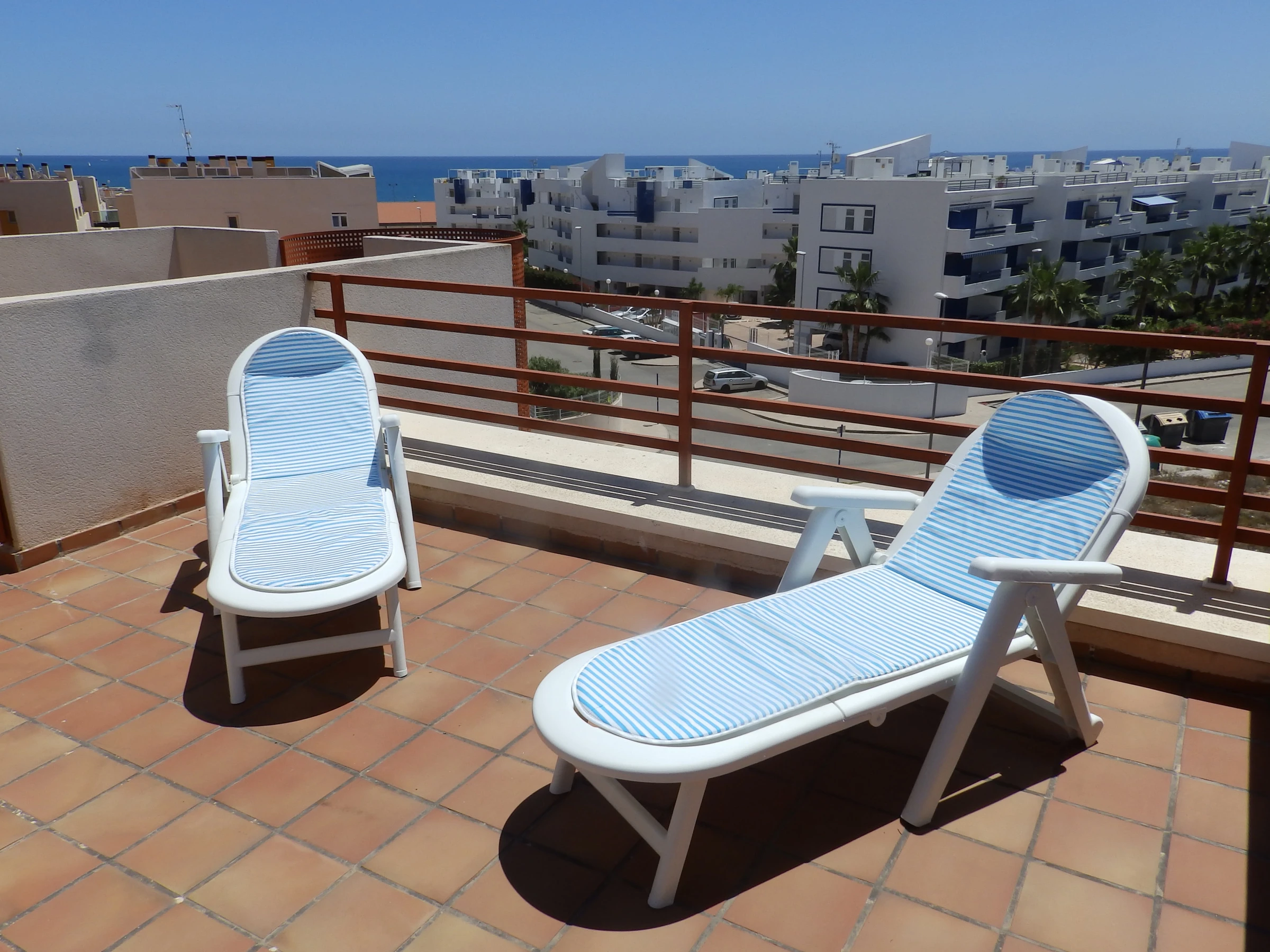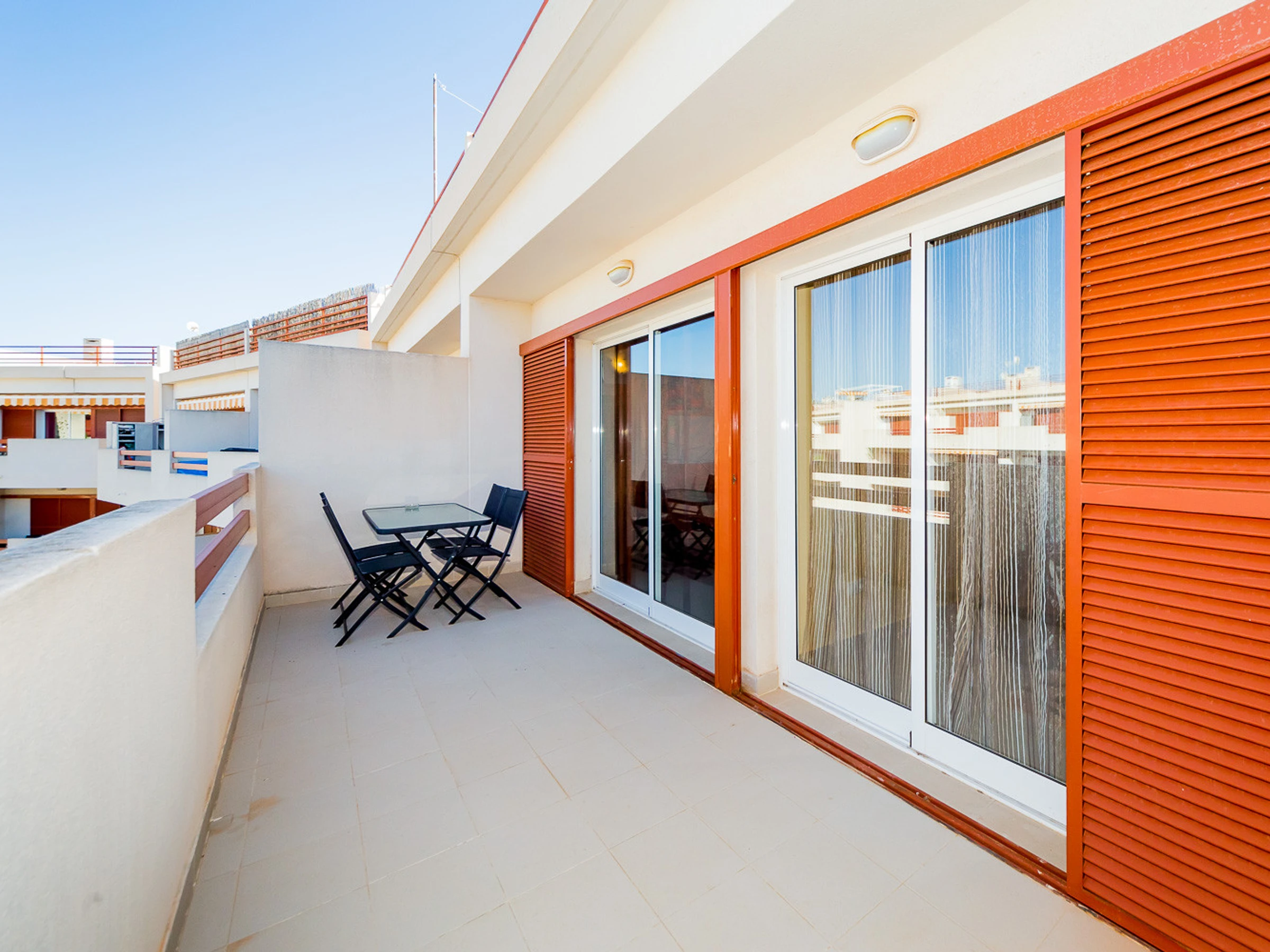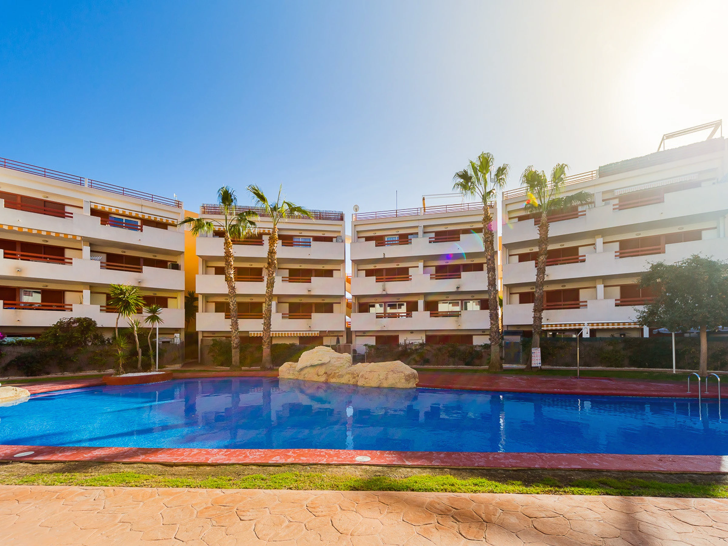 Appartement moderne à louer dans une belle urbanisation gardée avec espace vert et deux piscines dans le quartier de Playa Flamenca. La superficie totale de l'appartement est de 82 m2, se compose de deux chambres avec leurs propres salles de bains, un salon, une cuisine américaine, un local technique et une terrasse avec vue sur la zone d'urbanisation et la piscine. A l'étage il y a un solarium privé avec vue sur la mer et la piscine. Il y a un barbecue ! L'appartement dispose de tout ce dont vous avez besoin pour un séjour confortable et relaxant : mobilier neuf (lits avec matelas orthopédiques), électroménager (dont lave-vaisselle et lave-linge, cafetière, presse-agrumes et grille-pain), vaisselle, linge de lit et serviettes. Sur la terrasse et dans le solarium il y a du mobilier d'été, des chaises longues et des chaises pliantes. Climatisation centrale, TV avec Smart-TV. Il y a une place de parking sur le territoire du complexe. Possibilité d'hébergement - jusqu'à 4 personnes (pas d'animaux !). Il est interdit de fumer dans l'appartement ! Le quartier dispose d'une infrastructure bien développée : des bars et des restaurants sont situés à proximité, les grands supermarchés LIDL, Super COR et Carrefour sont accessibles à pied, le boulevard La Zenia est à environ 20 minutes à pied. A proximité se trouvent un parc d'attractions pour enfants, un minigolf et une piste de karting. La mer est à environ 500 mètres, mais la plage est un peu plus loin, à environ 400-500 mètres. Les voisins sont pour la plupart des étrangers anglophones.
