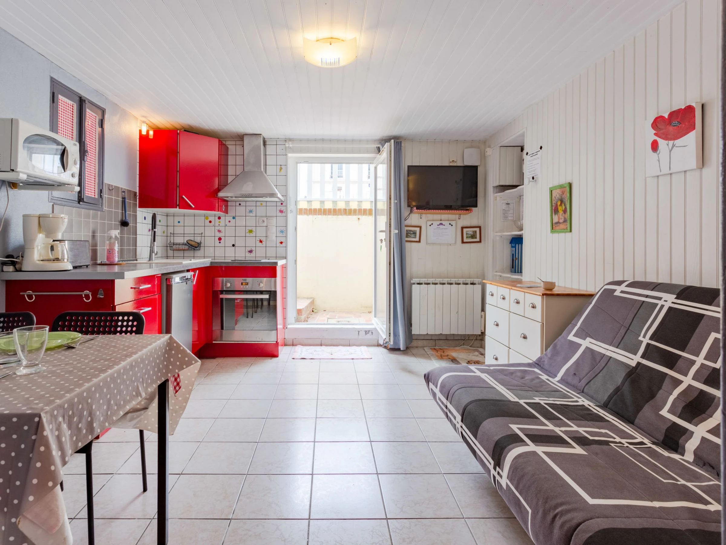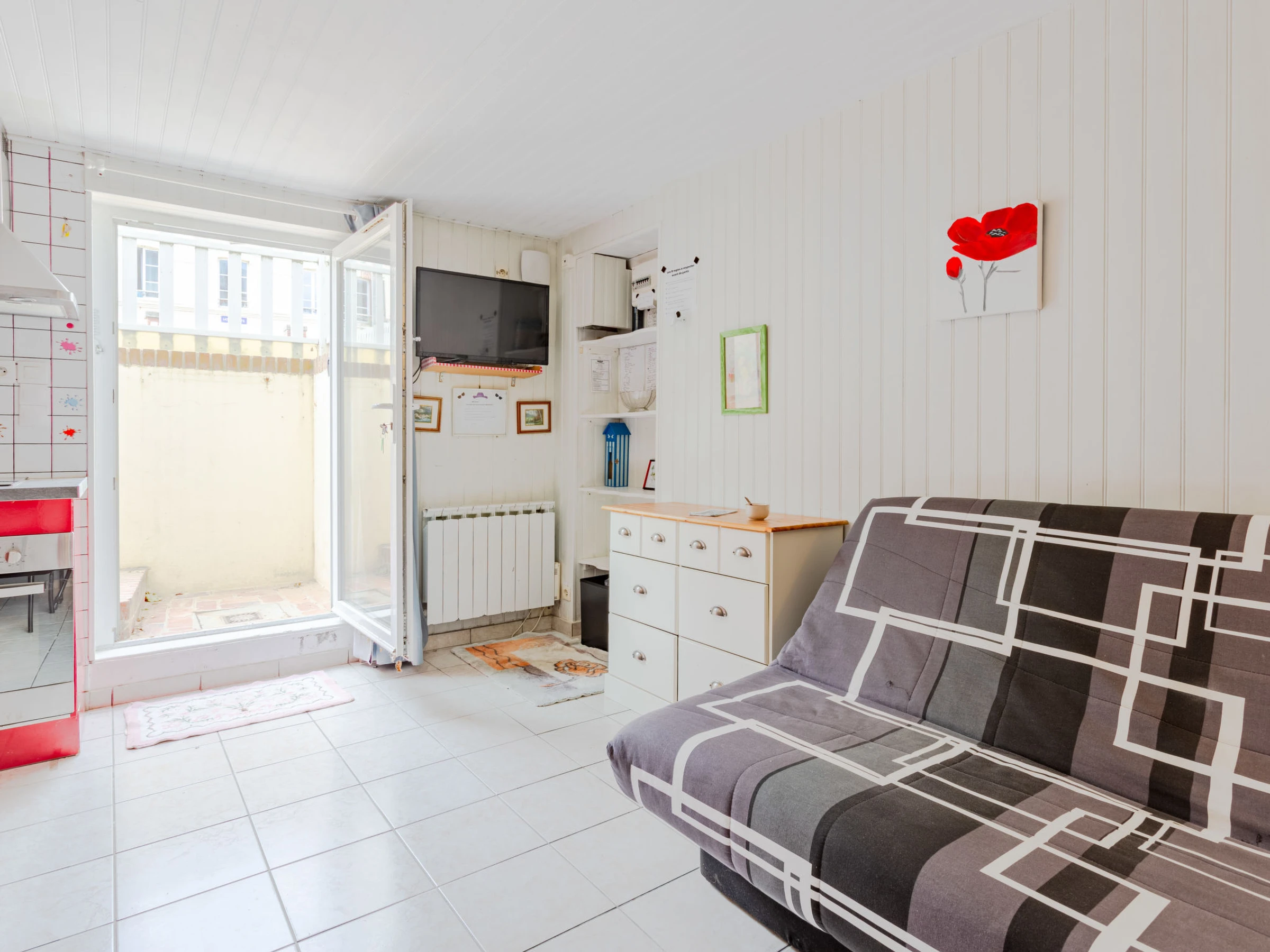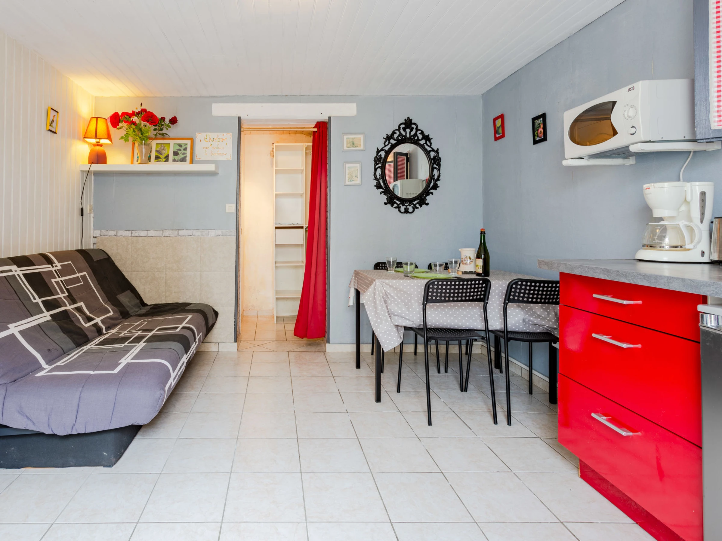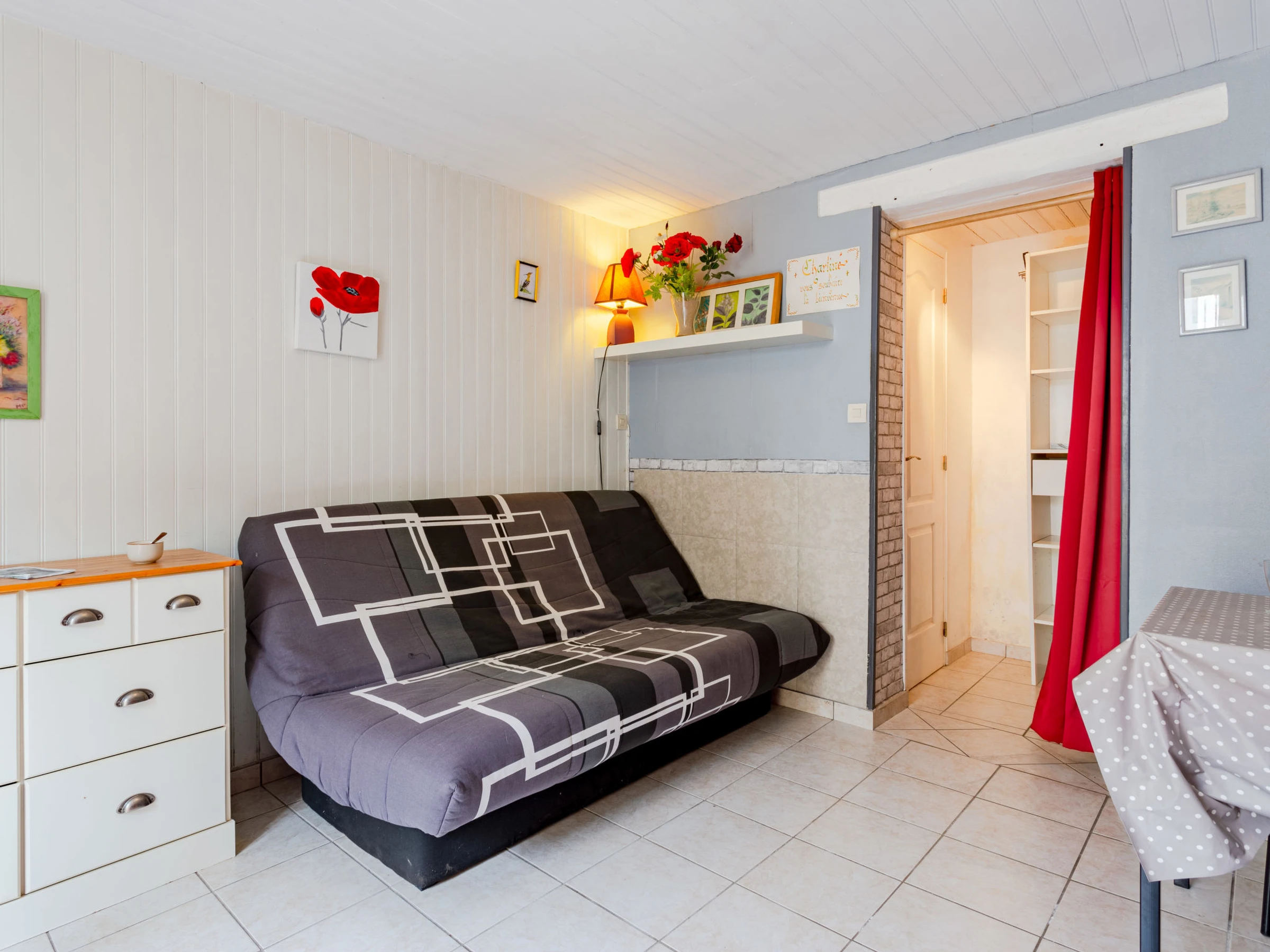 Studio 22 m2, à l'entresol, situation ouest. Séjour/salle à manger avec 1 divan-lit double (140 cm, longueur 190 cm), TV (écran plat). Coin cuisine (2 plaques vitrocéramiques, grille-pain, bouilloire électrique, micro-ondes, cafetière électrique). Douche, WC séparé. Chauffage électrique. Place de parking No XX. Veuillez noter: détecteur de fumée. Annonce d'un particulier (art 155, IV du CGI).