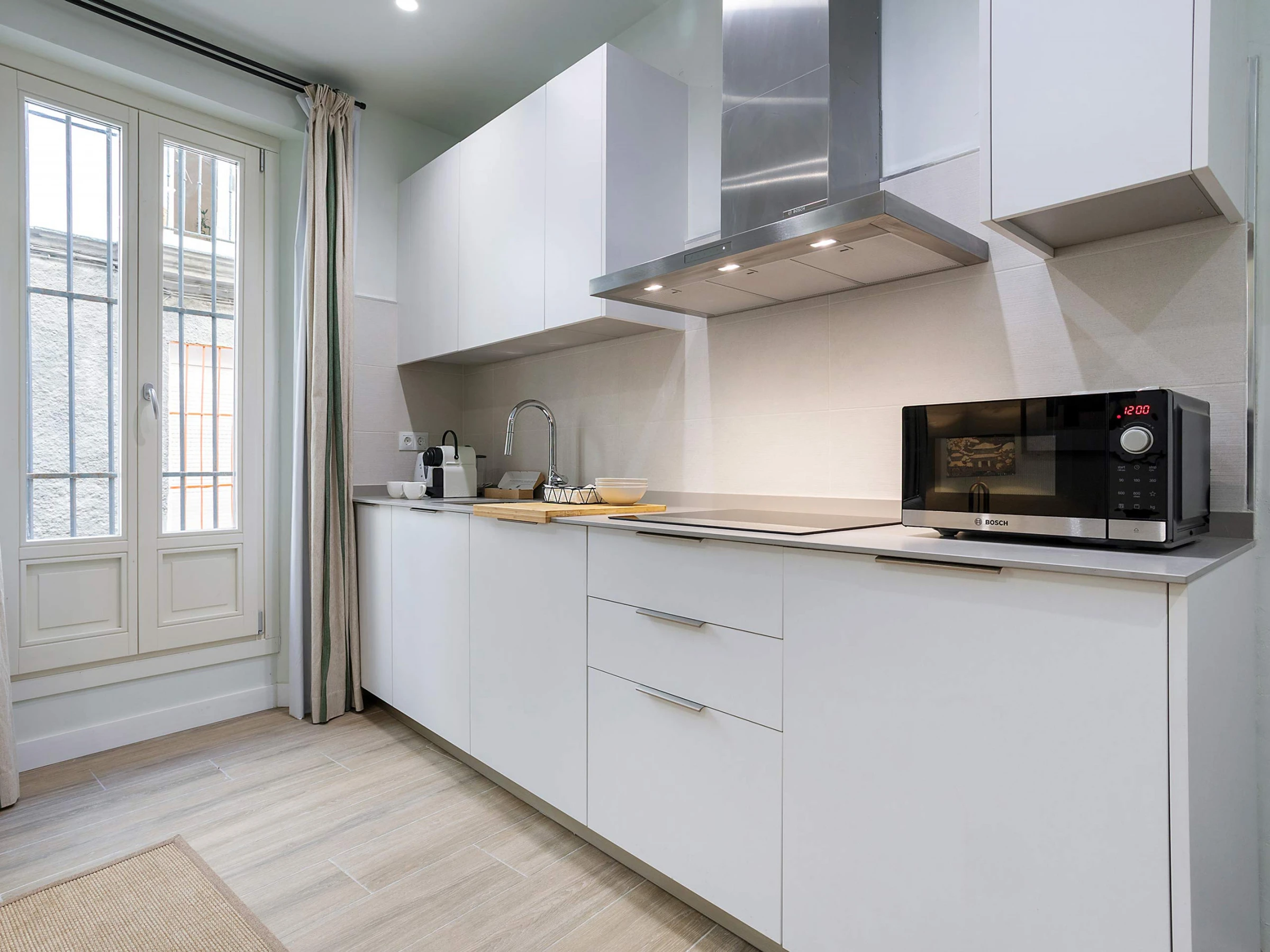 La cuisine, est équipée avec réfrigérateur, micro-ondes, congélateur, vaisselle/couverts, cafetière, grille pain et presse-agrumes.
