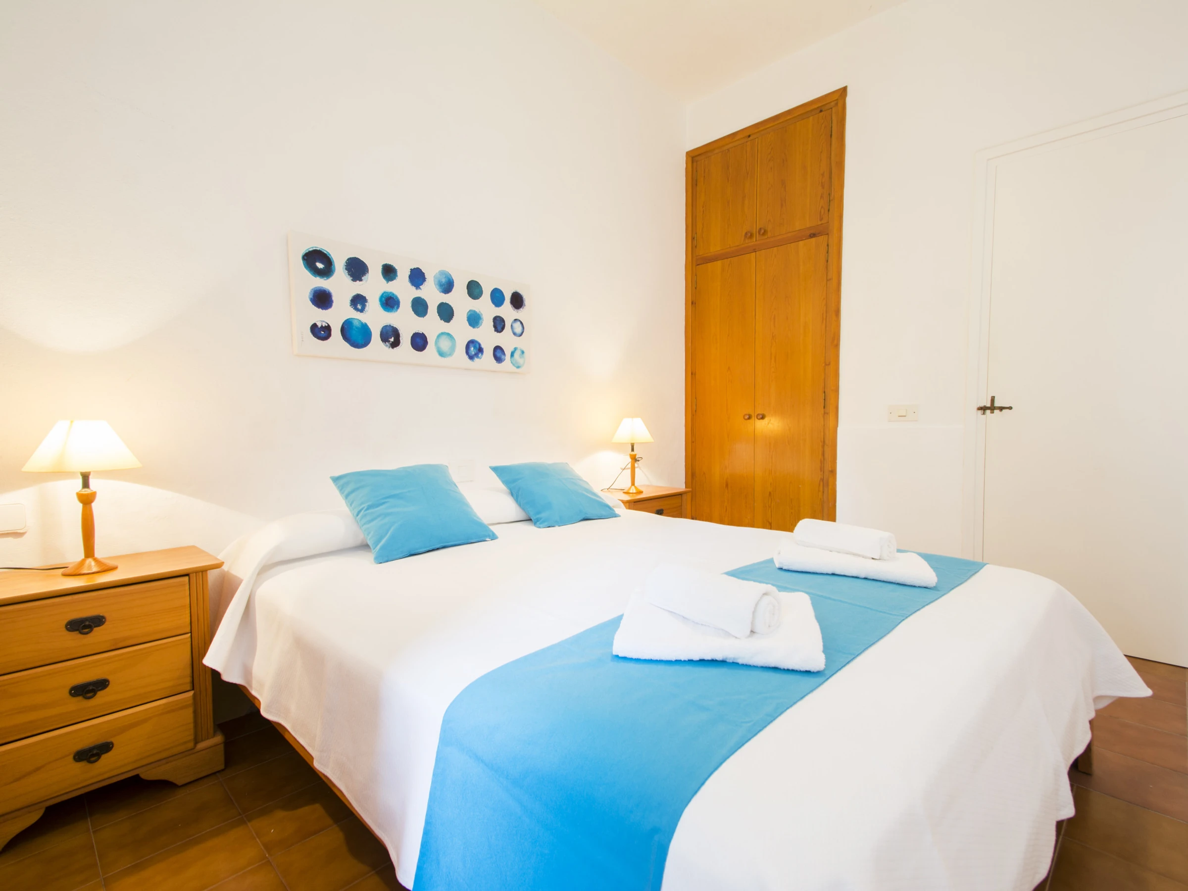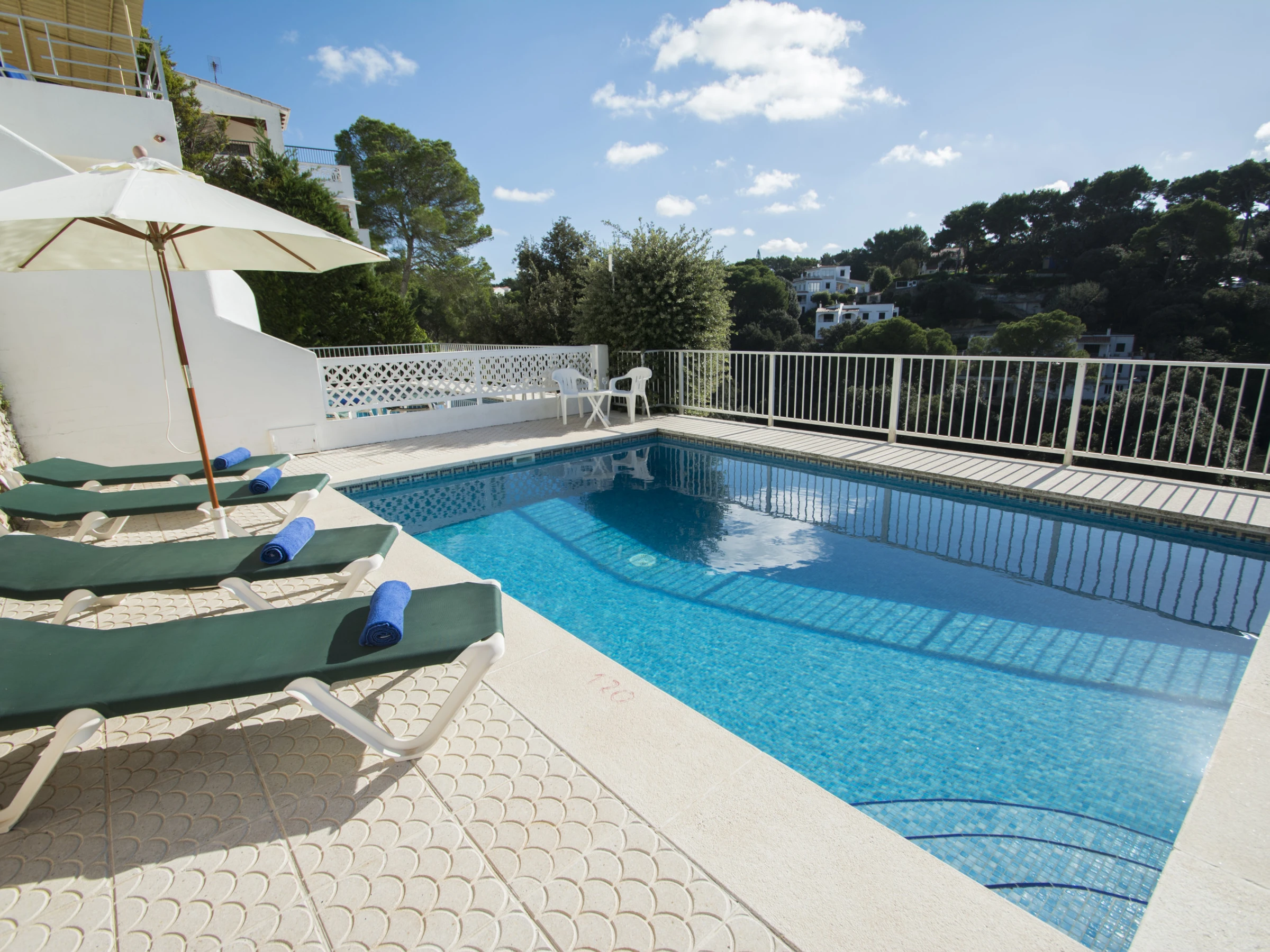The apartment for rent in Menorca has a private pool, three double bedrooms, two bathrooms (one of them suite), living room, kitchen, two large terrace with barbecue and parking space.