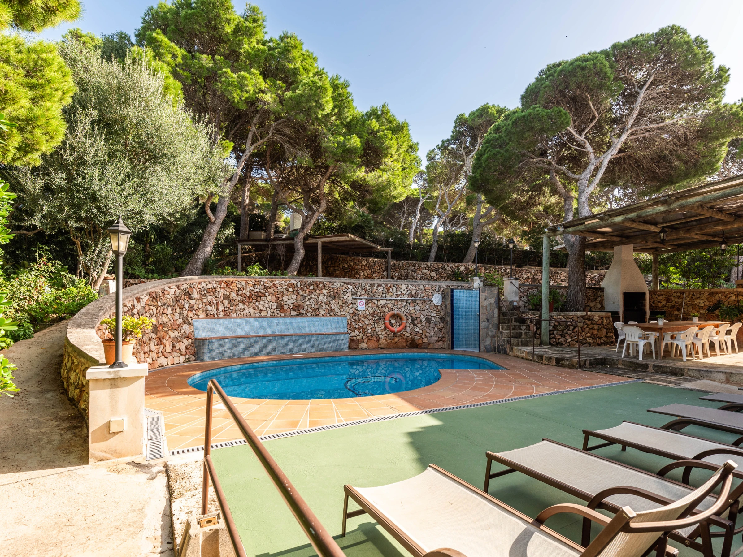 Extérieur : Zone de barbecue couverte, spacieuse et agréable située à côté de la piscine. Solarium avec transats et piscine en forme de rein. Douche extérieure à côté de la piscine. Parking couvert pour 3 voitures.