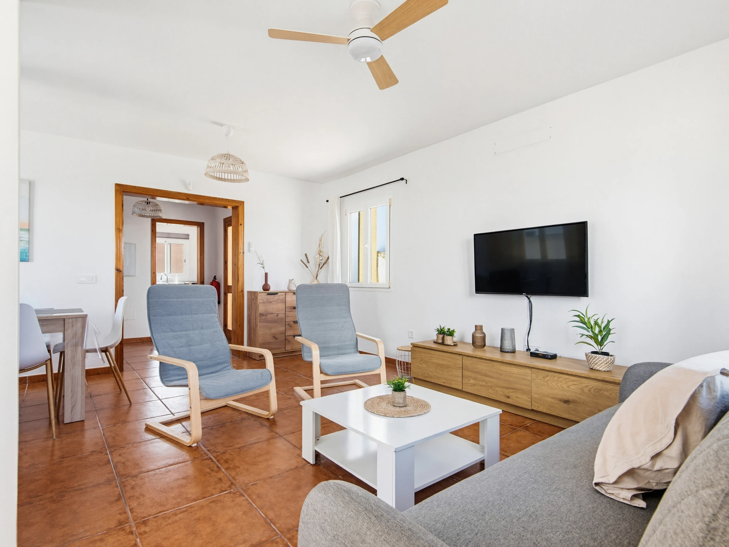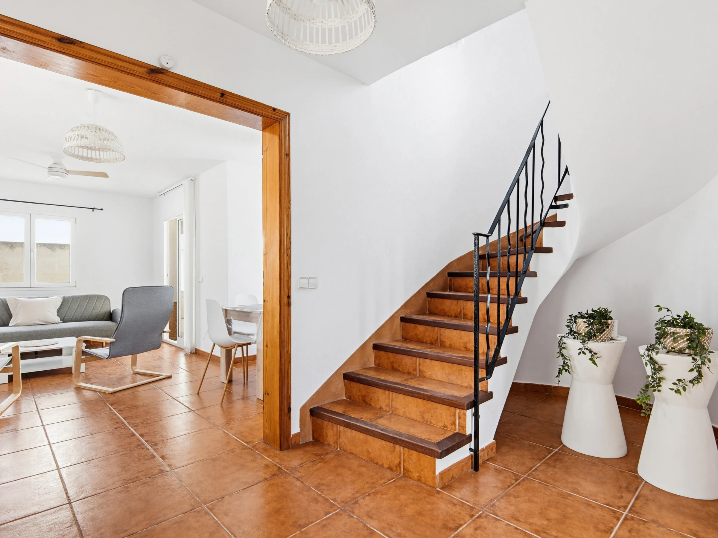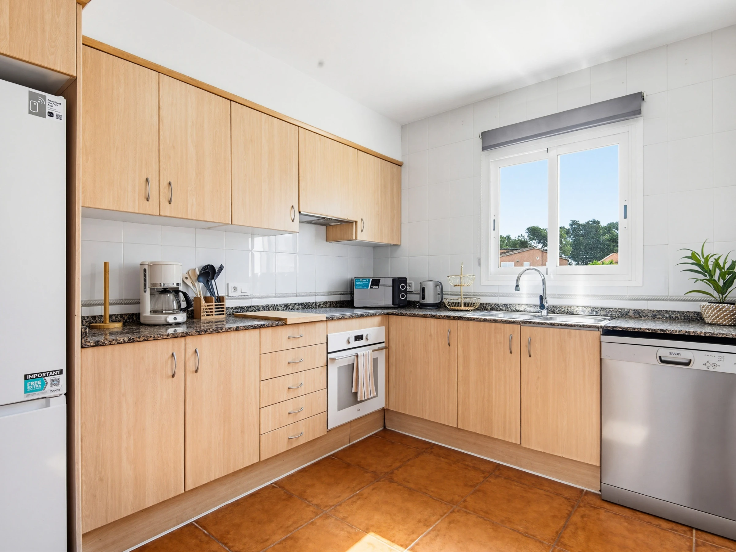 Au rez-de-chaussée se trouve le lumineux salon-salle à manger, équipé de canapés confortables, table et chaises, Smart TV, climatisation et connexion wifi. À cet étage se trouvent également une salle de bain avec douche, une buanderie et une cuisine indépendante entièrement équipée avec plaque vitrocéramique, four électrique, lave-vaisselle, micro-ondes, bouilloire, cafetière à capsules, cafetière italienne et batterie de cuisine complète.