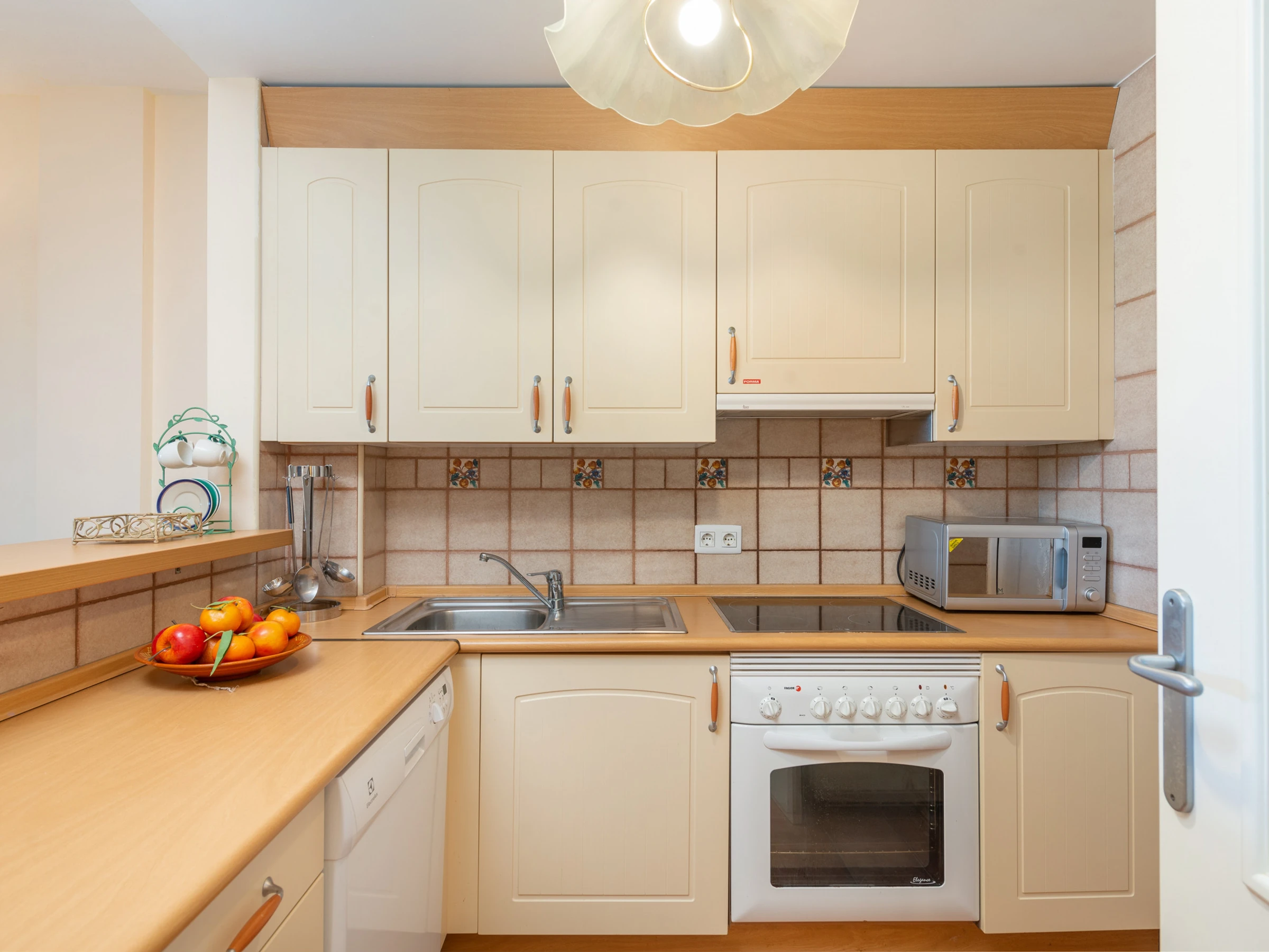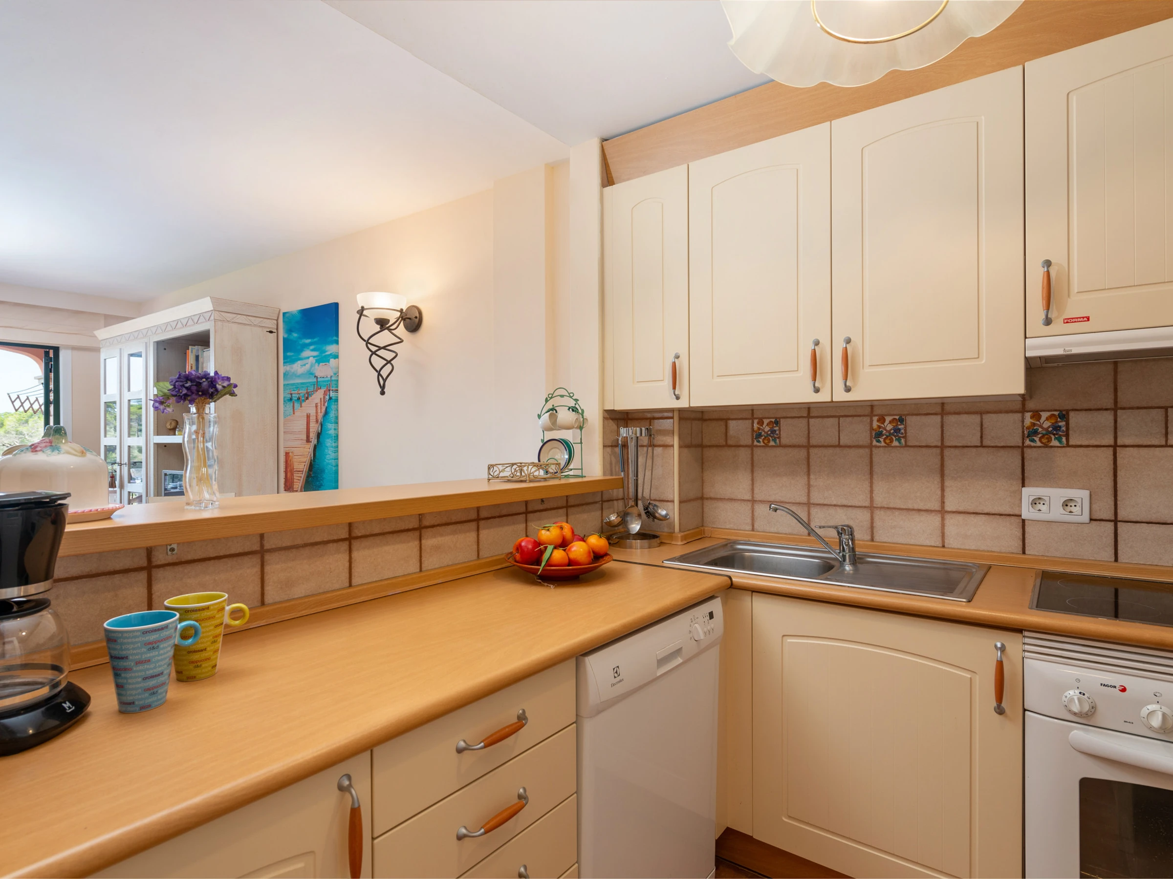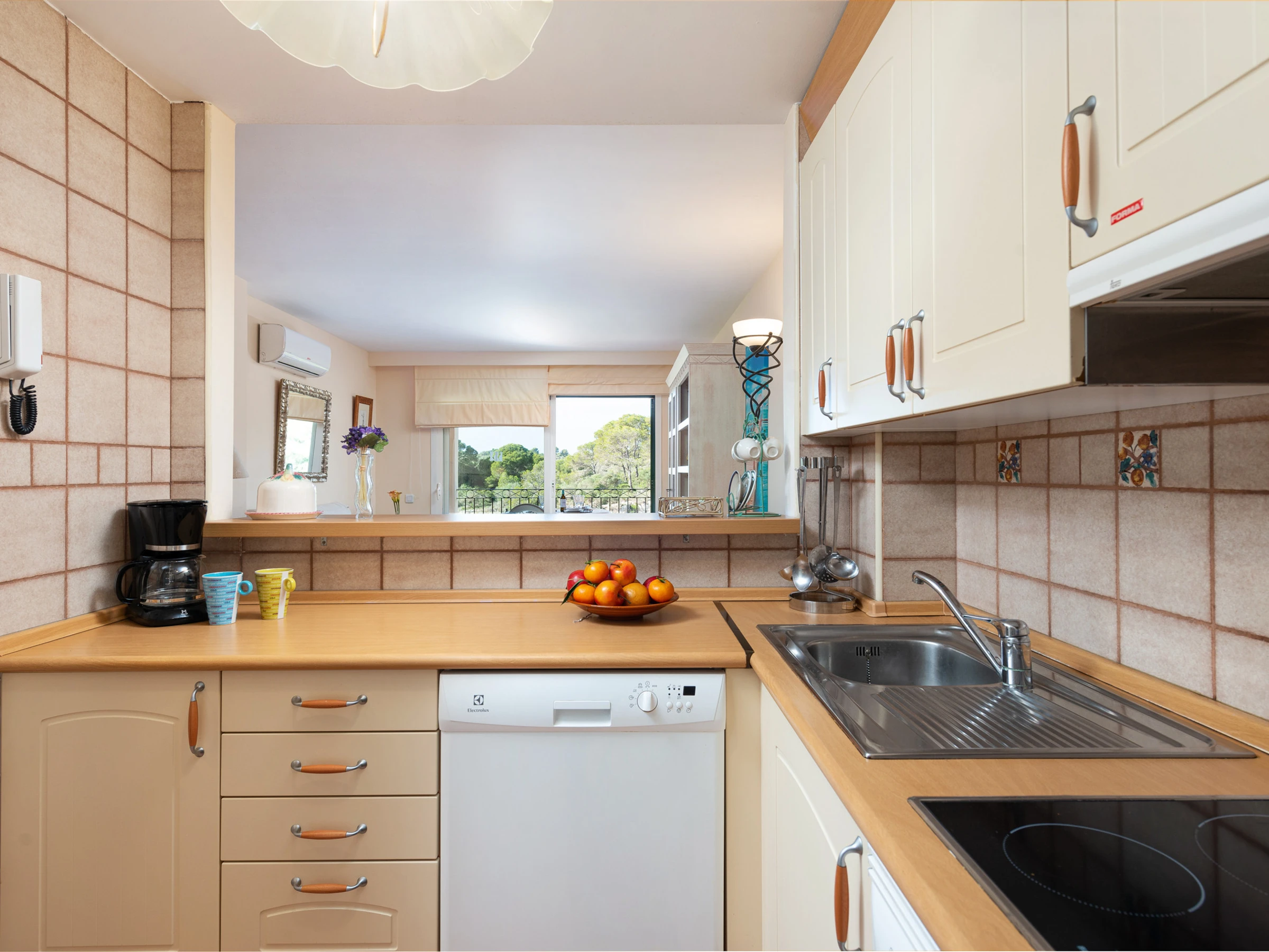 La cuisine, est équipée avec micro-ondes, congélateur, lave-vaisselle, cafetière et grille pain.