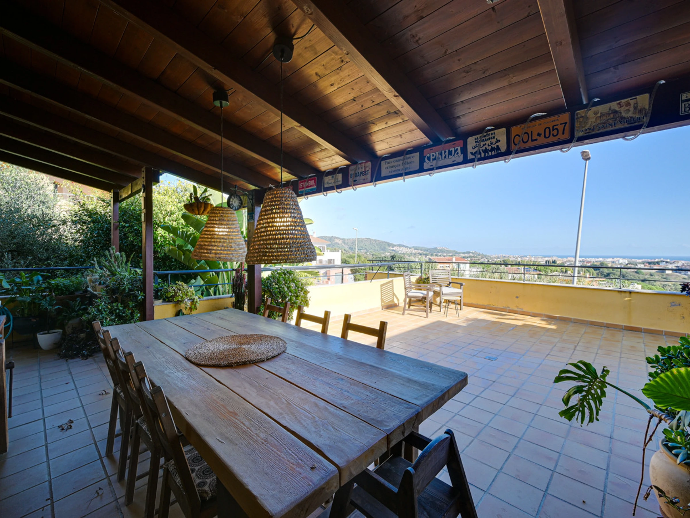 À cet étage, il y a l'espace extérieur avec vue sur la mer, piscine privée, hamacs, barbecue et deuxième véranda couverte avec table à manger.