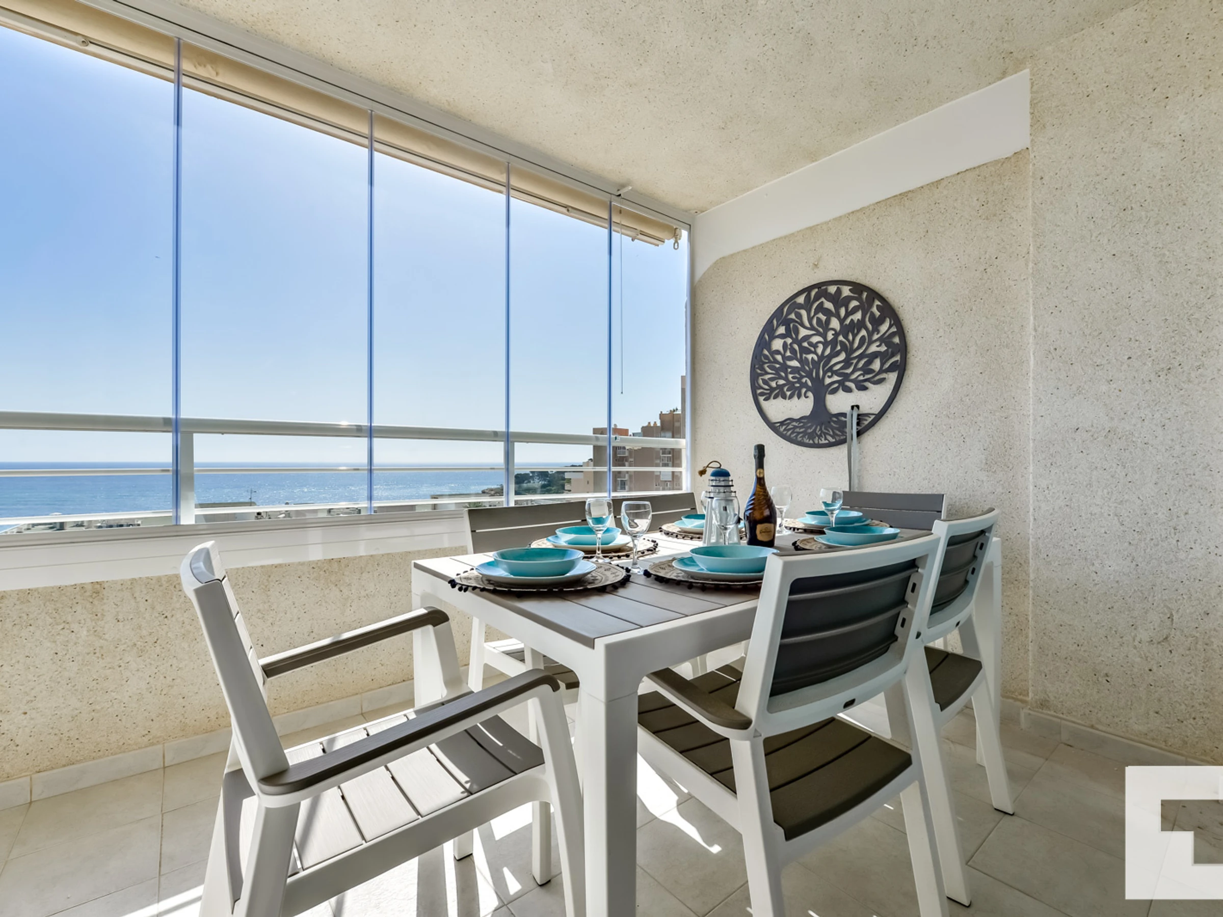 🪟 Grande terrasse vitrée et meublée avec vue sur la mer.
