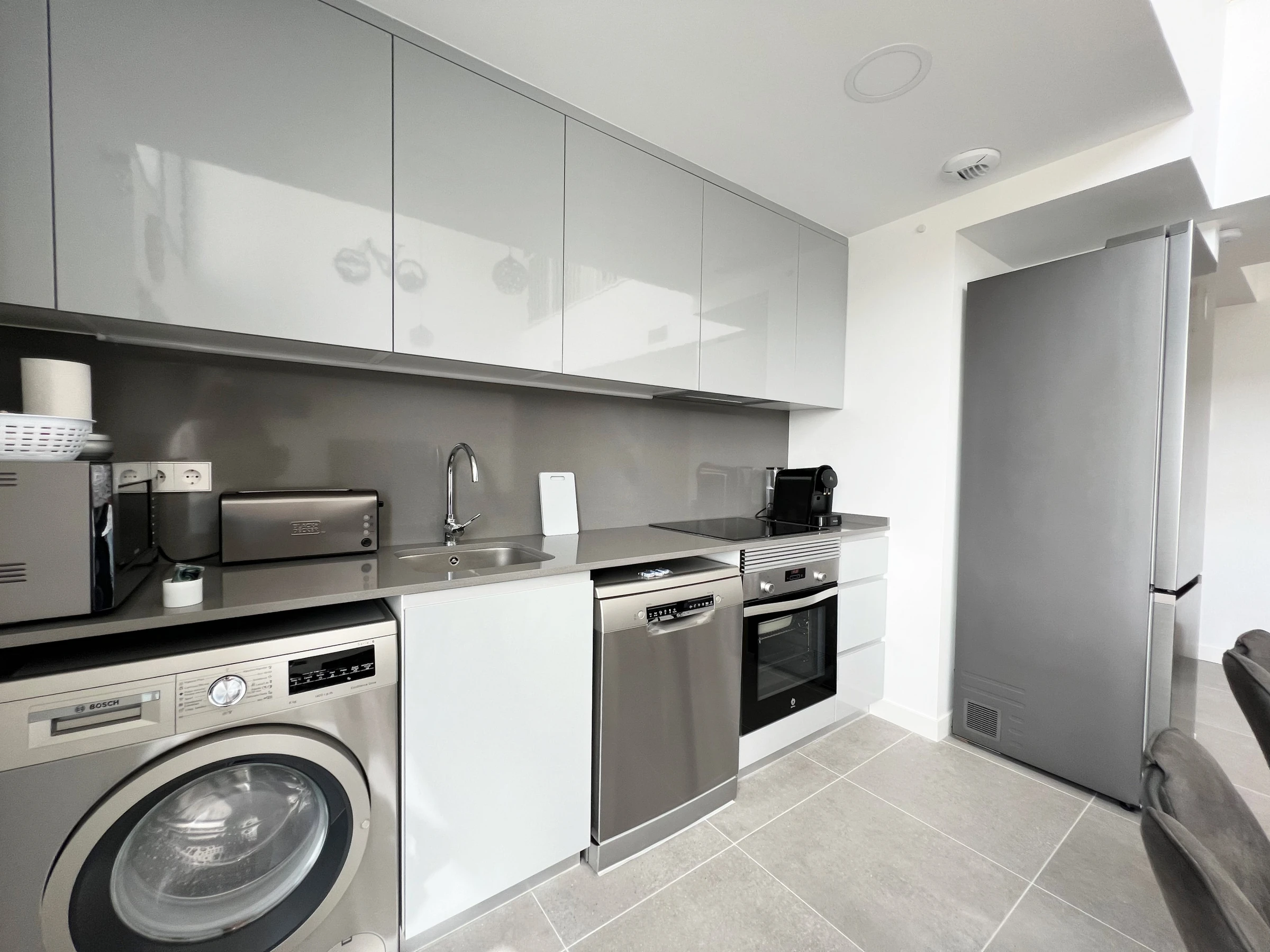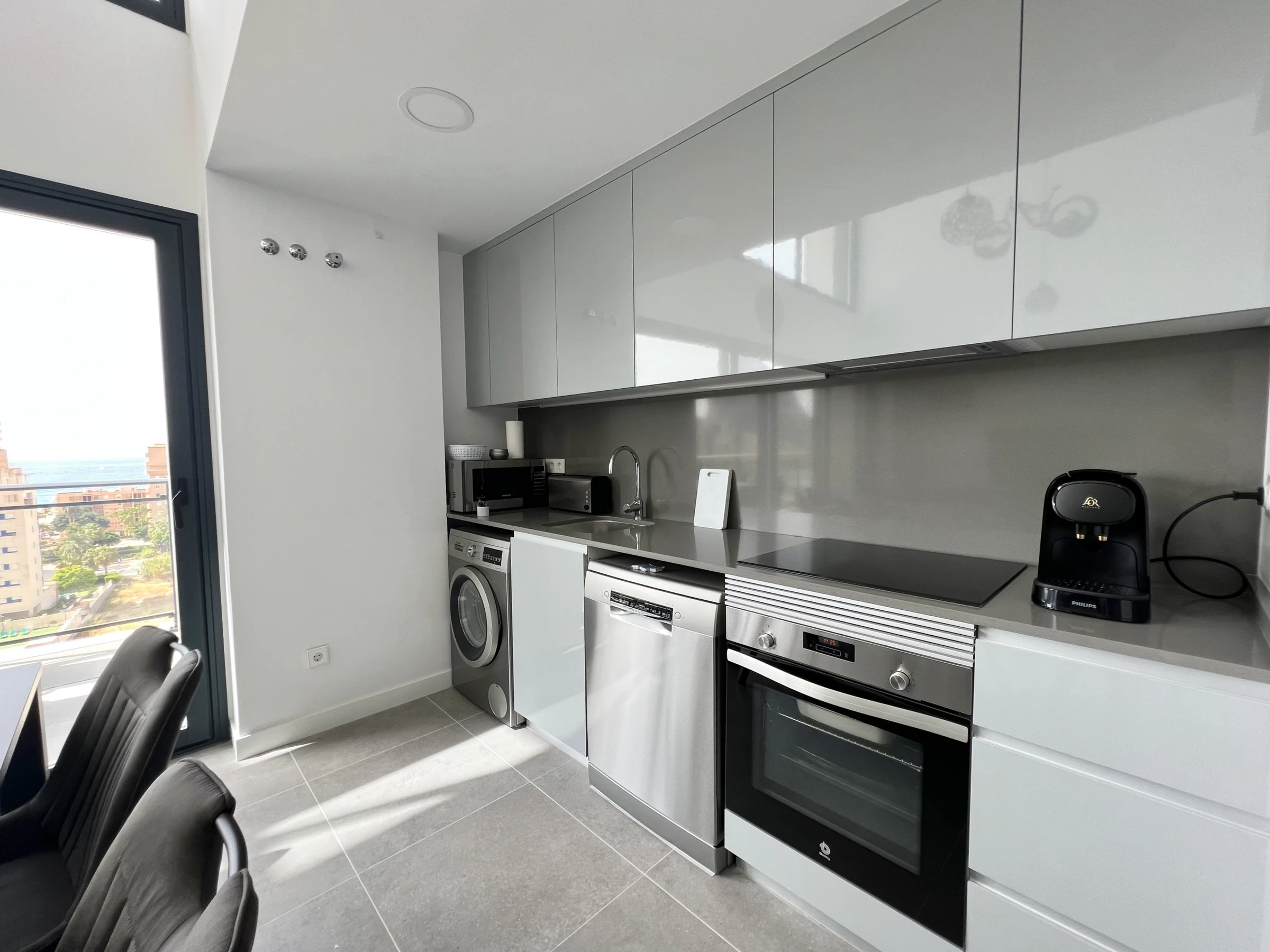 La cuisine américaine, à vitrocéramique, est équipée avec réfrigérateur, micro-ondes, four, congélateur, lave-vaisselle, vaisselle/couverts, ustensiles/cuisine, cafetière, grille pain et presse-agrumes.