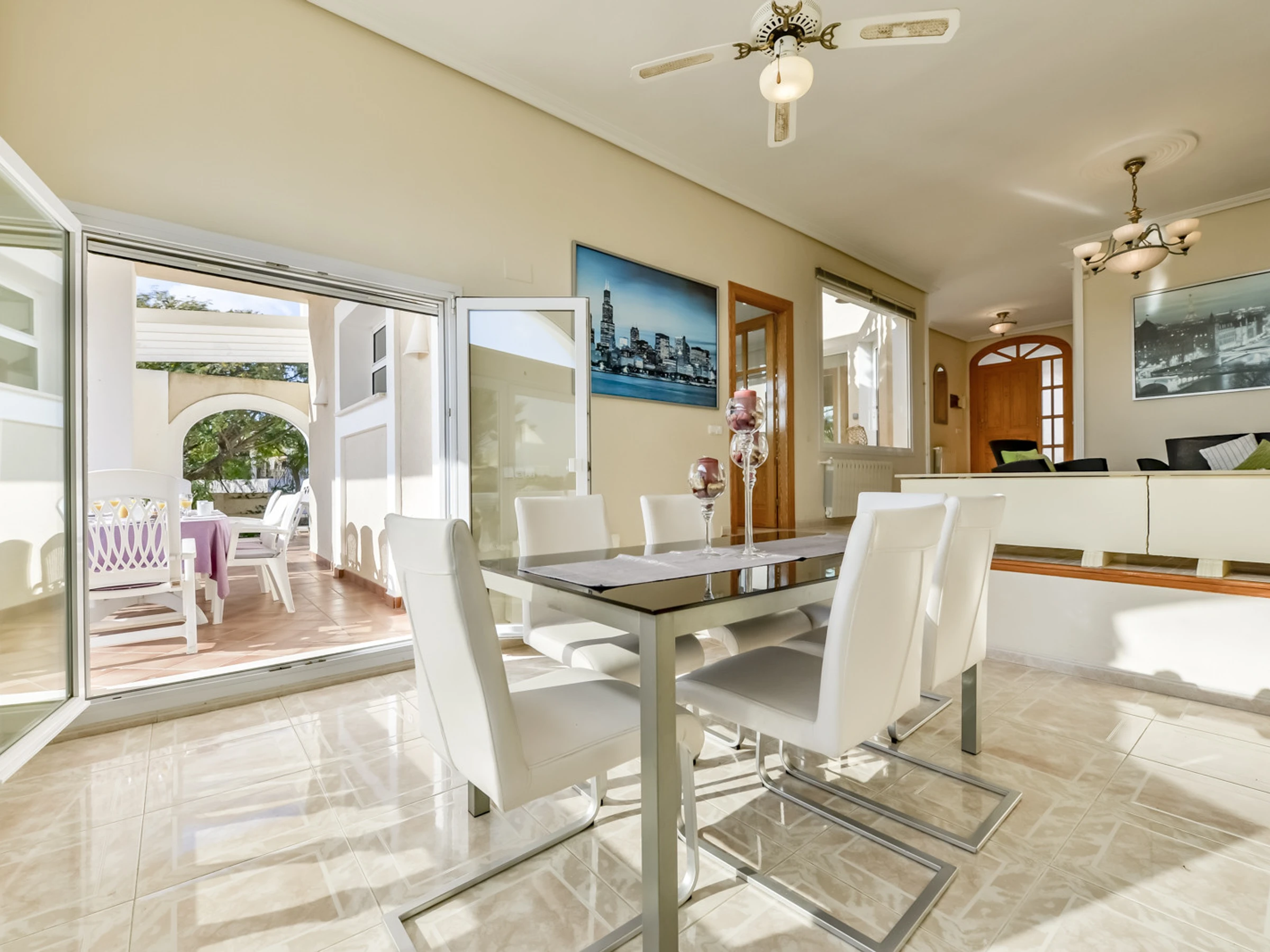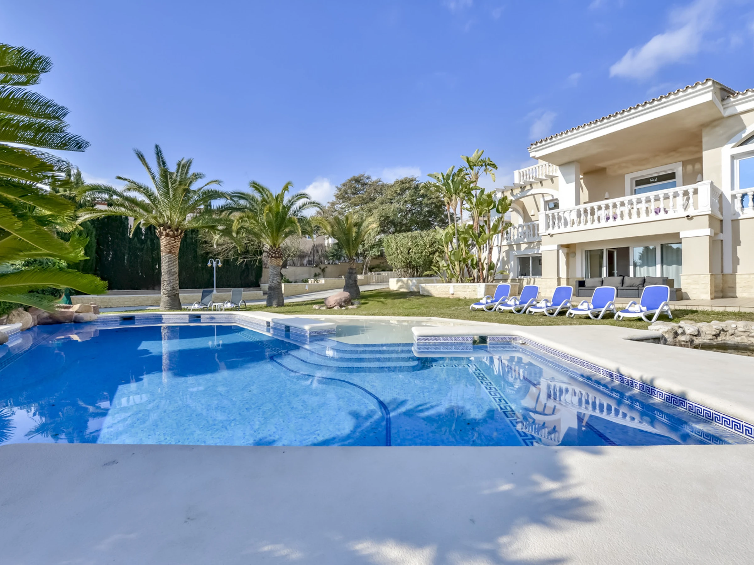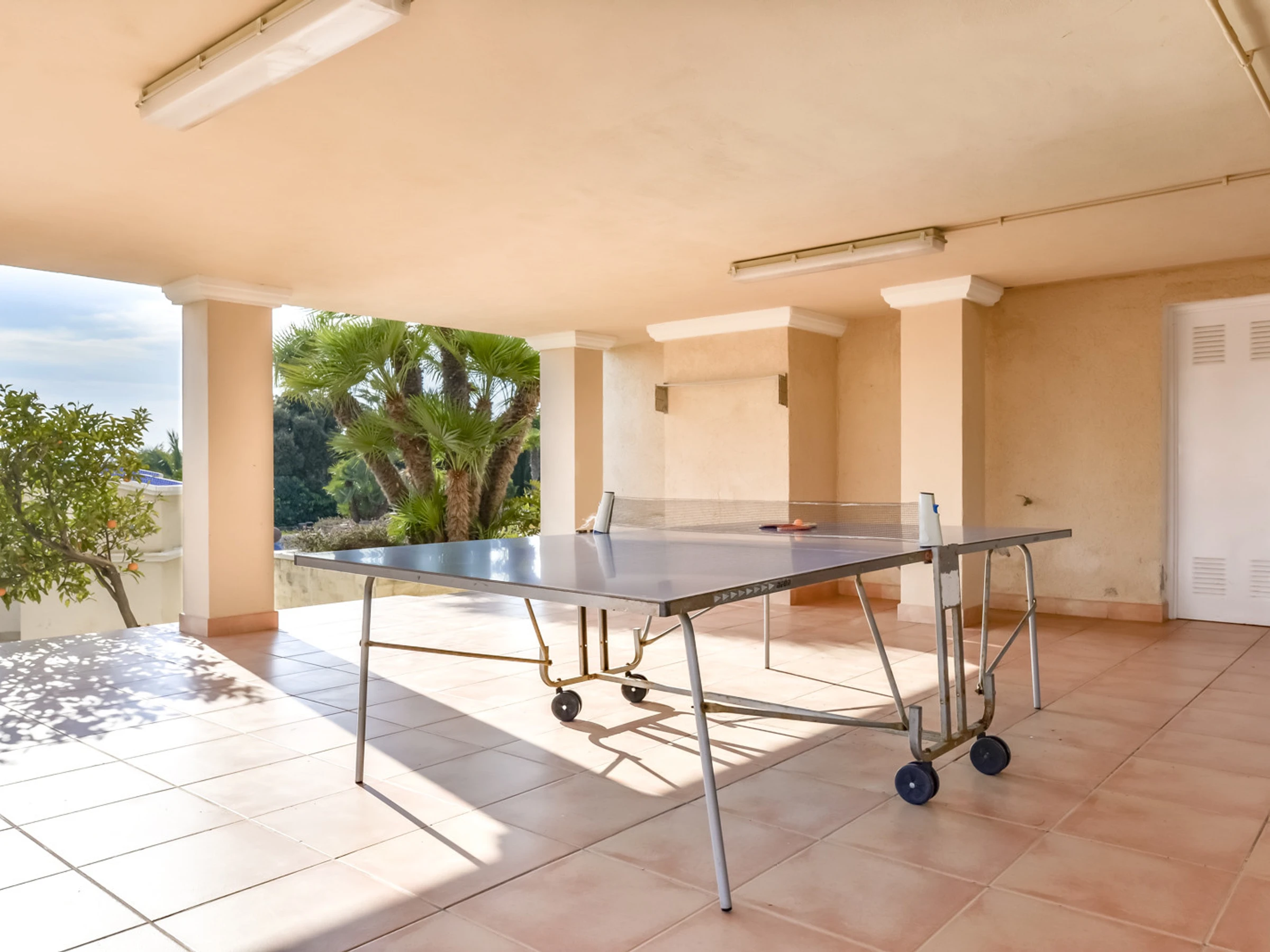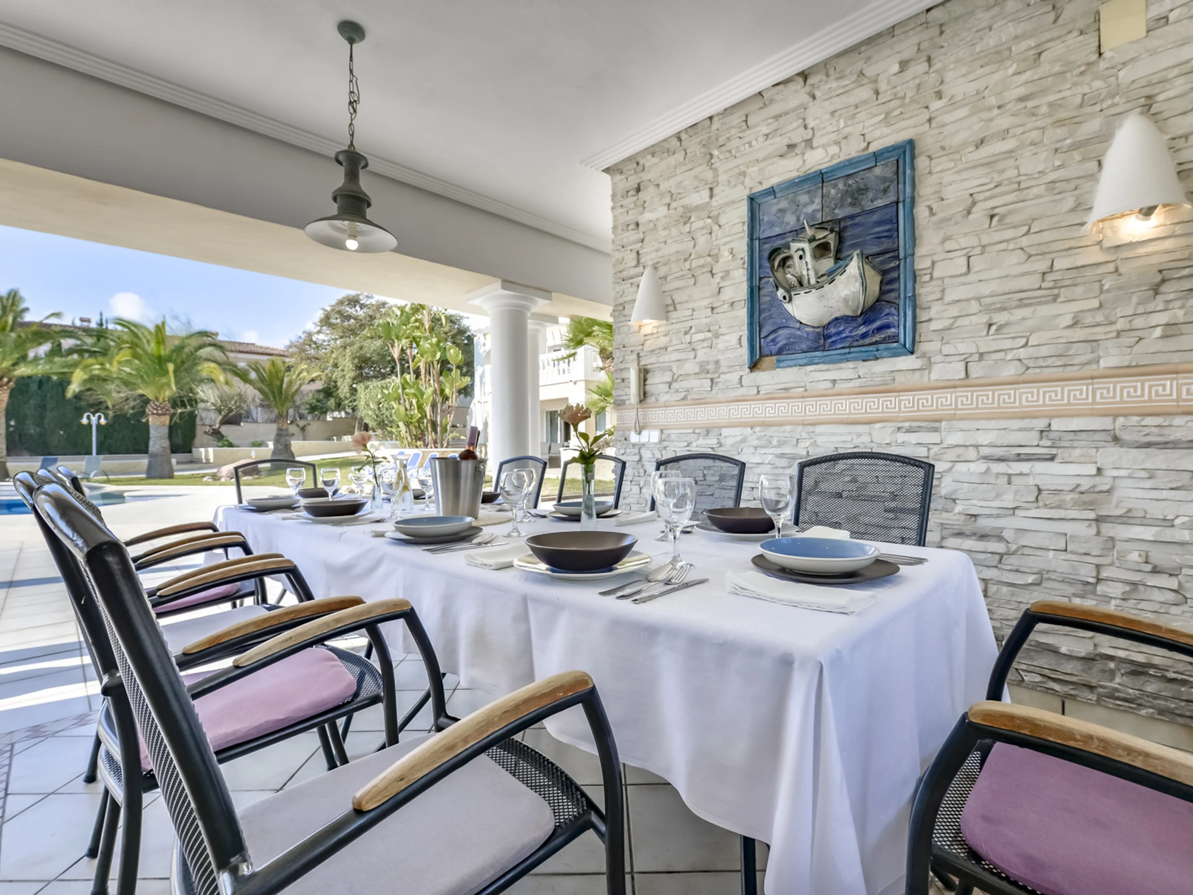 Jardin, mobilier de jardin, terrain clôturé, terrasse, barbecue, cheminée décorative, fer à repasser, accès Internet gratuit (wifi), chauffage central, piscine privée, parking couvert dans le même bâtiment, 4 ventilateurs, 1 TV, TV satellite.