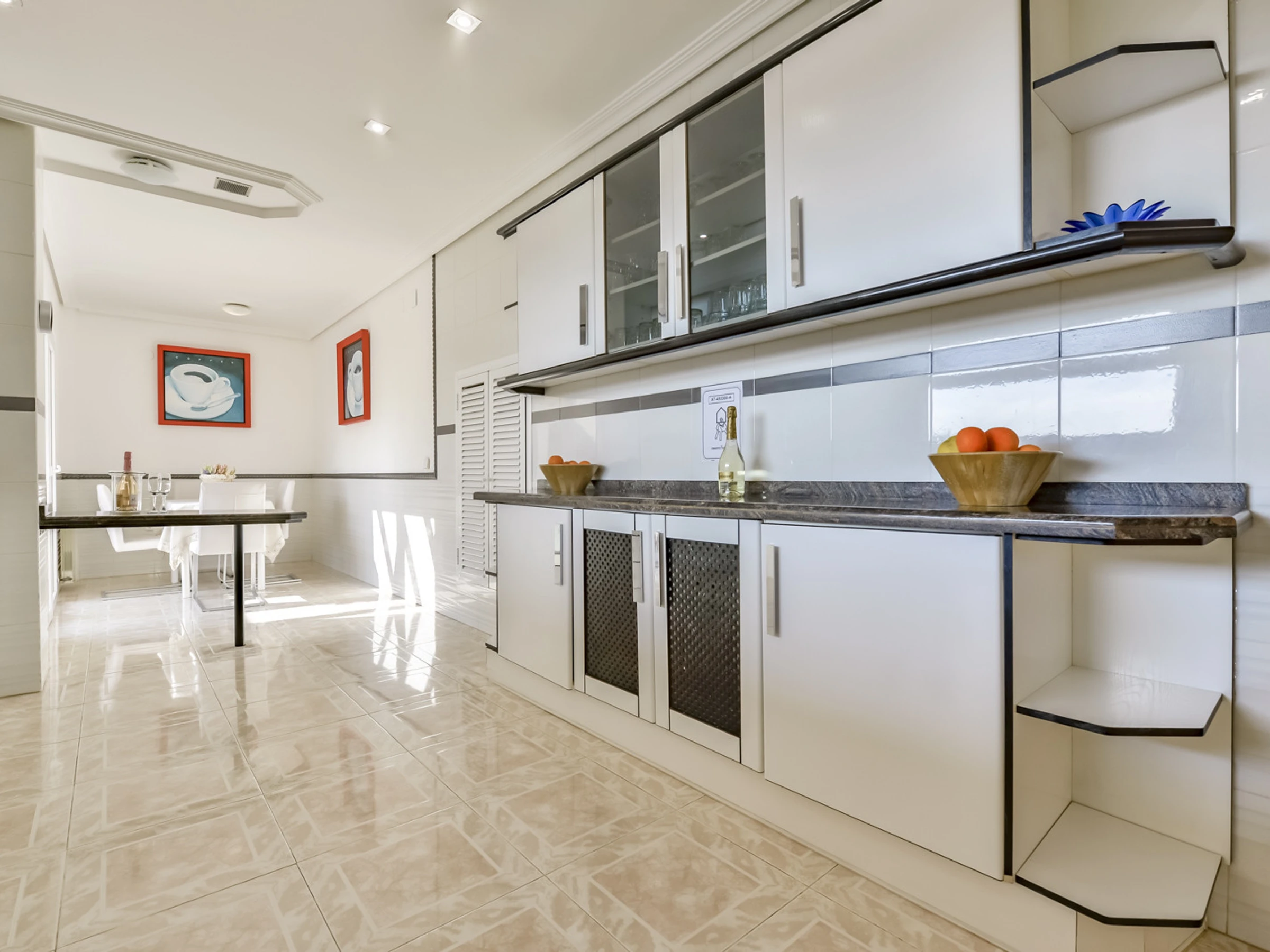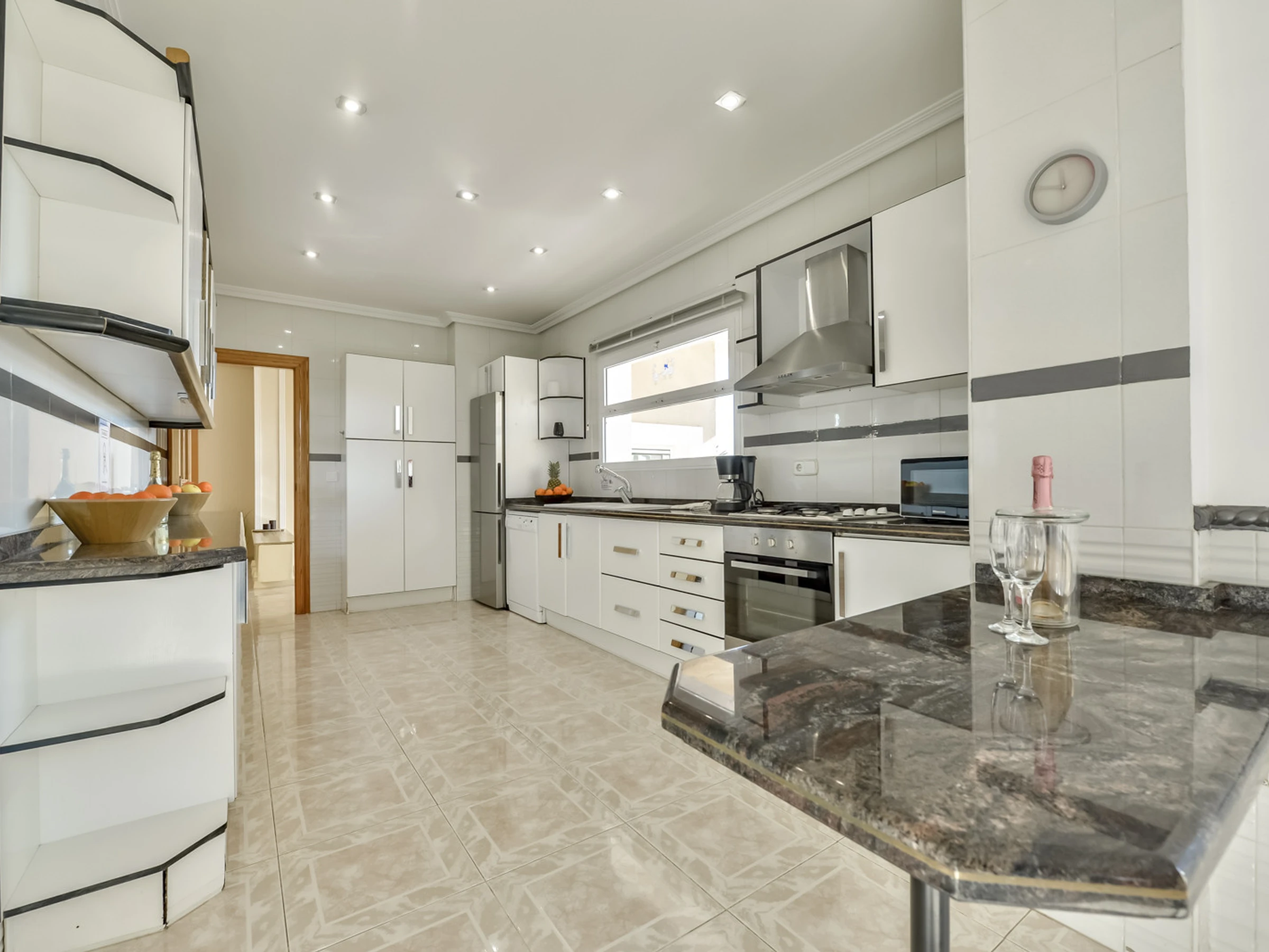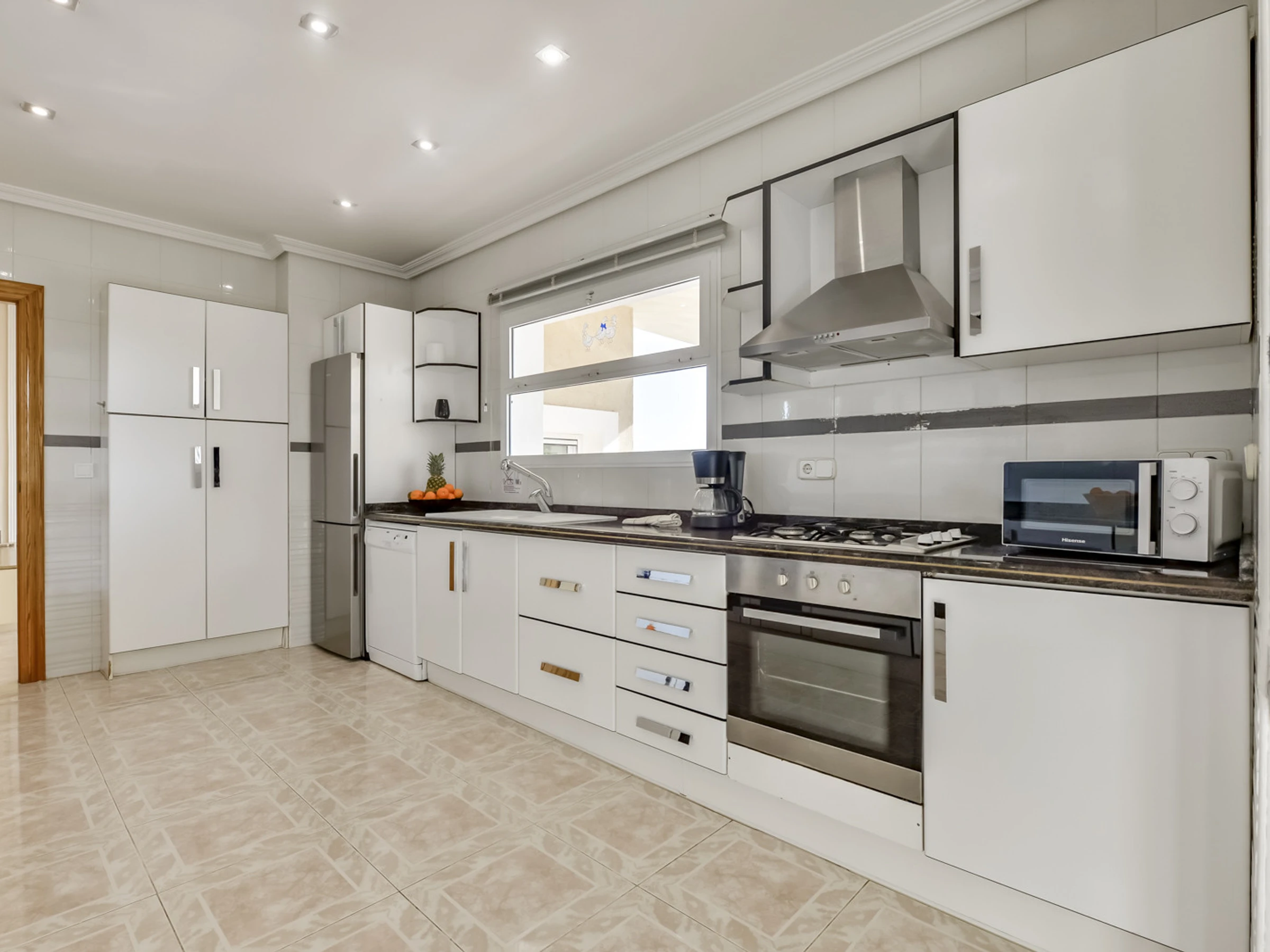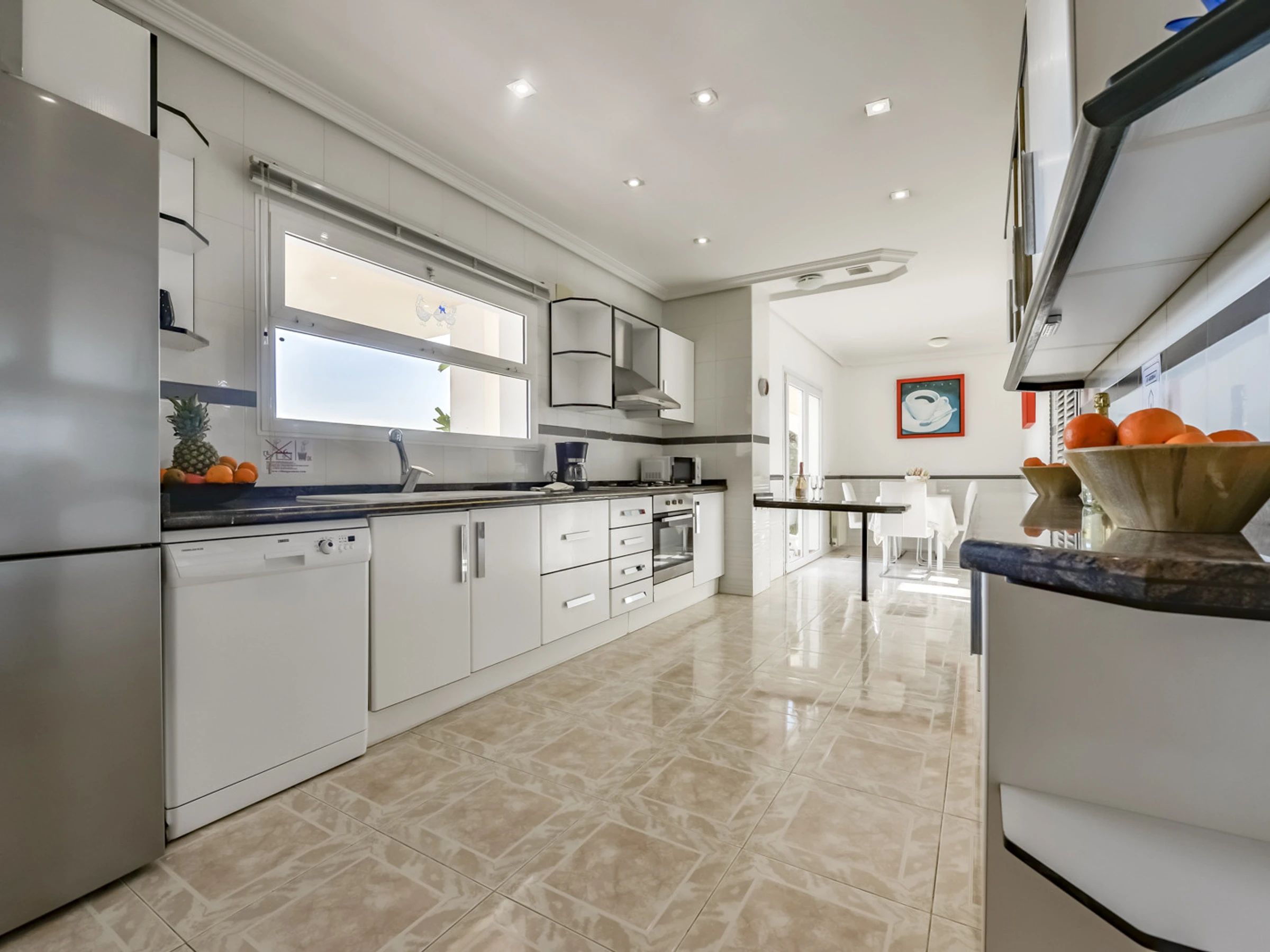 Dans la cuisine indépendante au gaz butane et électrique, réfrigérateur, micro-ondes, four, congélateur, lave-linge, lave-vaisselle, vaisselle/couverts, ustensiles de cuisine, cafetière, grille-pain, bouilloire et presse-agrumes sont fournis.