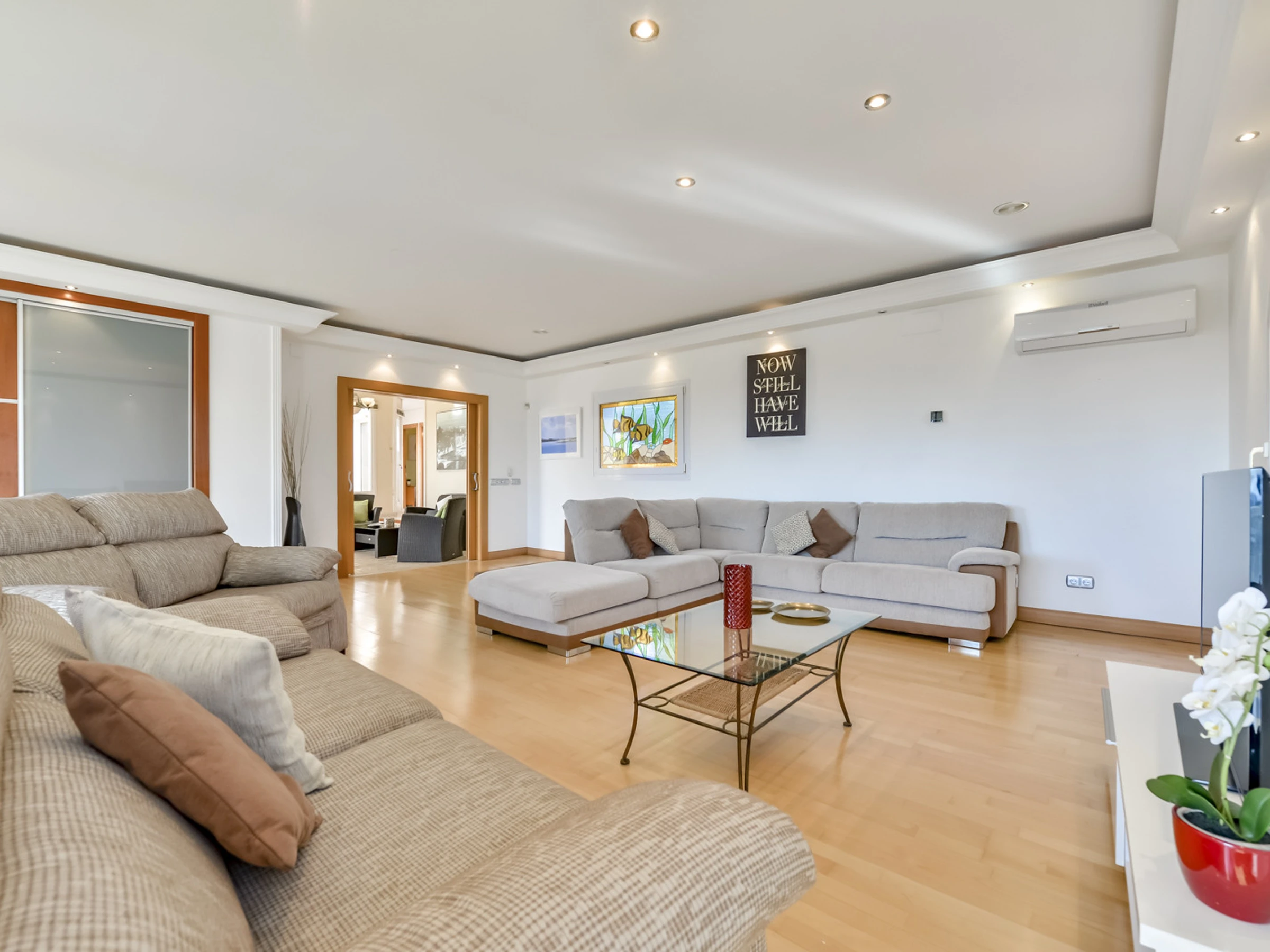 La villa dispose d'une pièce séparée au rez-de-chaussée avec un grand salon avec canapé, un lit double, l'air conditionné et une salle de bain avec douche.