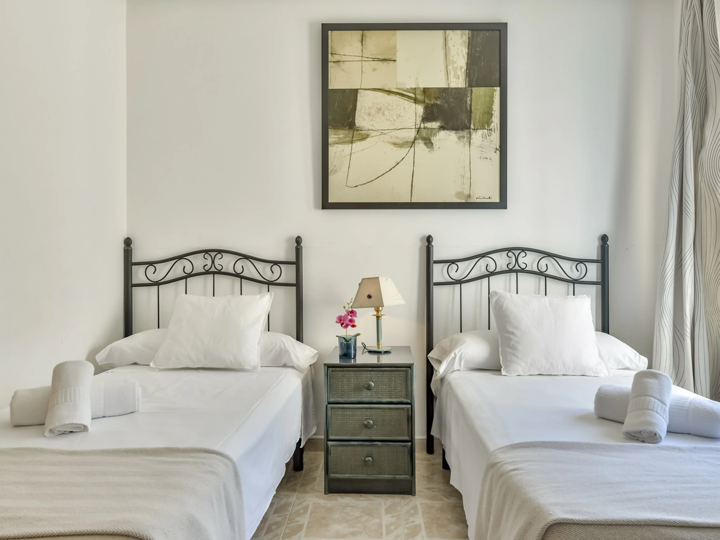 Au premier étage, il y a une quatrième chambre avec lit double, terrasse et air conditionné et une cinquième chambre avec lit double et air conditionné. Au même étage, il y a une salle de bain complète avec baignoire et douche partagée par les deux chambres. Les deux chambres ont une terrasse commune.