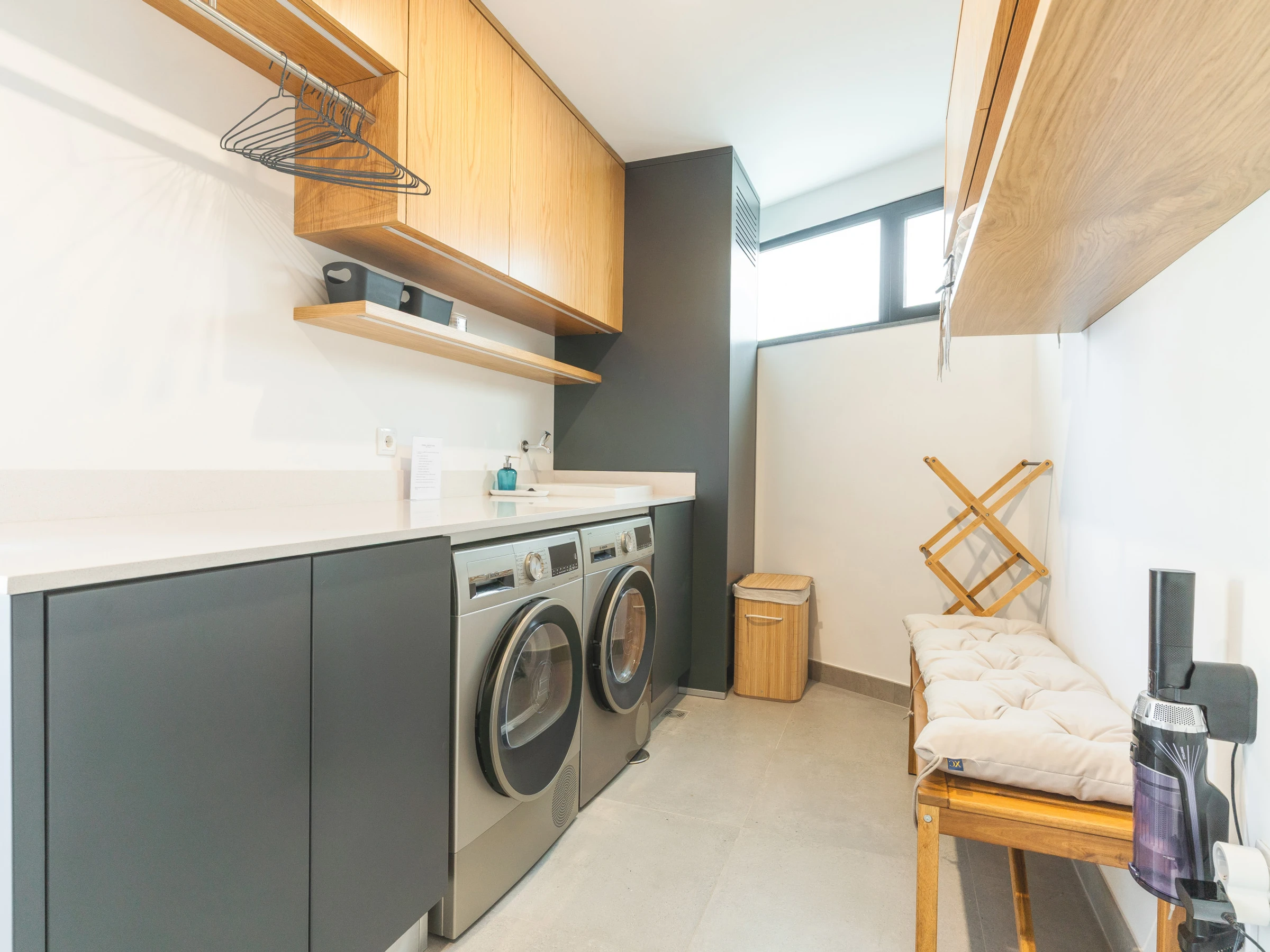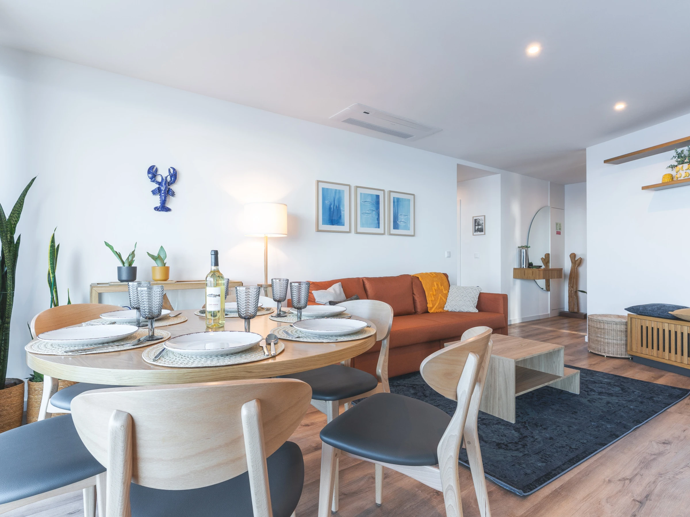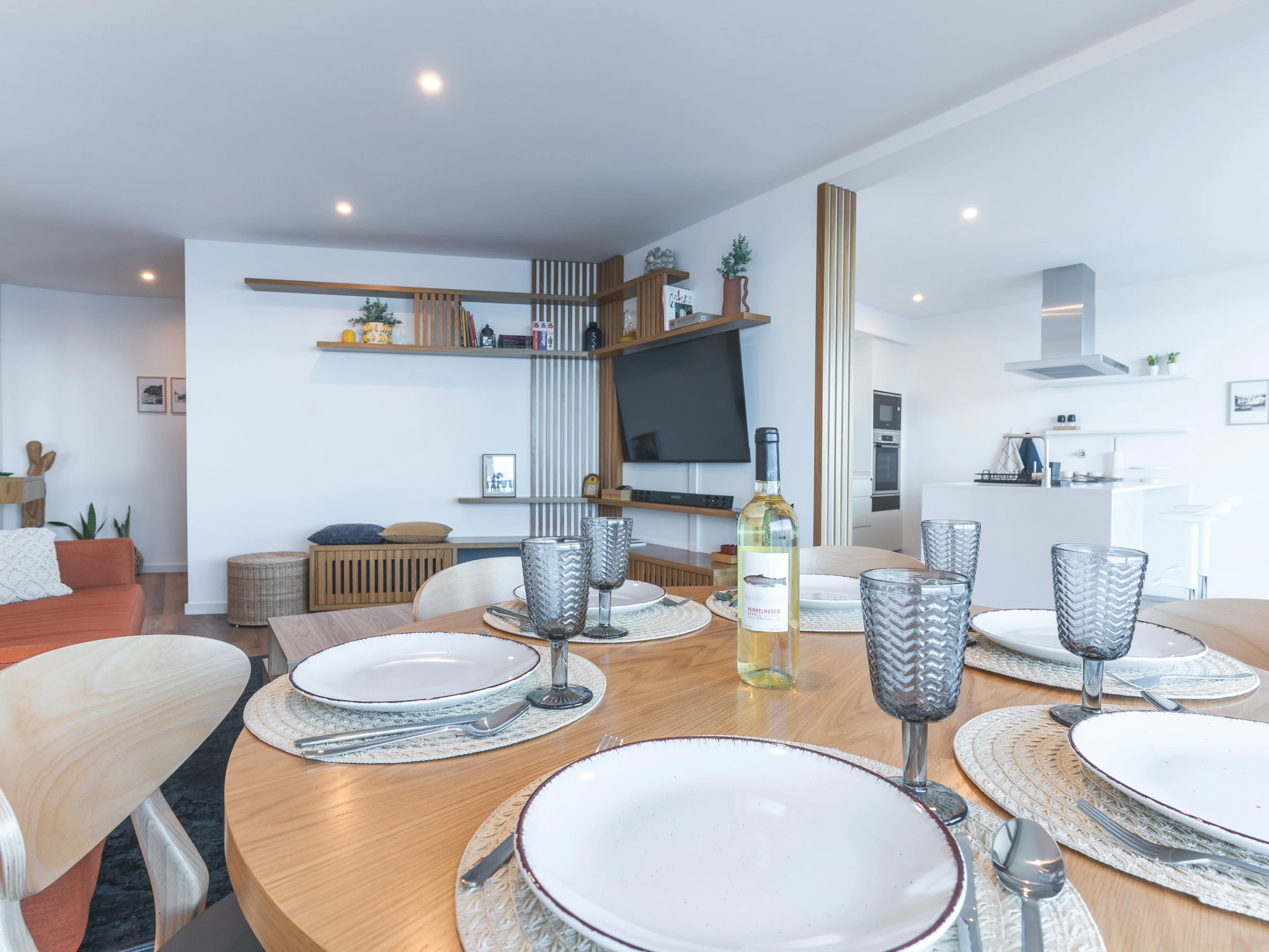 La cuisine est entièrement équipée d'appareils et d'ustensiles essentiels, comprenant un réfrigérateur, un congélateur, un four, un micro-ondes, une plaque de cuisson, un lave-vaisselle, des couverts, des assiettes et tout ce qui est nécessaire pour préparer des repas pendant votre séjour. L'espace de vie offre un espace confortable pour se détendre, équipé de la climatisation et d'une télévision intelligente avec boîtier.