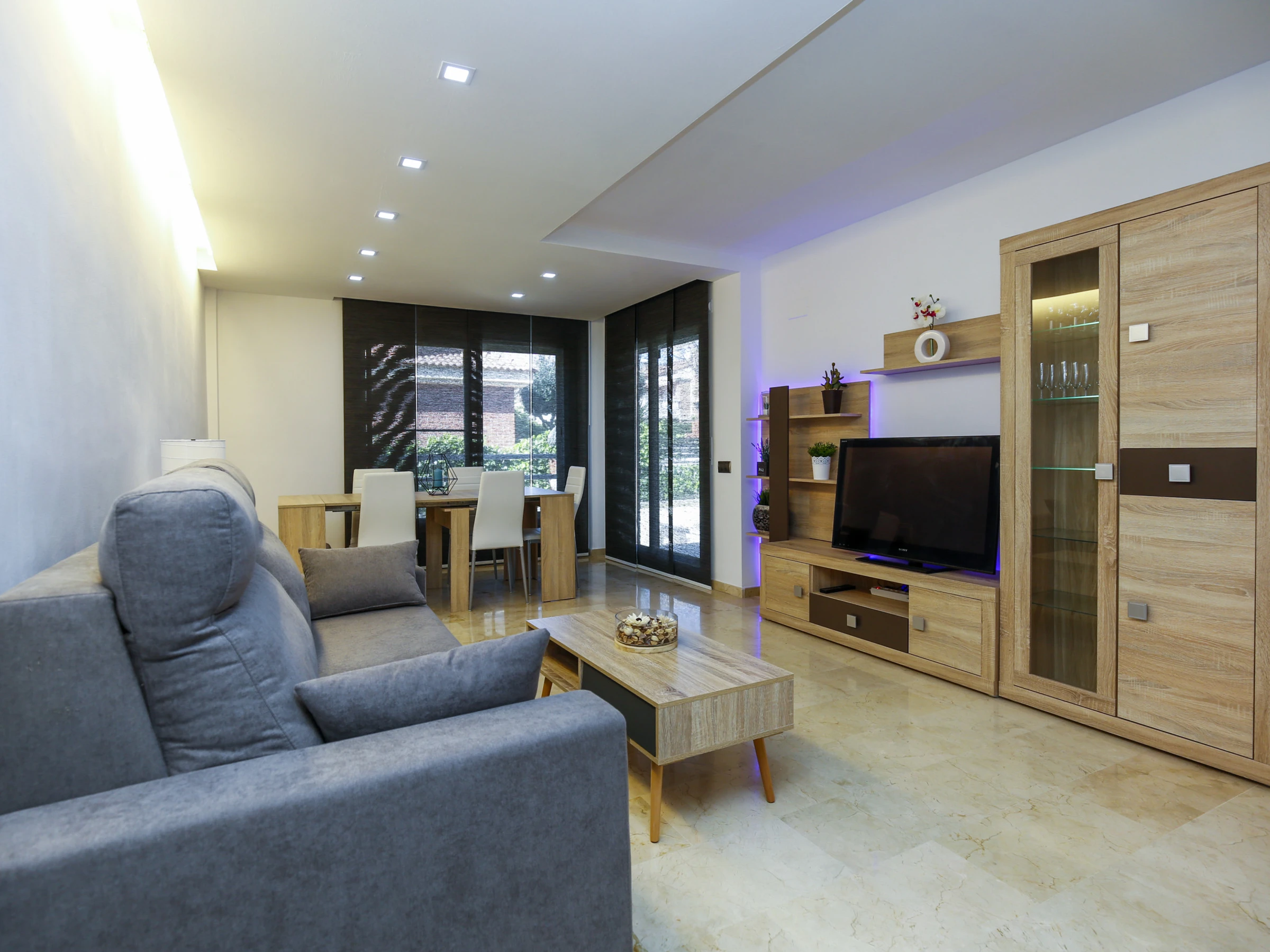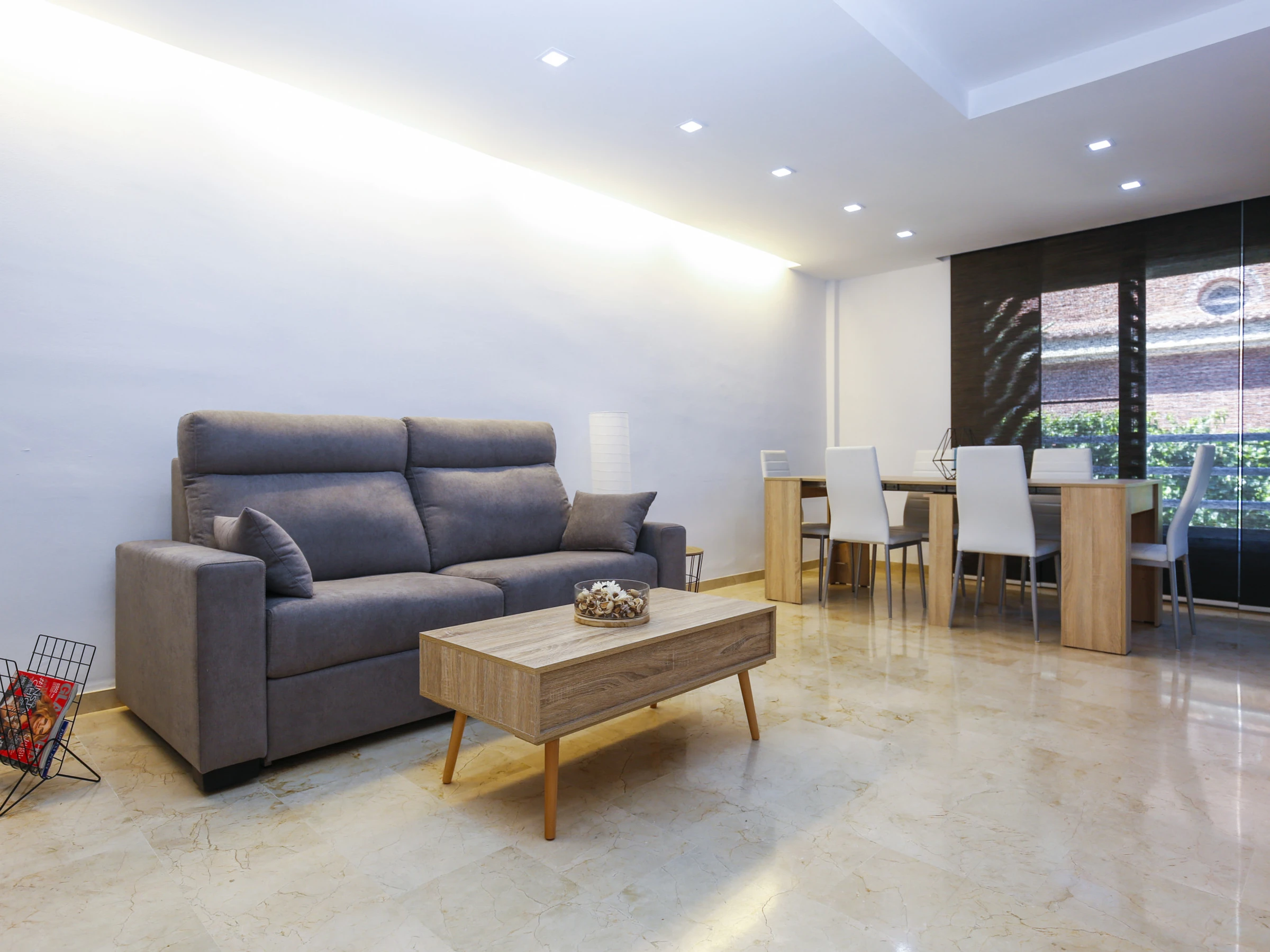 Salon-salle à manger lumineux avec accès direct à la terrasse.