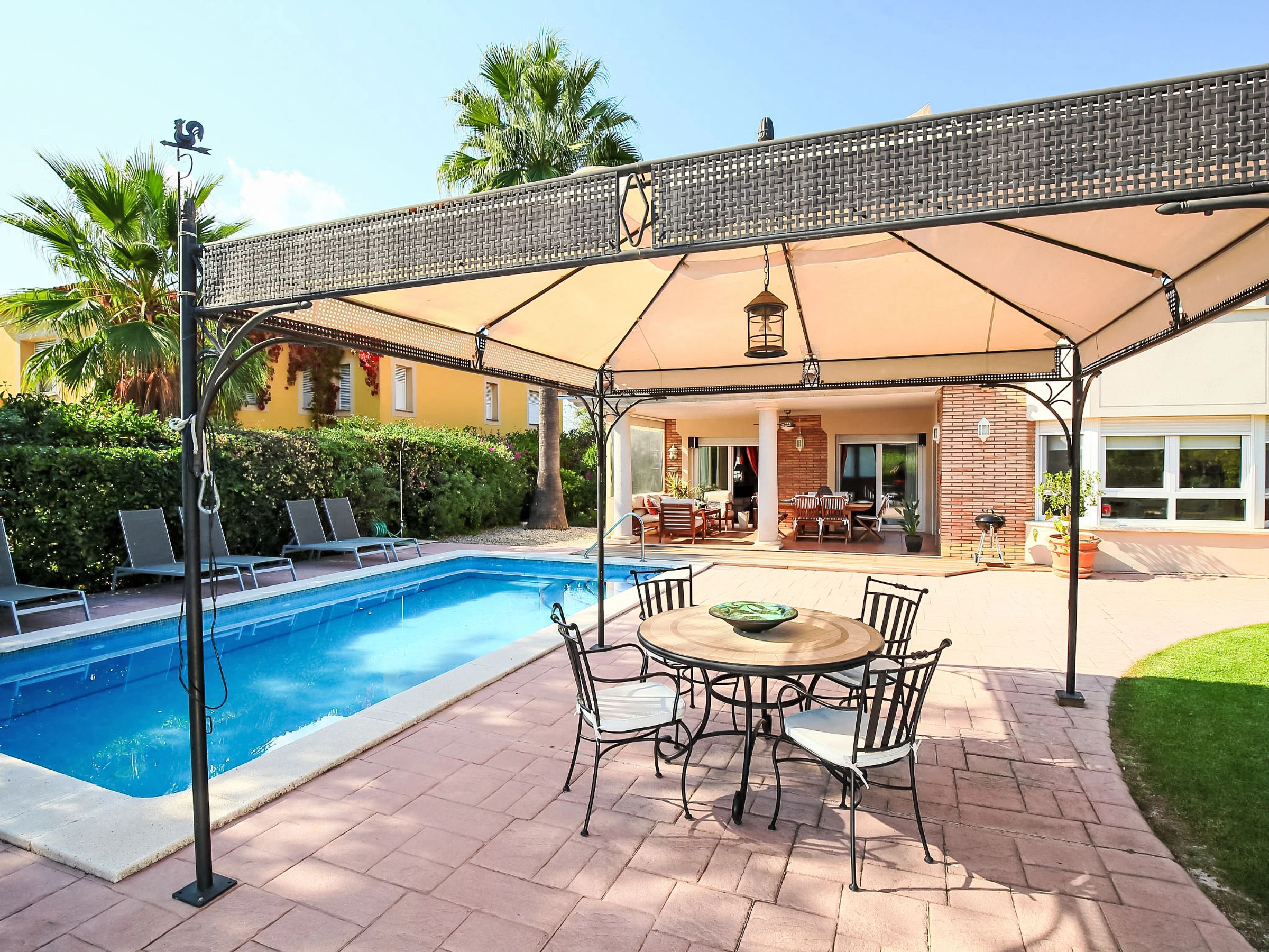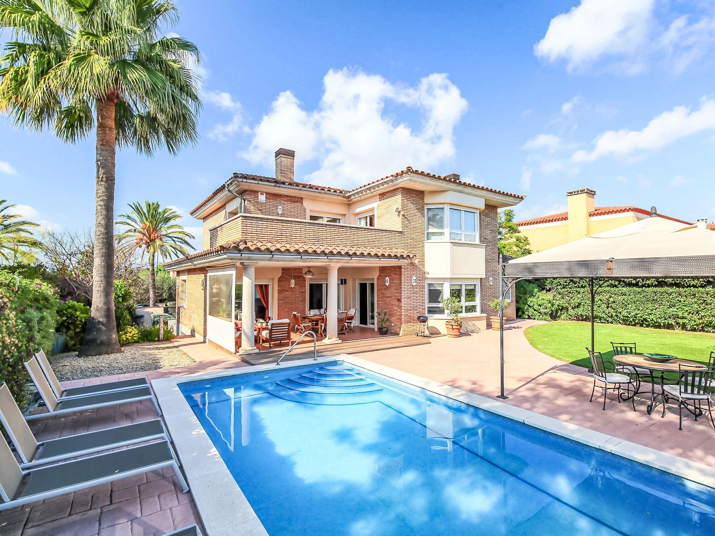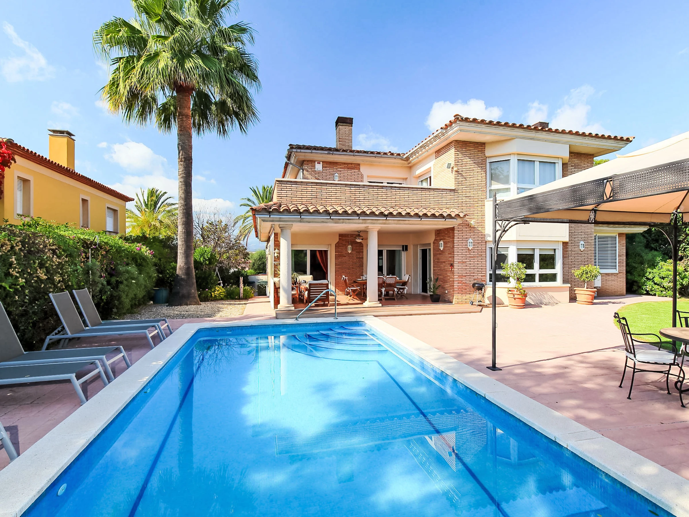 Gaudi Reus Golf à 9 km de Cambrils: Grande villa luxueuse "Bertoni Golf & Sea", de 2 étages. En-dehors de la localité, à 3 km du centre de Reus, dans l'arrondissement Les Palemeres d'Aigüesverds, situation tranquille quartier résidentiel, zone avec peu de trafic, à 9 km de la mer, à 9 km de la plage, en bordure du terrain de golf, orientée nord-est. En commun: tennis (en sus), ping-pong, basket, espace de jeux pour les enfants (toboggan). A usage privé: jardin propice à la détente, piscine rectangulaire, chauffée (8 x 4 m, disponibilité saisonnière: [hidden] - [hidden] avec marches intérieures. Douche extérieure, entretien de la piscine par le propriétaire/jardinier. Infrastructures de la résidence: restaurant, bar. Parking public possible dans la rue. Magasin d'alimentation 3 km, supermarché 3 km, centre commercial 7 km, restaurant, bar, café 600 m, zone piétonne 3 km, arrêt de bus "Reus" 3 km, gare ferroviaire "Reus" 7 km. Port plaisance 12 km, terrain de golf (18 trous) 25 m, ecole de surf 12 km, ecole de voile 12 km, tennis 600 m, centre équestre 3 km, piste cyclable 100 m. Attractions à proximité: Port Aventura 10 km, Aquum Spa 12 km. Région de randonnées: La Mussara 40 km. Veuillez noter: voiture recommandée. Équipement pour bébés sur demande. Le propriétaire n'accepte pas les groupes de jeunes. Déchargement et chargement des bagages à la location de vacances. Résidence gardée 24h. Aéroport à proximité. Environnement très sensible au bruit. Silence et bonne tenue exigés.