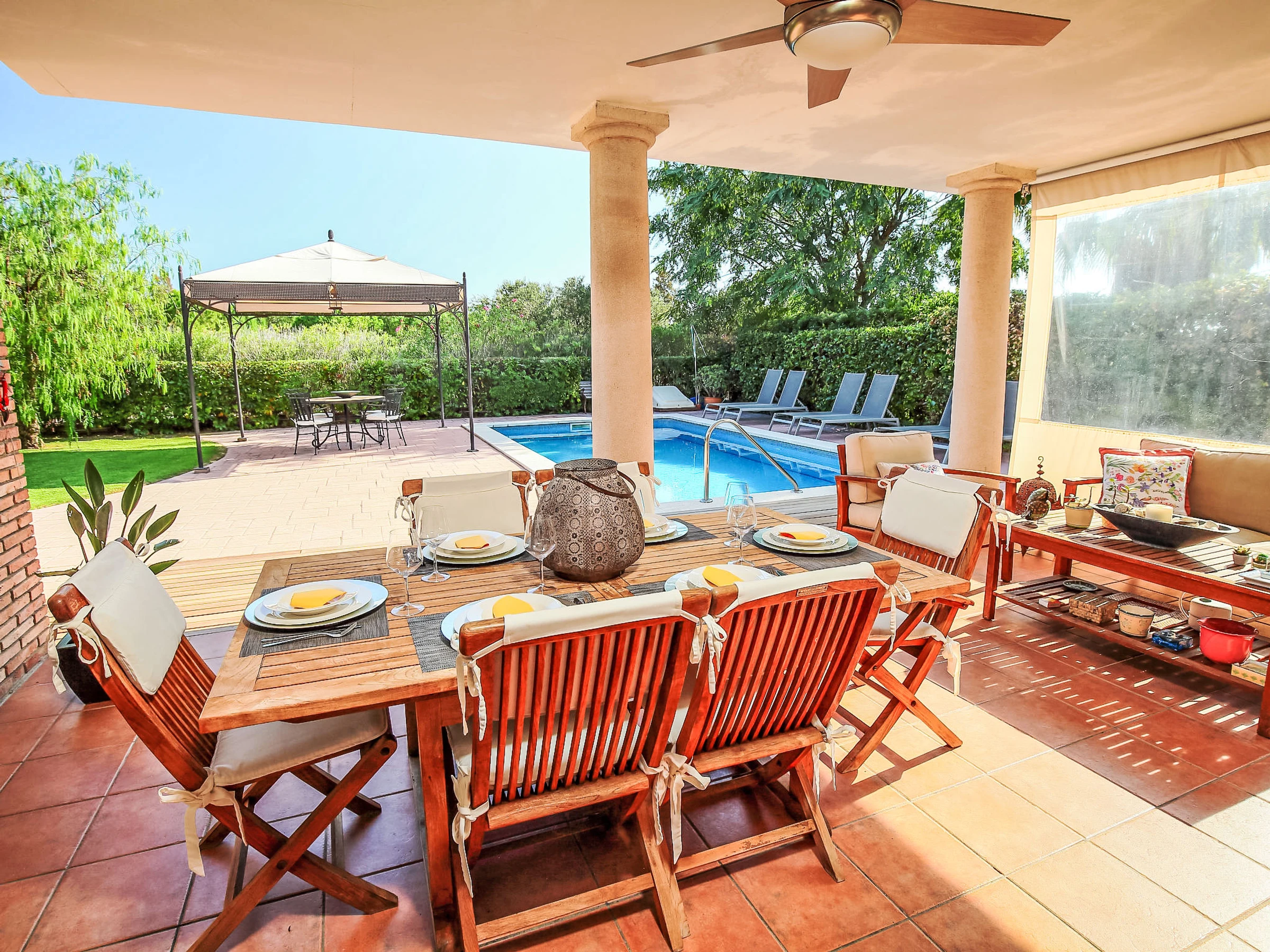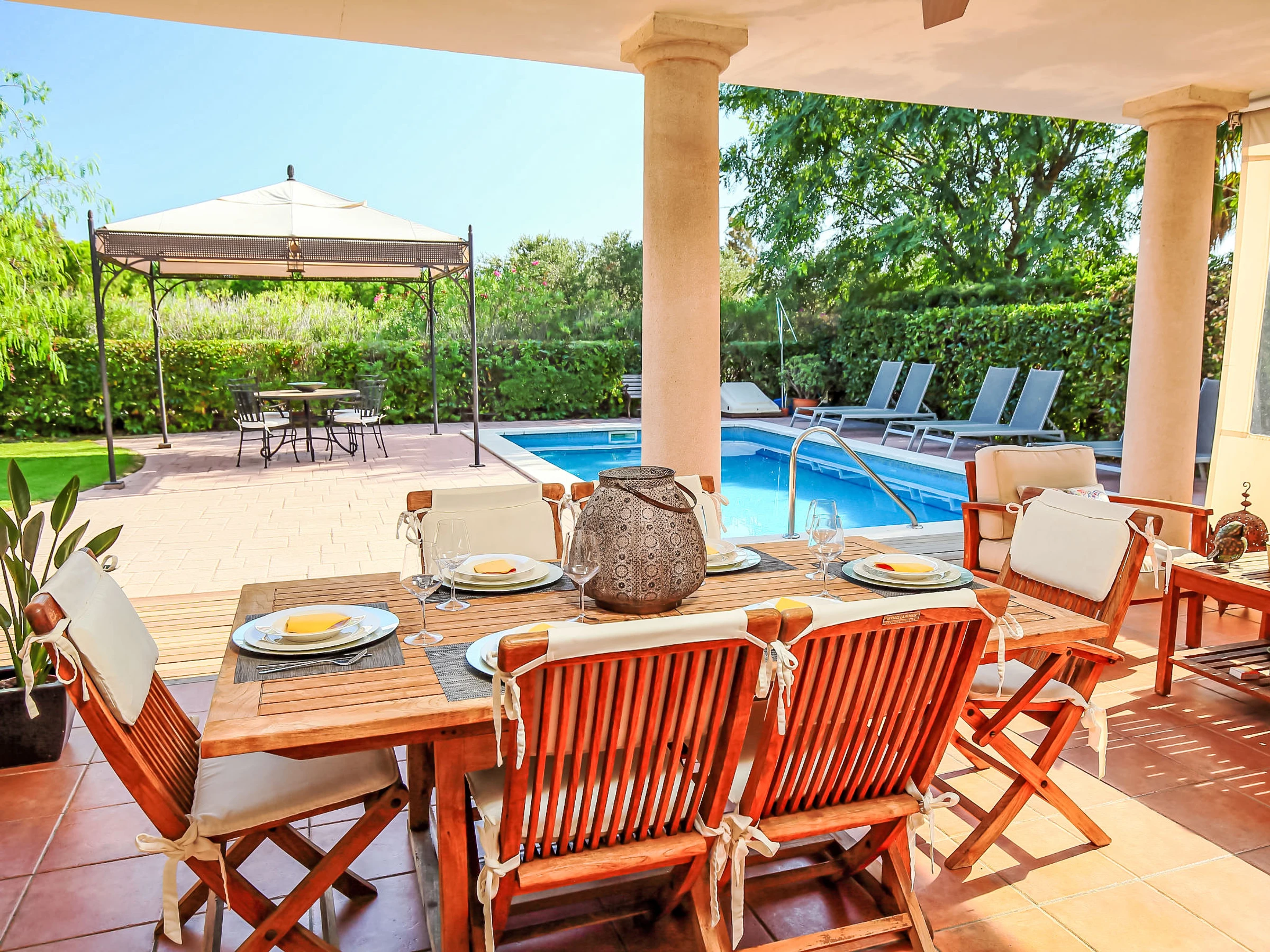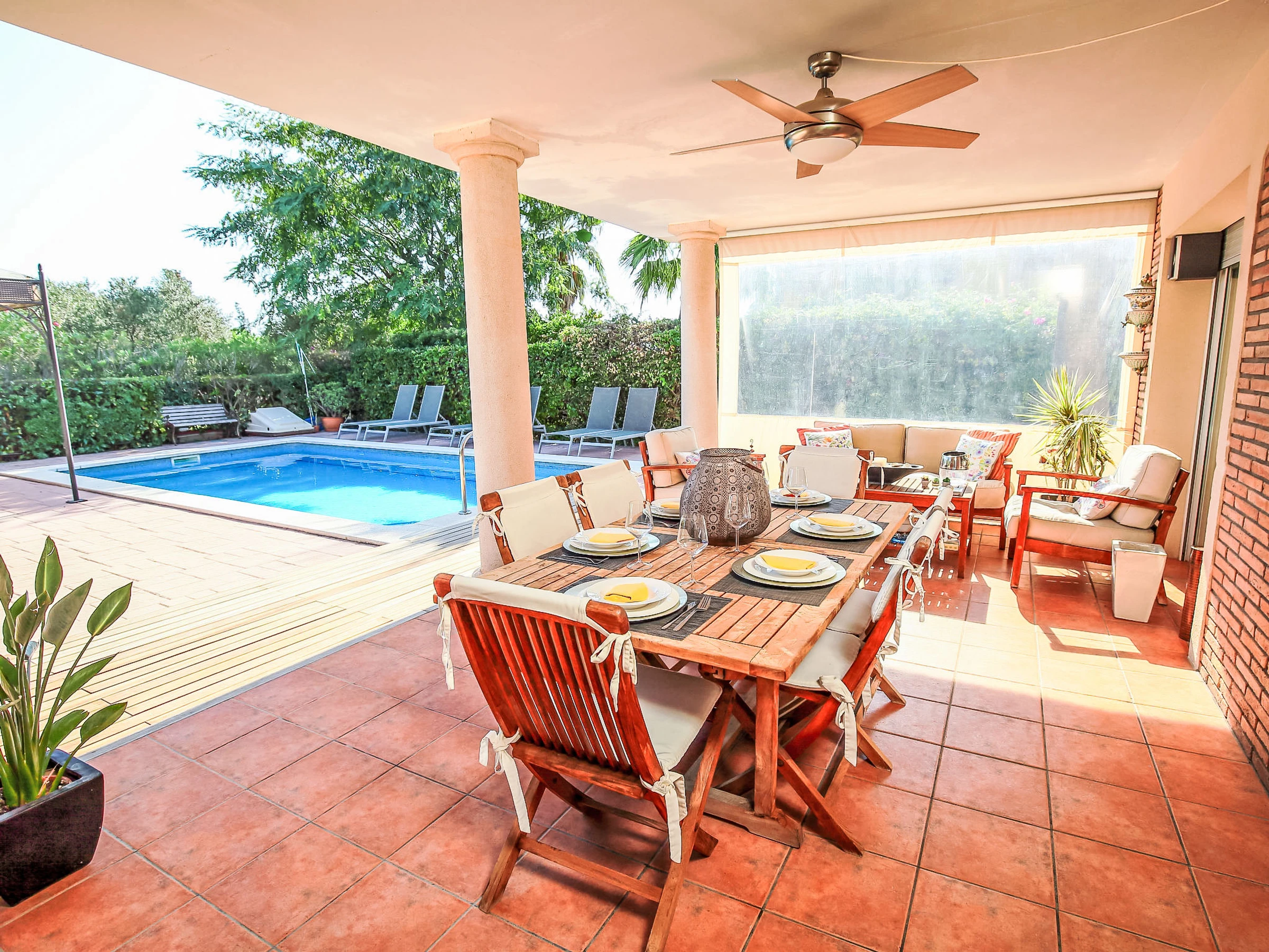 Gaudi Reus Golf à 9 km de Cambrils: Grande villa luxueuse "Bertoni Golf & Sea", de 2 étages. En-dehors de la localité, à 3 km du centre de Reus, dans l'arrondissement Les Palemeres d'Aigüesverds, situation tranquille quartier résidentiel, zone avec peu de trafic, à 9 km de la mer, à 9 km de la plage, en bordure du terrain de golf, orientée nord-est. En commun: tennis (en sus), ping-pong, basket, espace de jeux pour les enfants (toboggan). A usage privé: jardin propice à la détente, piscine rectangulaire, chauffée (8 x 4 m, disponibilité saisonnière: [hidden] - [hidden] avec marches intérieures. Douche extérieure, entretien de la piscine par le propriétaire/jardinier. Infrastructures de la résidence: restaurant, bar. Parking public possible dans la rue. Magasin d'alimentation 3 km, supermarché 3 km, centre commercial 7 km, restaurant, bar, café 600 m, zone piétonne 3 km, arrêt de bus "Reus" 3 km, gare ferroviaire "Reus" 7 km. Port plaisance 12 km, terrain de golf (18 trous) 25 m, ecole de surf 12 km, ecole de voile 12 km, tennis 600 m, centre équestre 3 km, piste cyclable 100 m. Attractions à proximité: Port Aventura 10 km, Aquum Spa 12 km. Région de randonnées: La Mussara 40 km. Veuillez noter: voiture recommandée. Équipement pour bébés sur demande. Le propriétaire n'accepte pas les groupes de jeunes. Déchargement et chargement des bagages à la location de vacances. Résidence gardée 24h. Aéroport à proximité. Environnement très sensible au bruit. Silence et bonne tenue exigés.