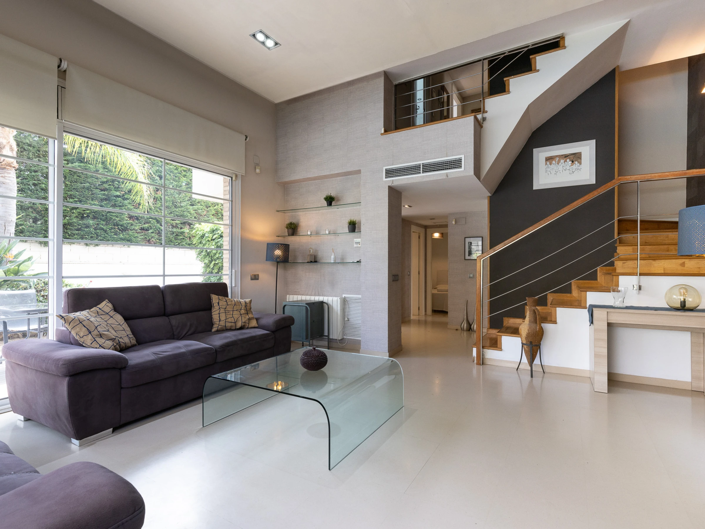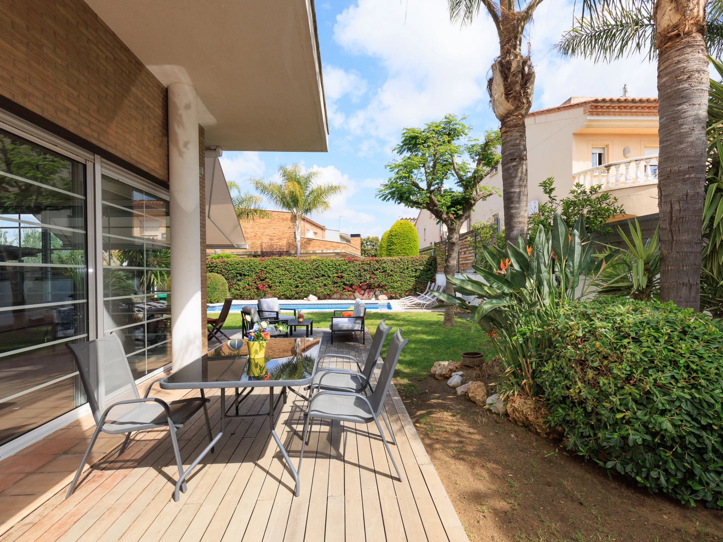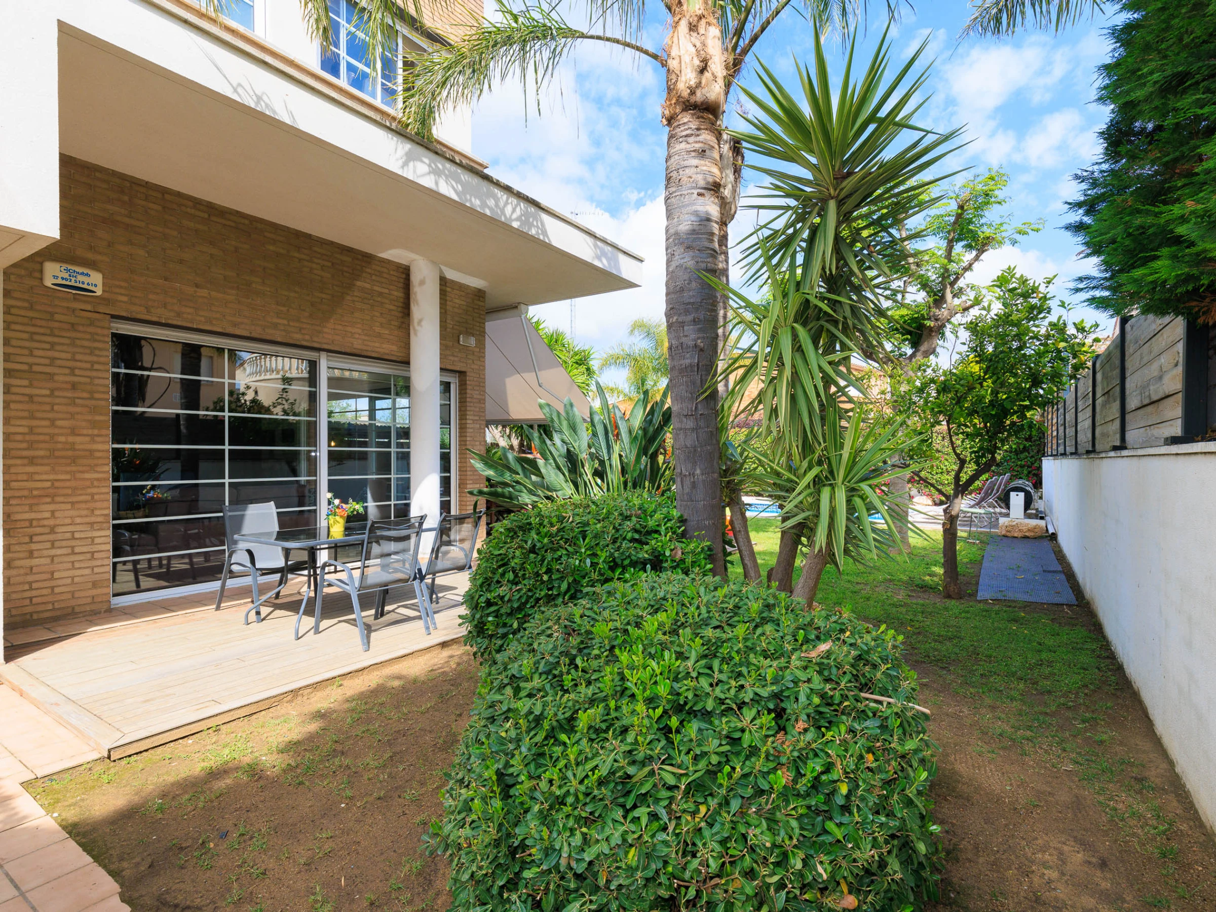 Grande villa avec des espaces spacieux, cuisine indépendante équipée, climatisation dans tout le logement, jardin privé avec mobilier extérieur, barbecue et terrasse.
