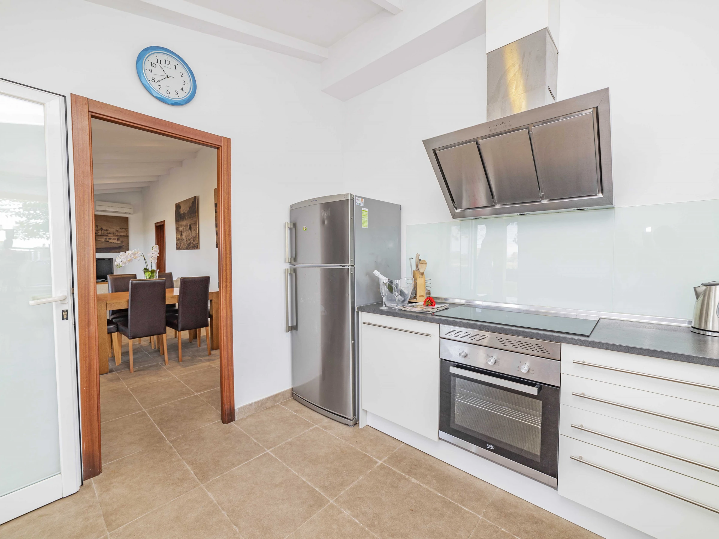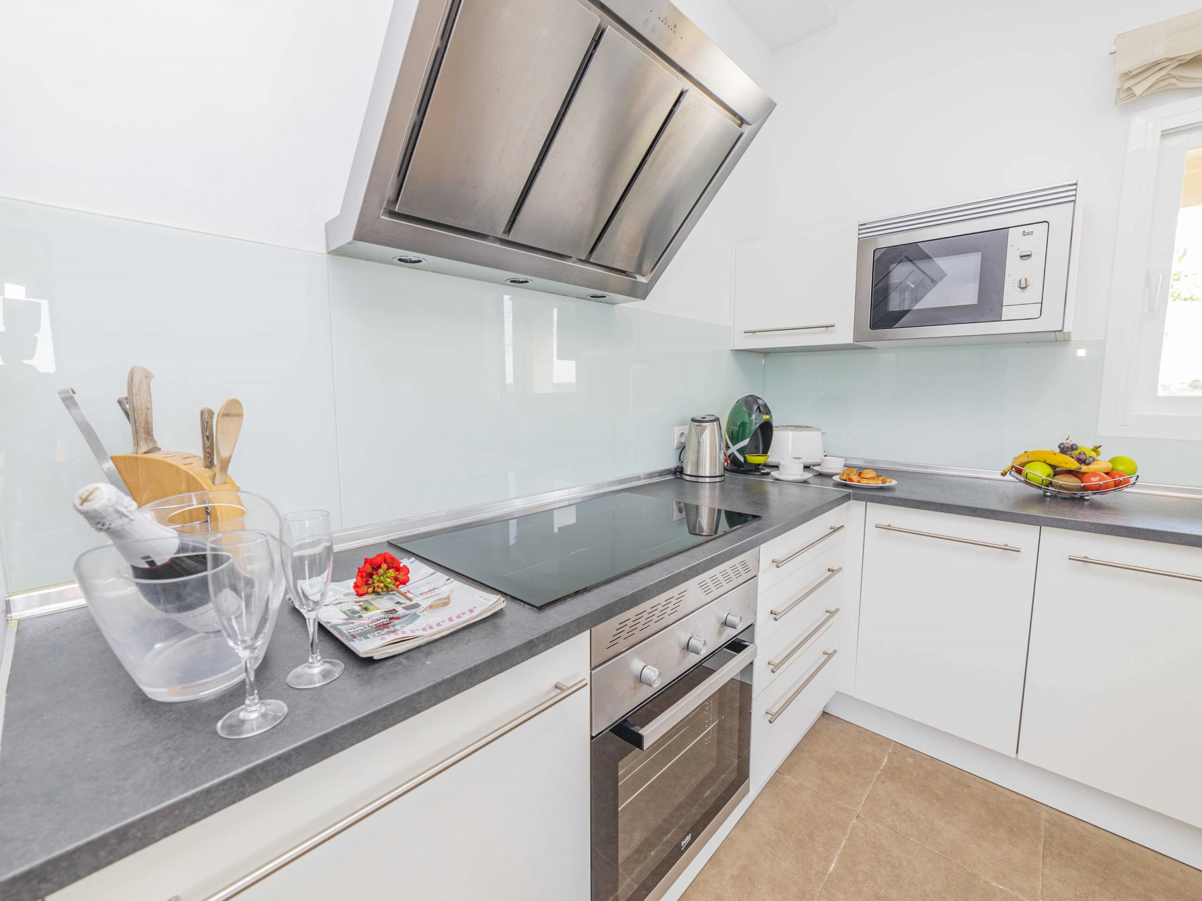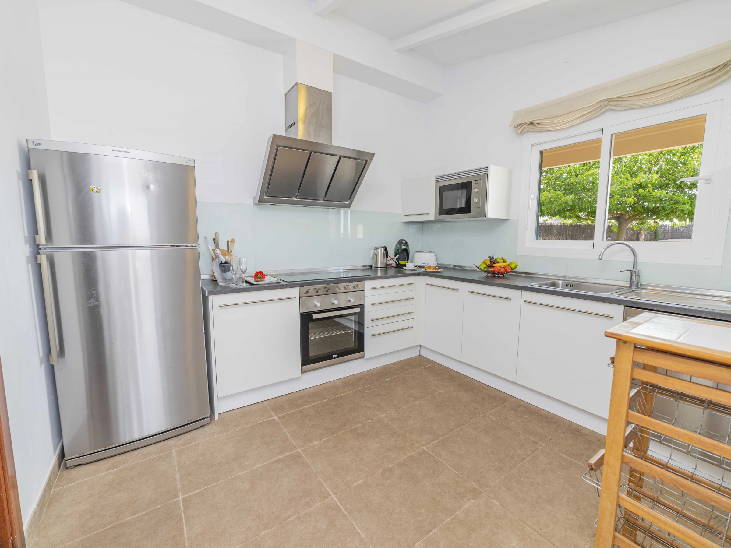 La cuisine indépendante, à vitrocéramique, est équipée avec réfrigérateur, micro-ondes, four, congélateur, lave-vaisselle, vaisselle/couverts, ustensiles/cuisine, cafetière, grille pain, bouilloire et presse-agrumes.