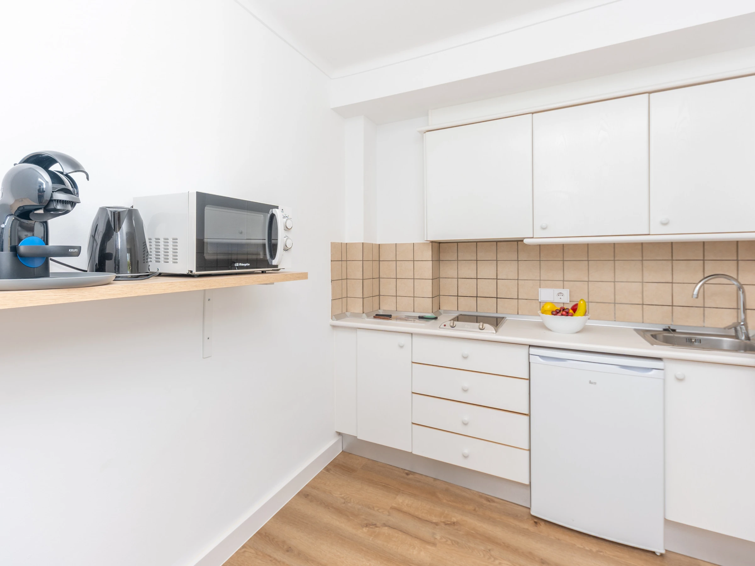 La cuisine, est équipée avec micro-ondes, congélateur et cafetière.