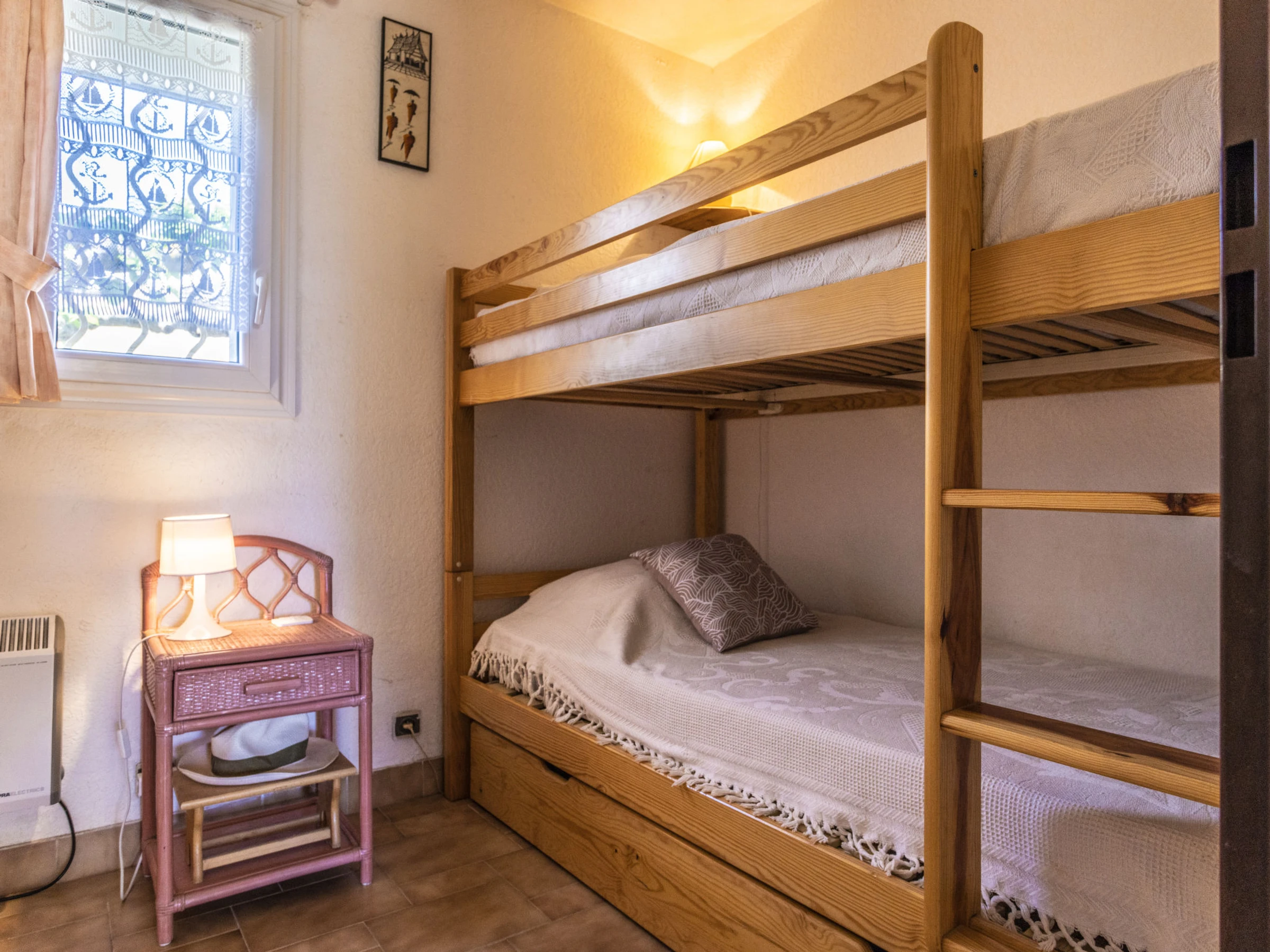 Apt 3 pièces 50 m2, au rez-de-chaussée. Aménagement fonctionnel et confortable: séjour/salle à manger avec 1 divan-lit double (140 cm, longueur 190 cm), TV (écran plat). Sortie sur la terrasse, orientée sud et orientée ouest. 1 chambre avec 1 lit double (190 cm, longueur 190 cm). 1 chambre d'enfants avec 1 x 2 lits superposés (90 cm, longueur 190 cm). Cuisine ouverte (4 plaques de cuisson, lave-vaisselle, micro-ondes, cafetière électrique). Douche, WC séparé. Grande terrasse 30 m2, situation sud et situation ouest. Meubles de terrasse. A disposition: lave-linge. Internet (Connexion WIFI, en sus). Place de parking No 41. Adapté(e) aux familles. Annonce d'un particulier (art 155, IV du CGI).